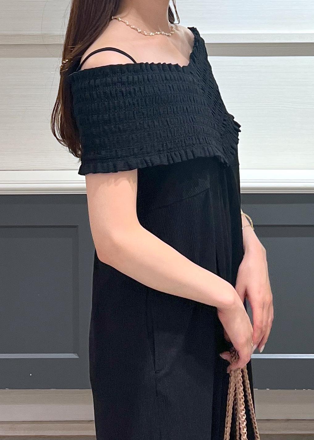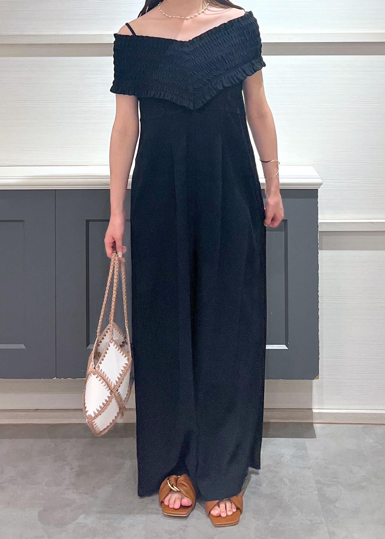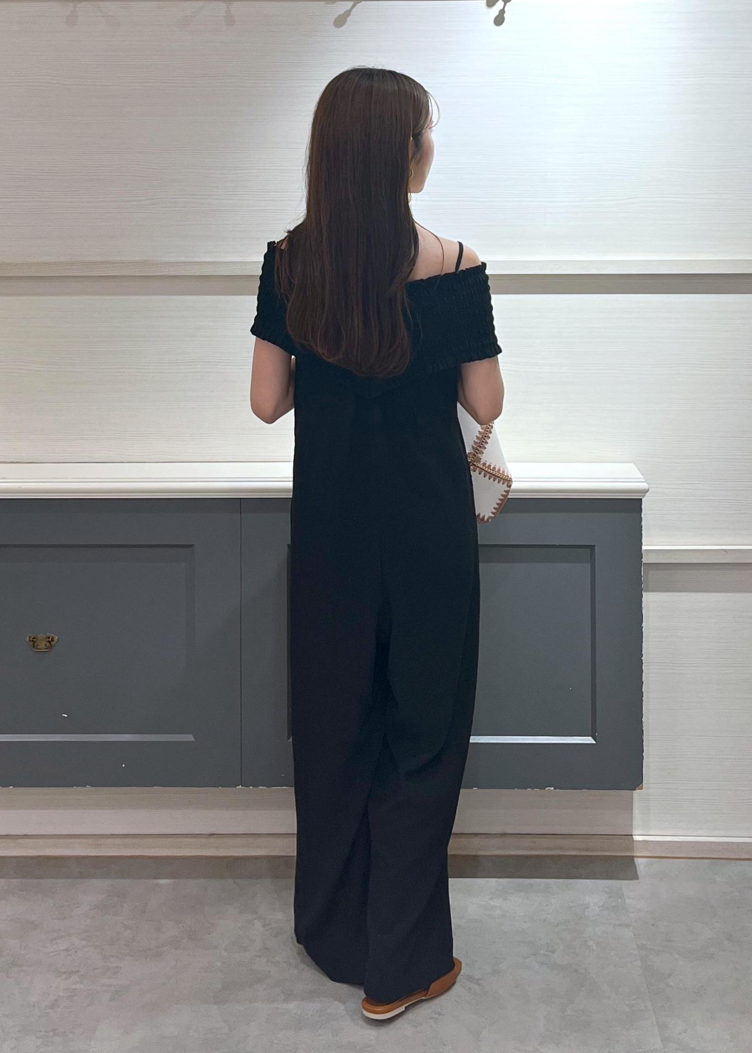 アウトレットVISシャーリングオフショルダーオールインワンブラック / F¥6,327レビュー156cmでヒールなしでもギリギリ擦らない丈感でした!