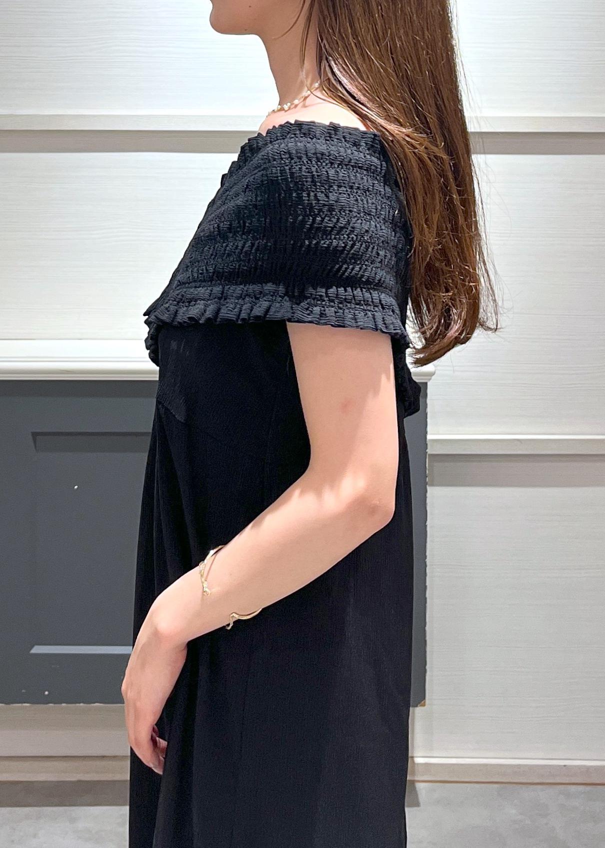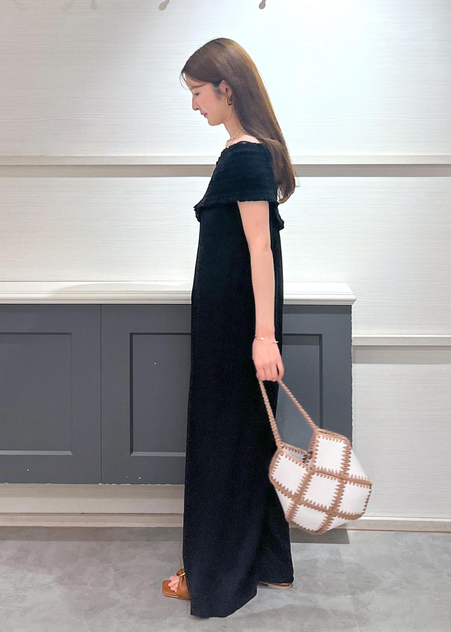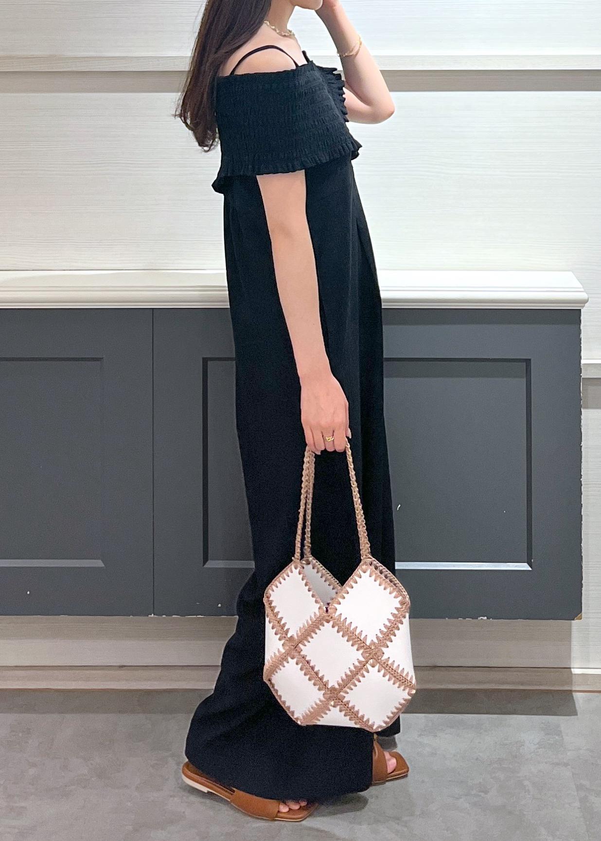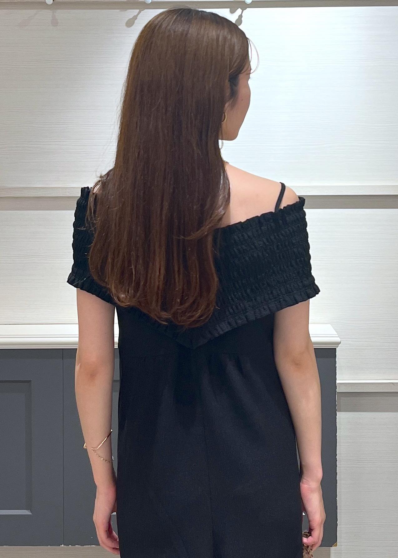 アウトレットVISシャーリングオフショルダーオールインワンブラック / F¥6,327レビュー156cmでヒールなしでもギリギリ擦らない丈感でした!