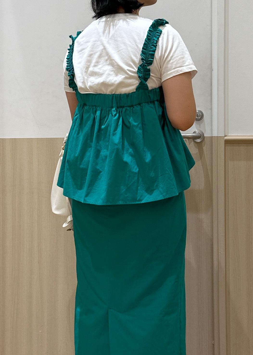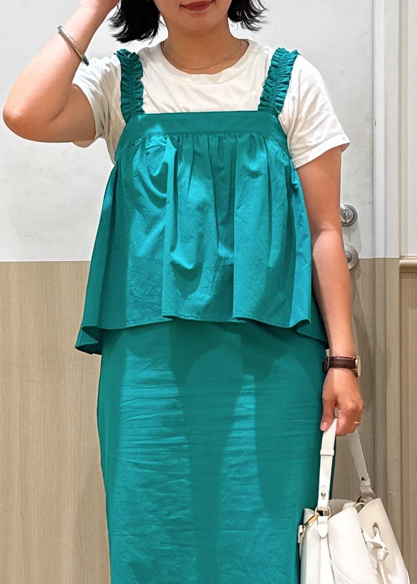 アウトレットVISレイヤード風ワンピースグリーン / F¥3,164レビュー158センチ、フラットシューズも履ける丈感でした!