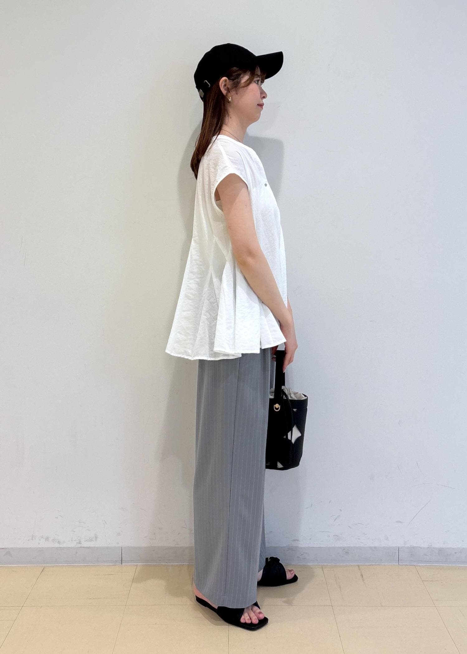 ストライプのパンツで少し柄を足してシンプルになりすぎないように意識しました。