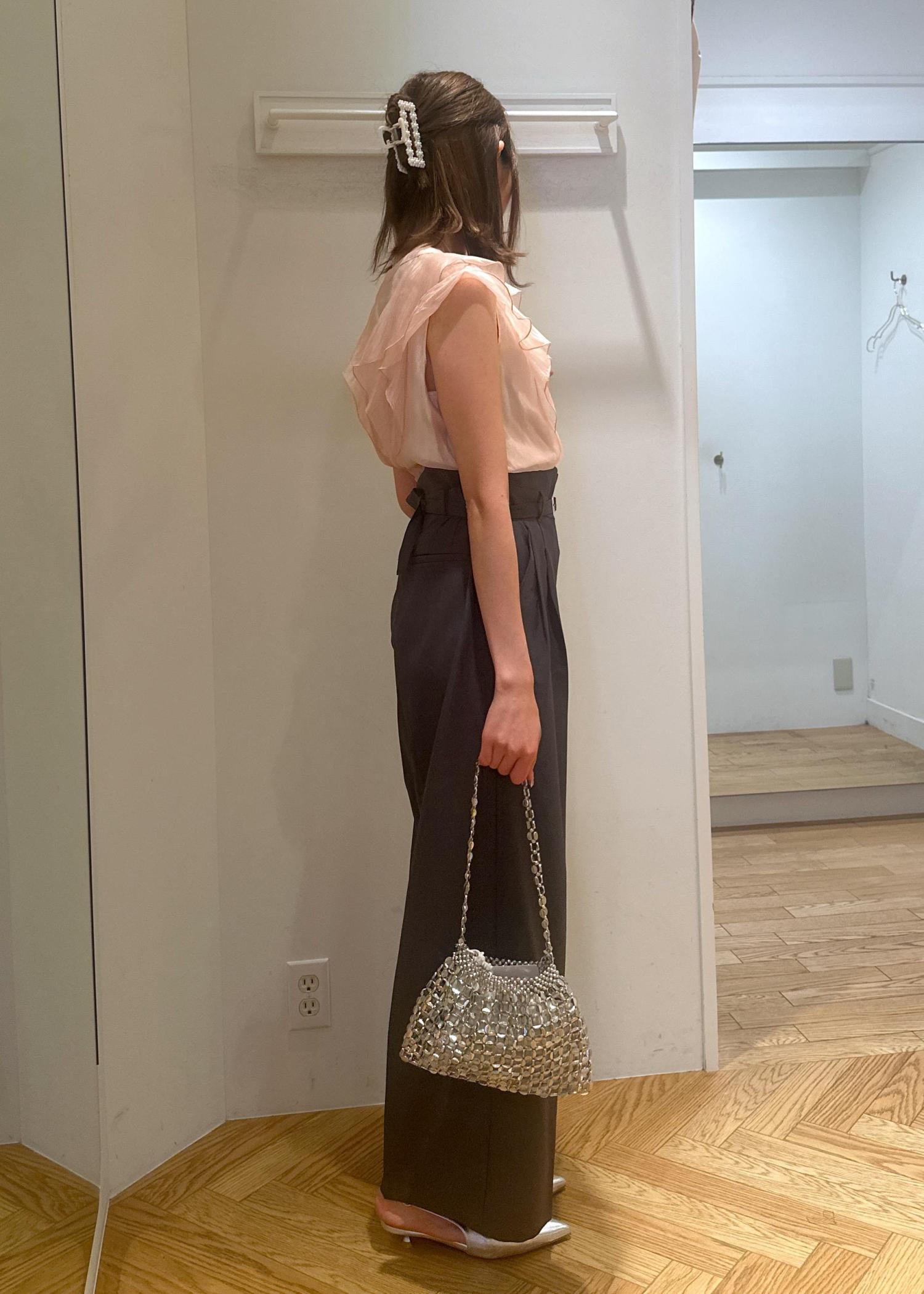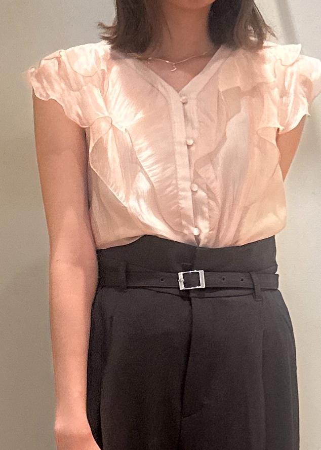 ピンクのフリルブラウスでフェミニンさを演出しながらも、光沢のある素材で甘すぎない上品な印象に。