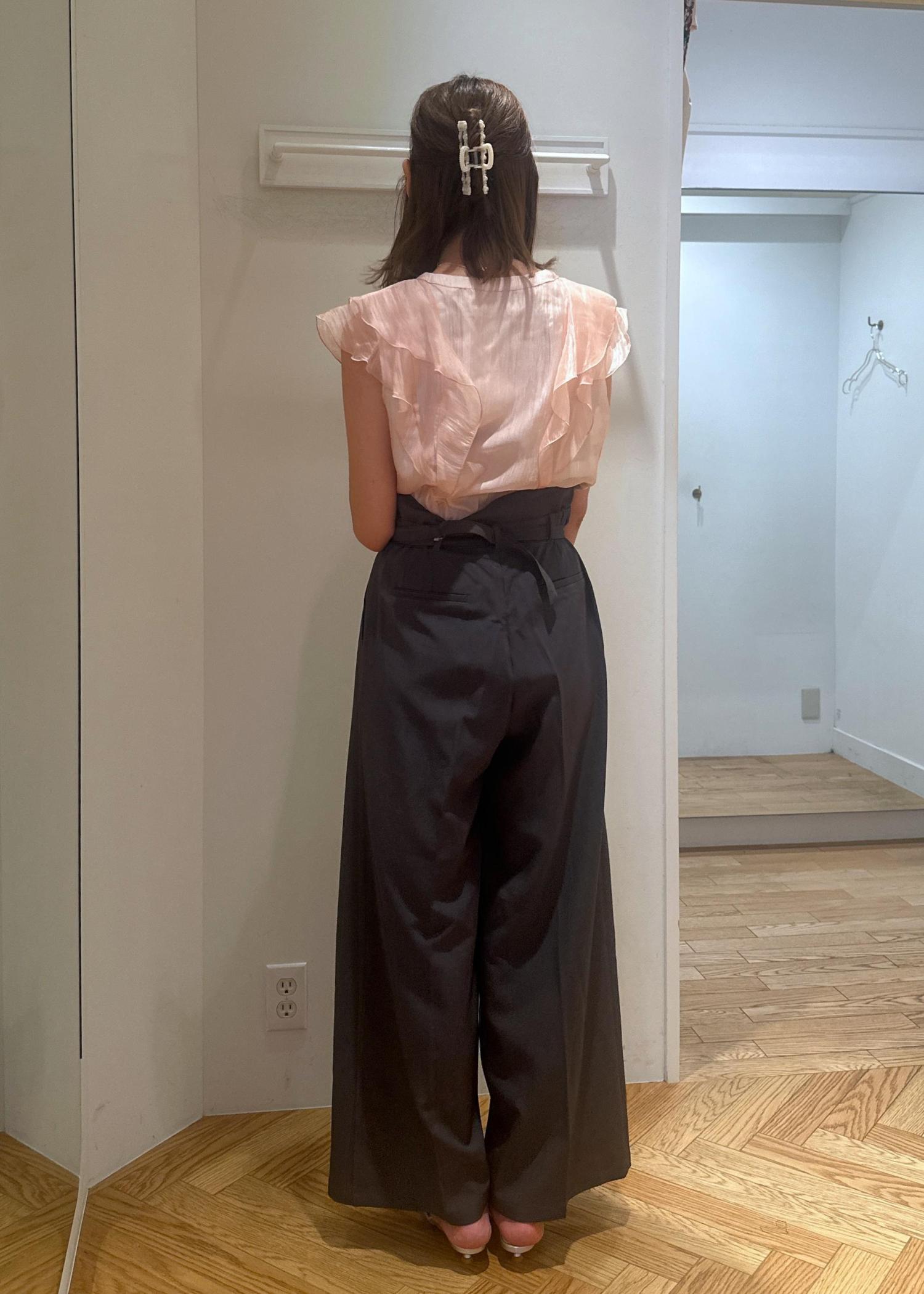 タックの入ったパンツを合わせると縦のラインが強調され、スタイルアップ効果も◎