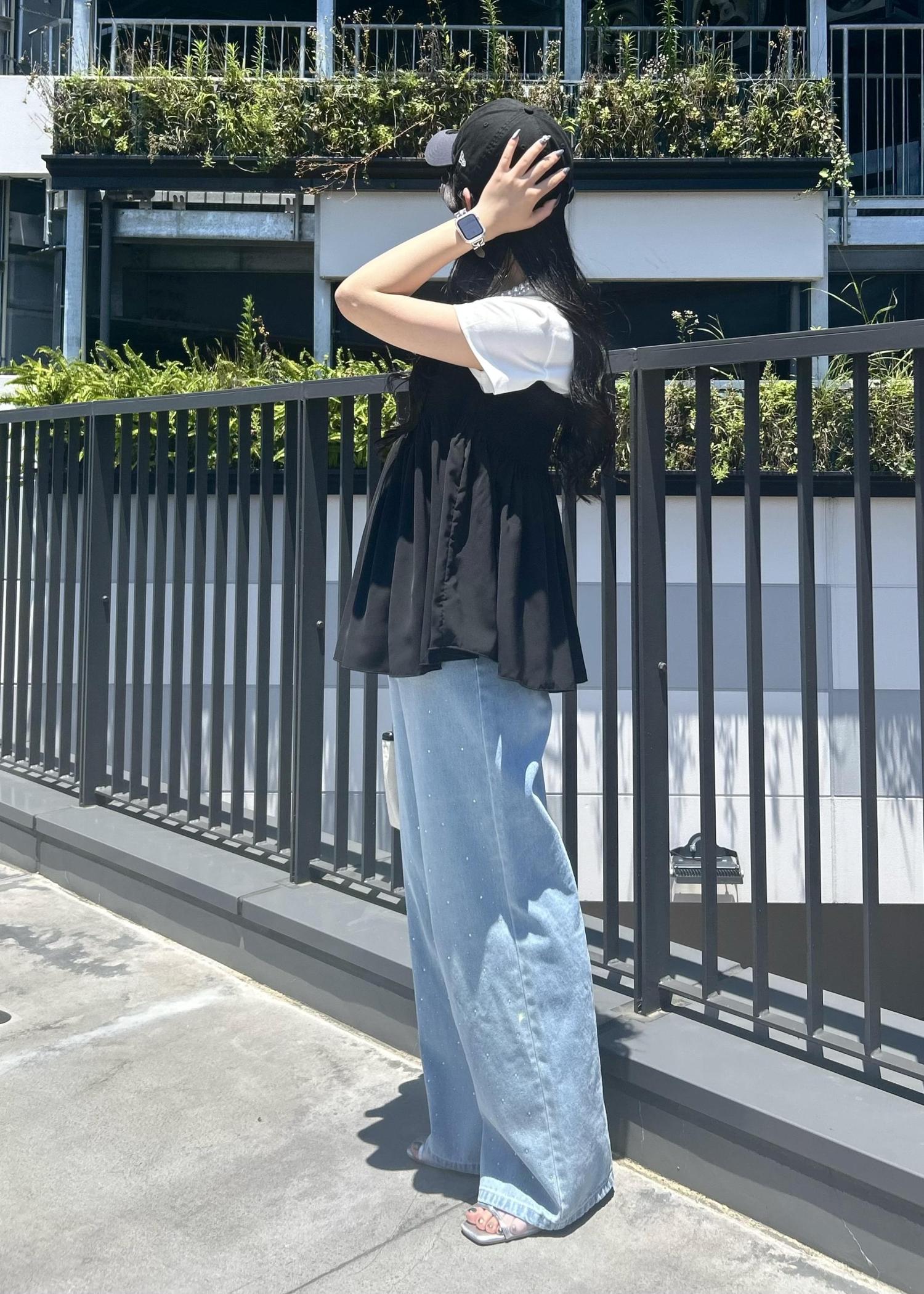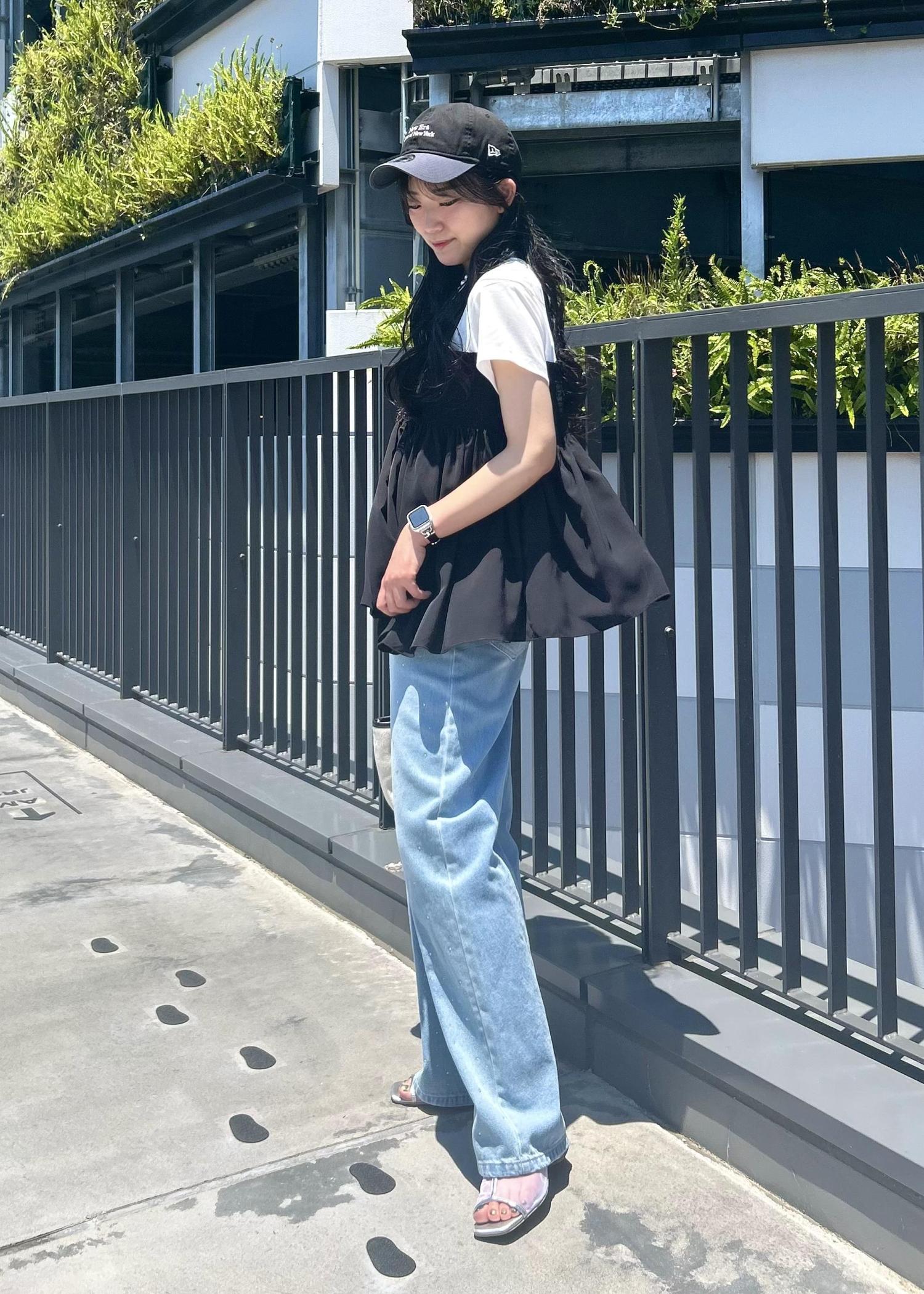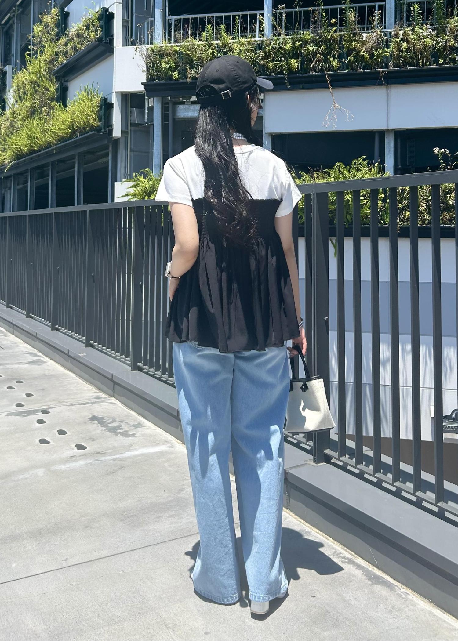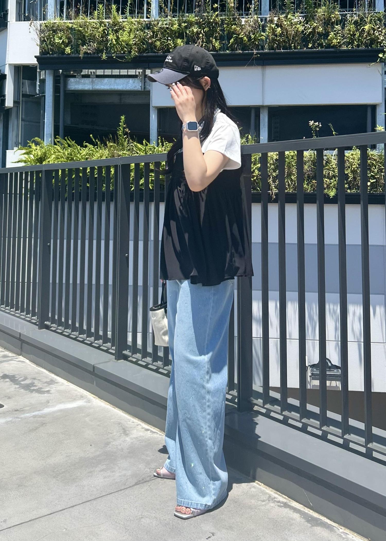 ふんわりシルエットのドッキングトップスにワイドデニムを合わせました。