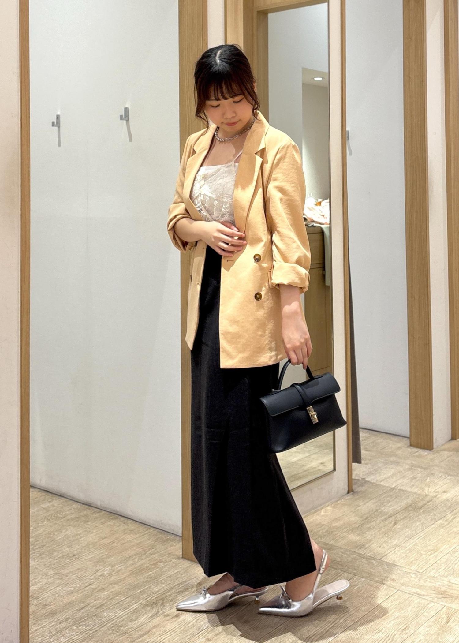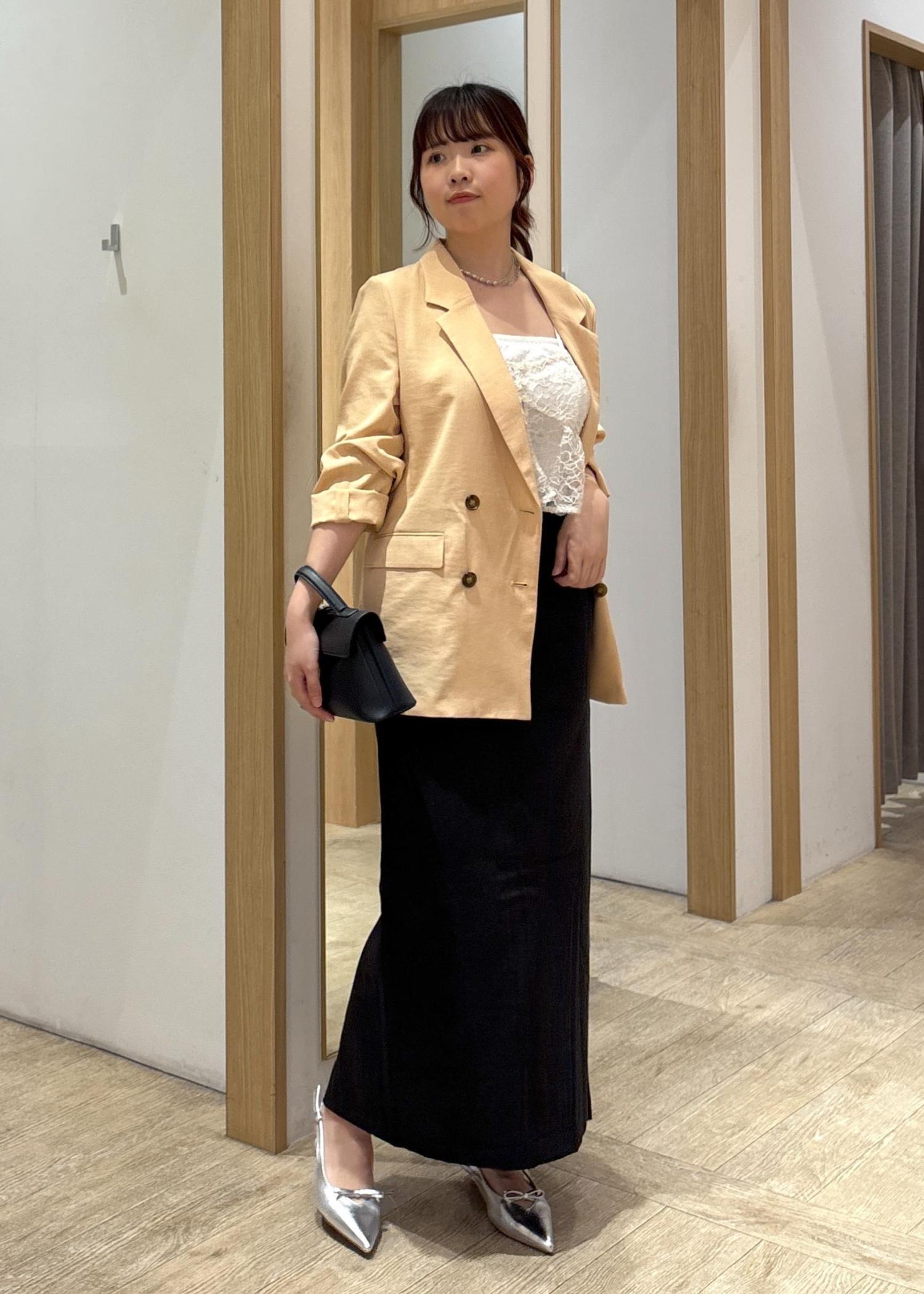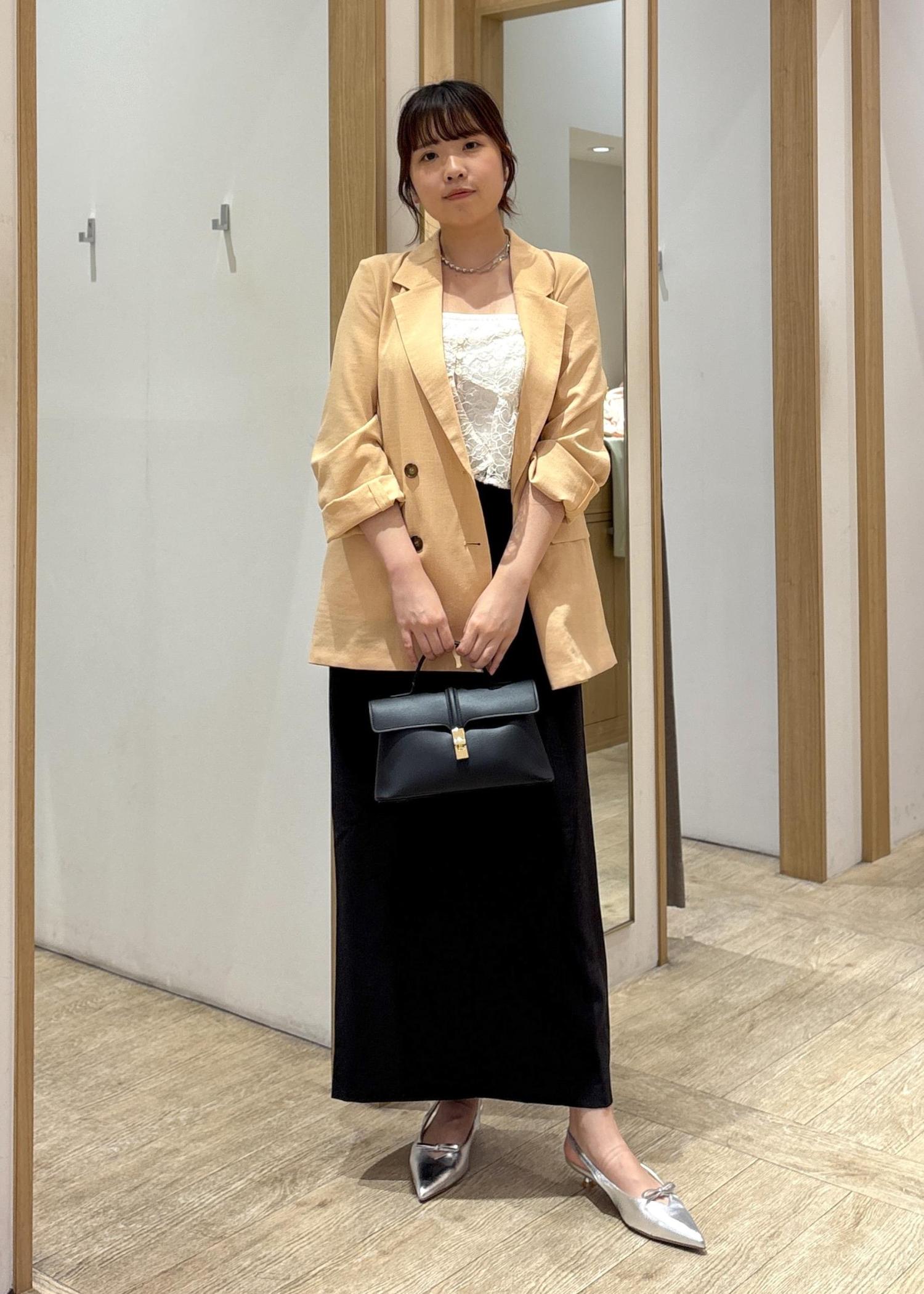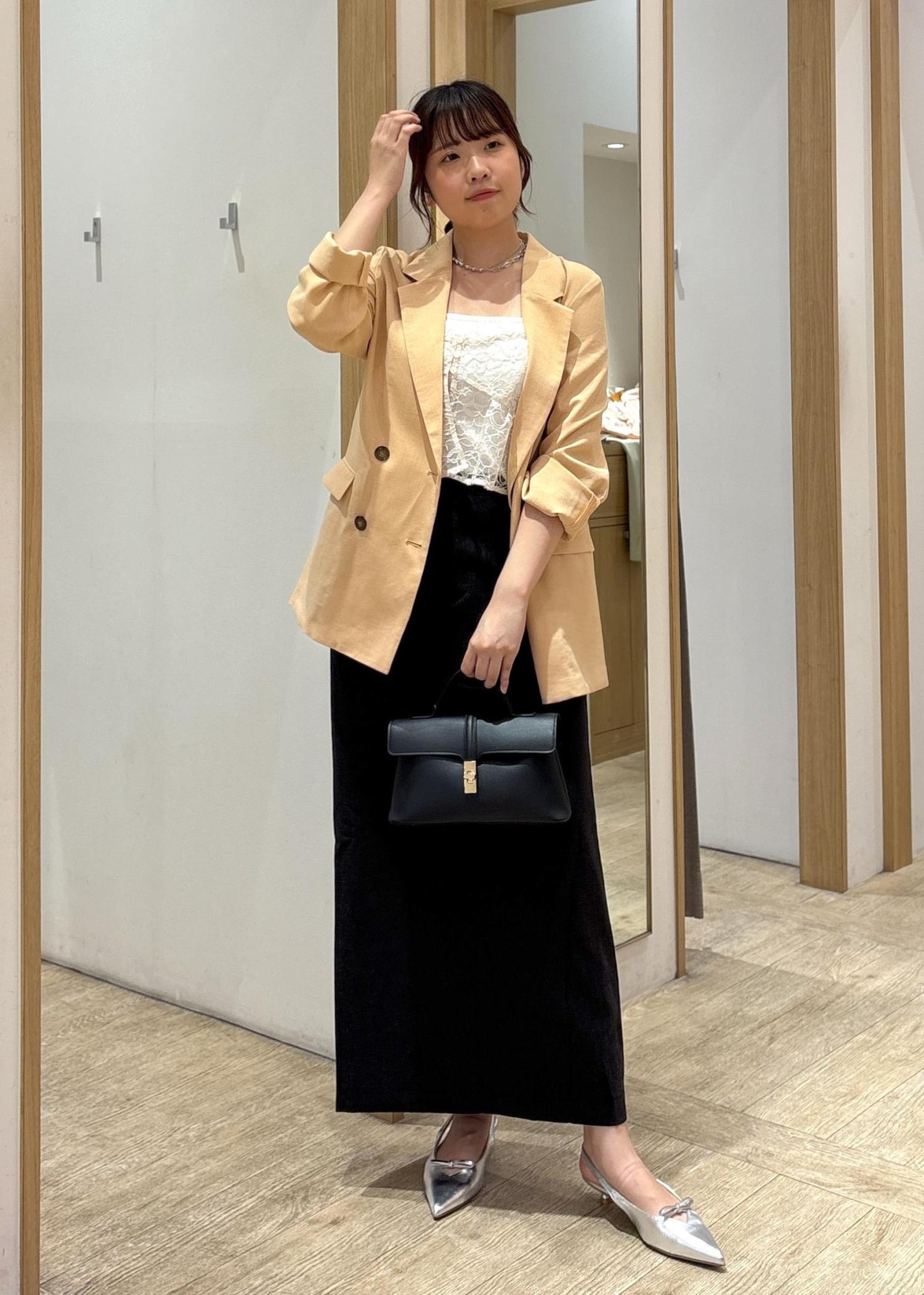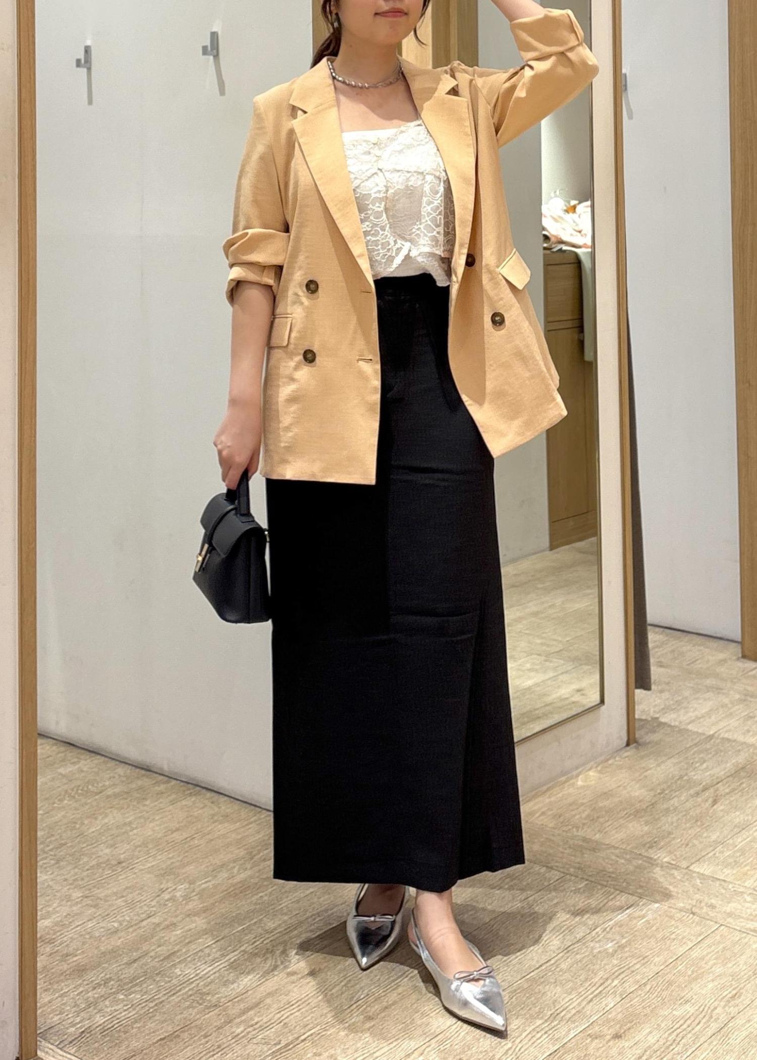 やわらかなカラーのテーラードジャケットに、繊細なレースインナーとブラックのロングスカートを合わせた、大人の上品カジュアルコーデ。