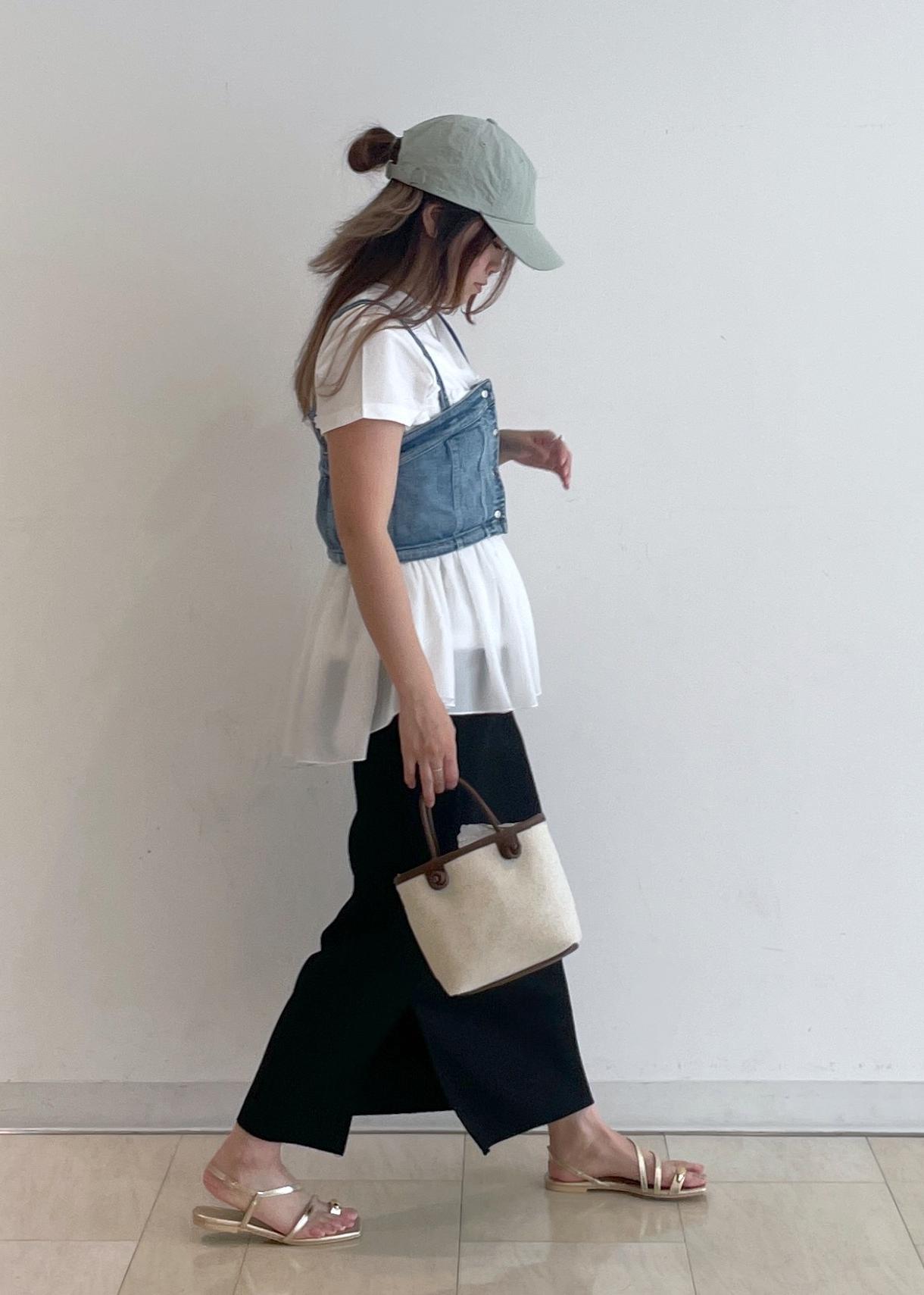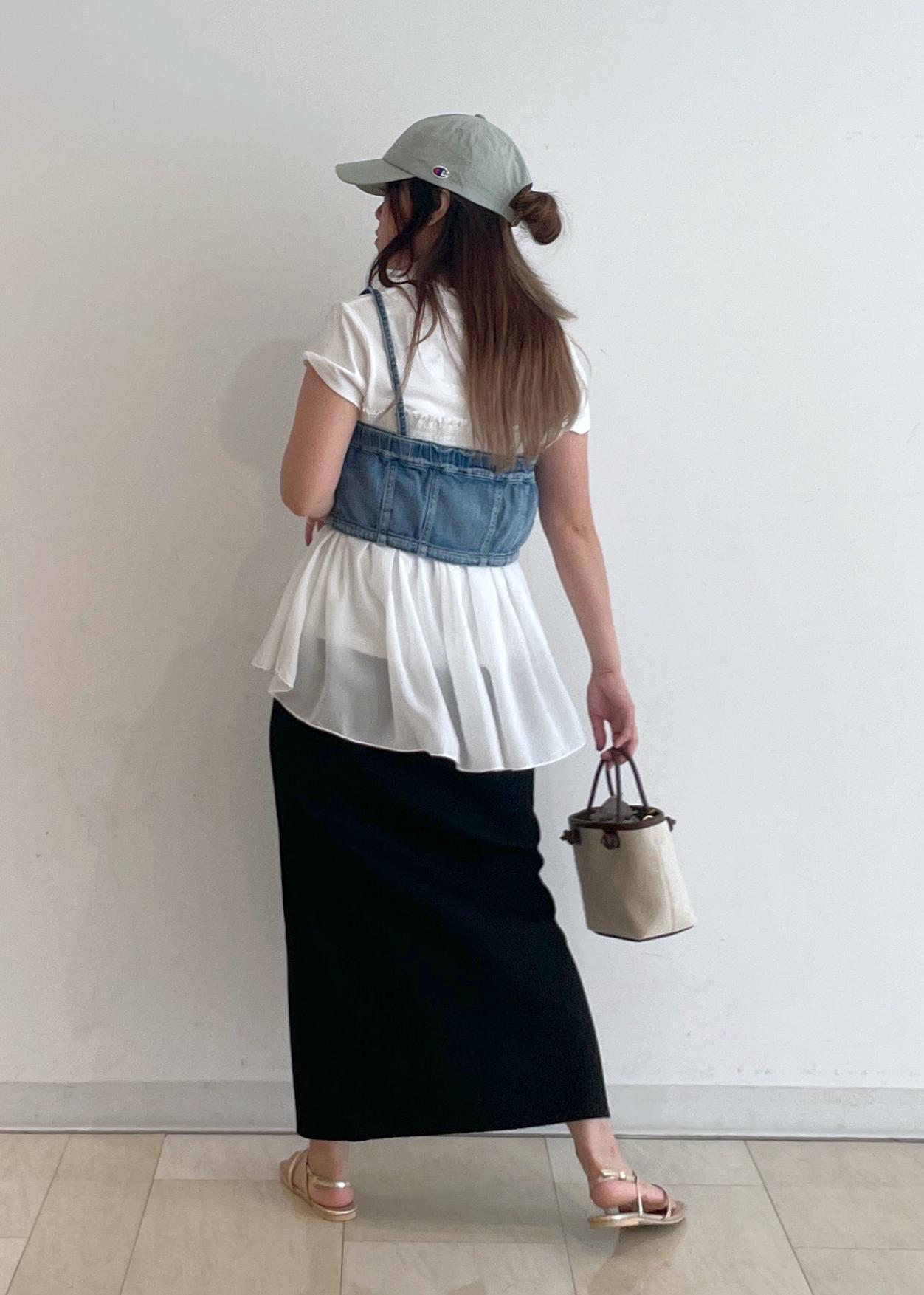 キャップ×ビスチェでアクティブさを出しつつ、黒のタイトスカート締めました!