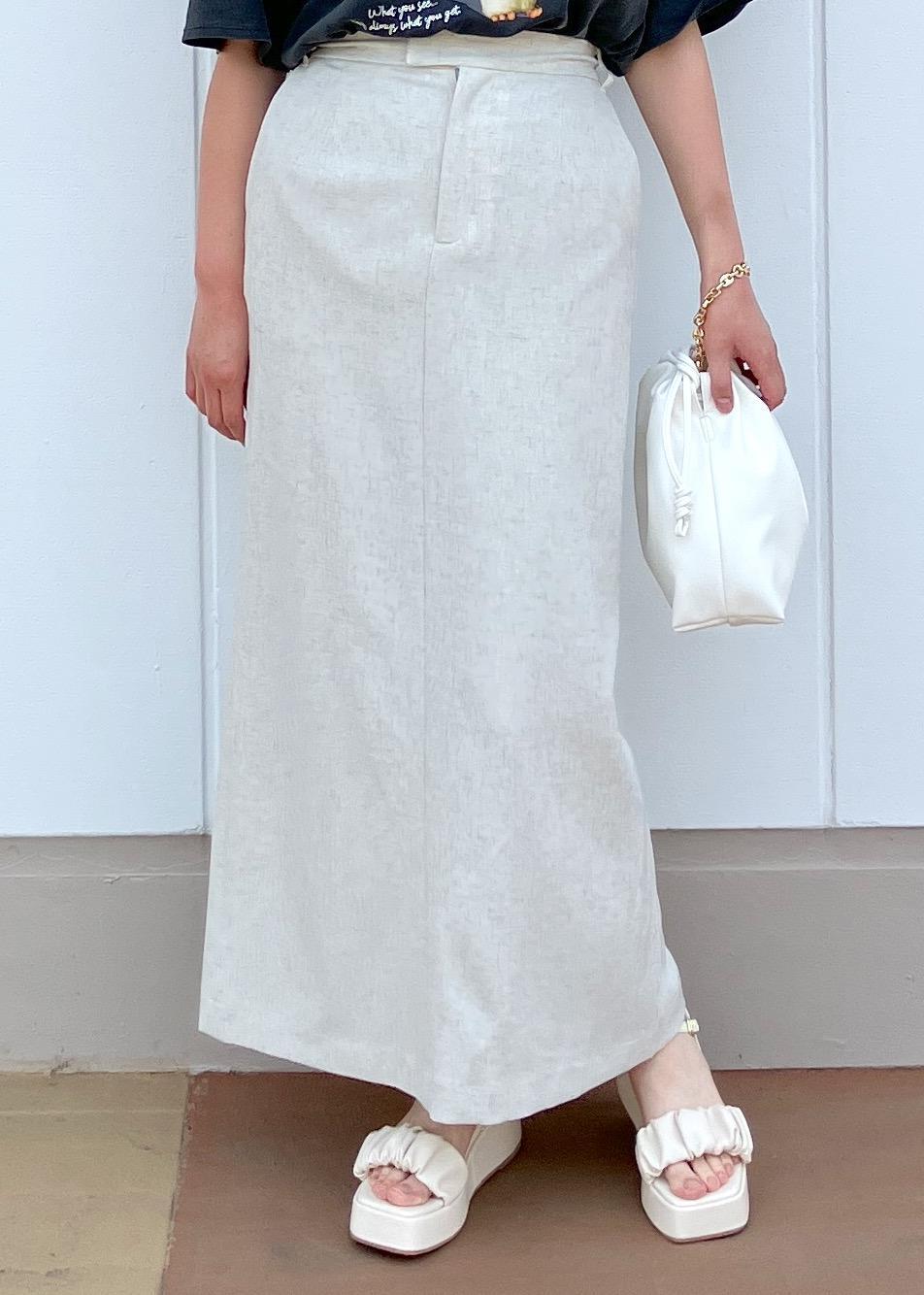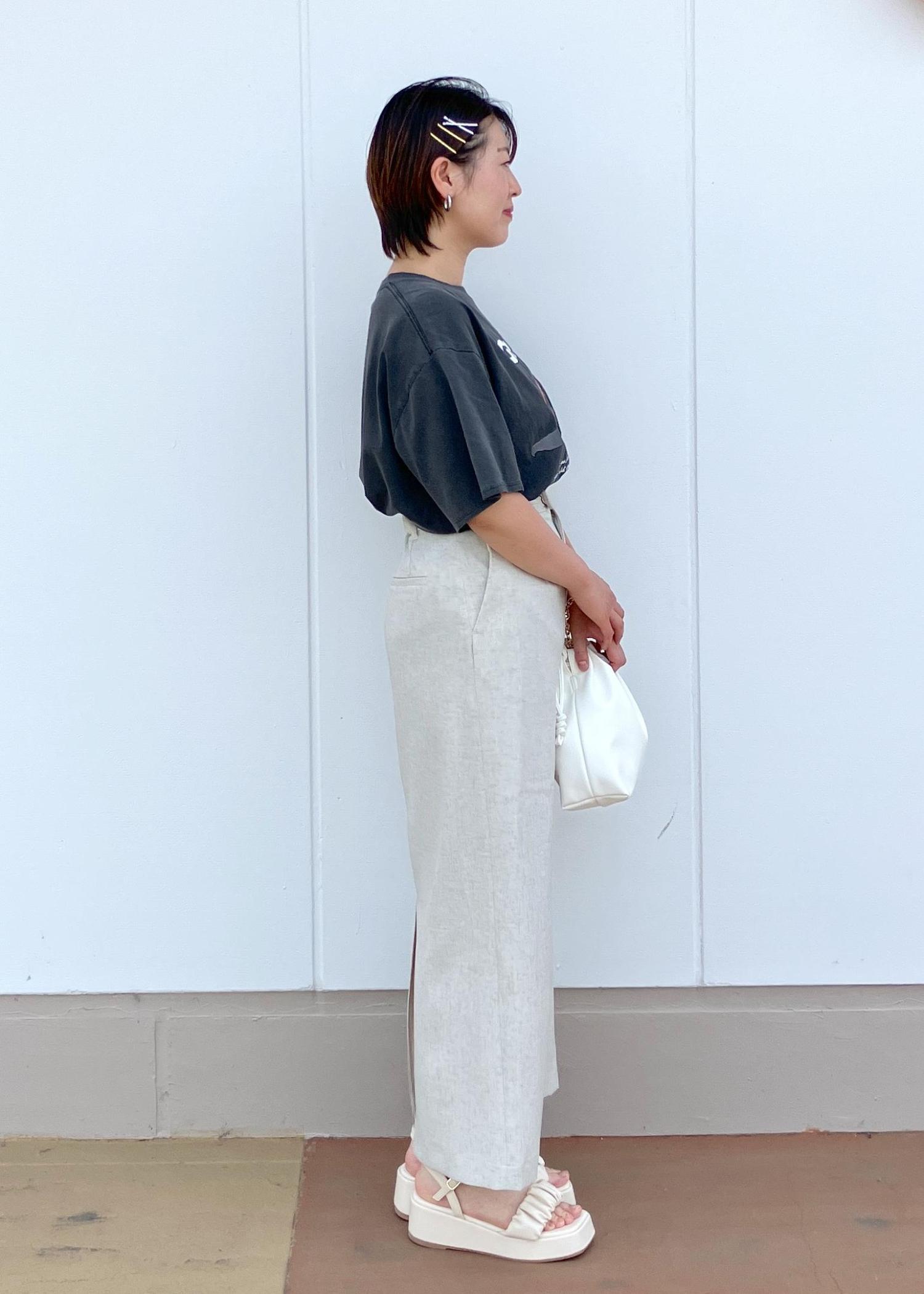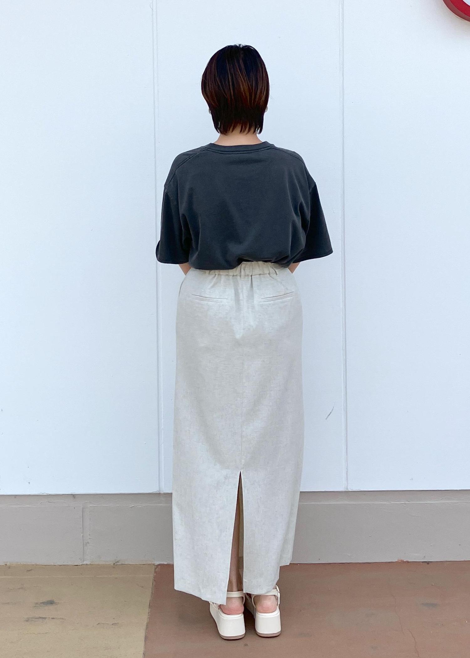 です!カジュアルな素材ですがデザインはIラインなのでスタイリッシュで綺麗めな印象に!ウエストにゴムが入っているのでリラックスして着用できます!後ろのスリットが深めで歩きやすいです! -