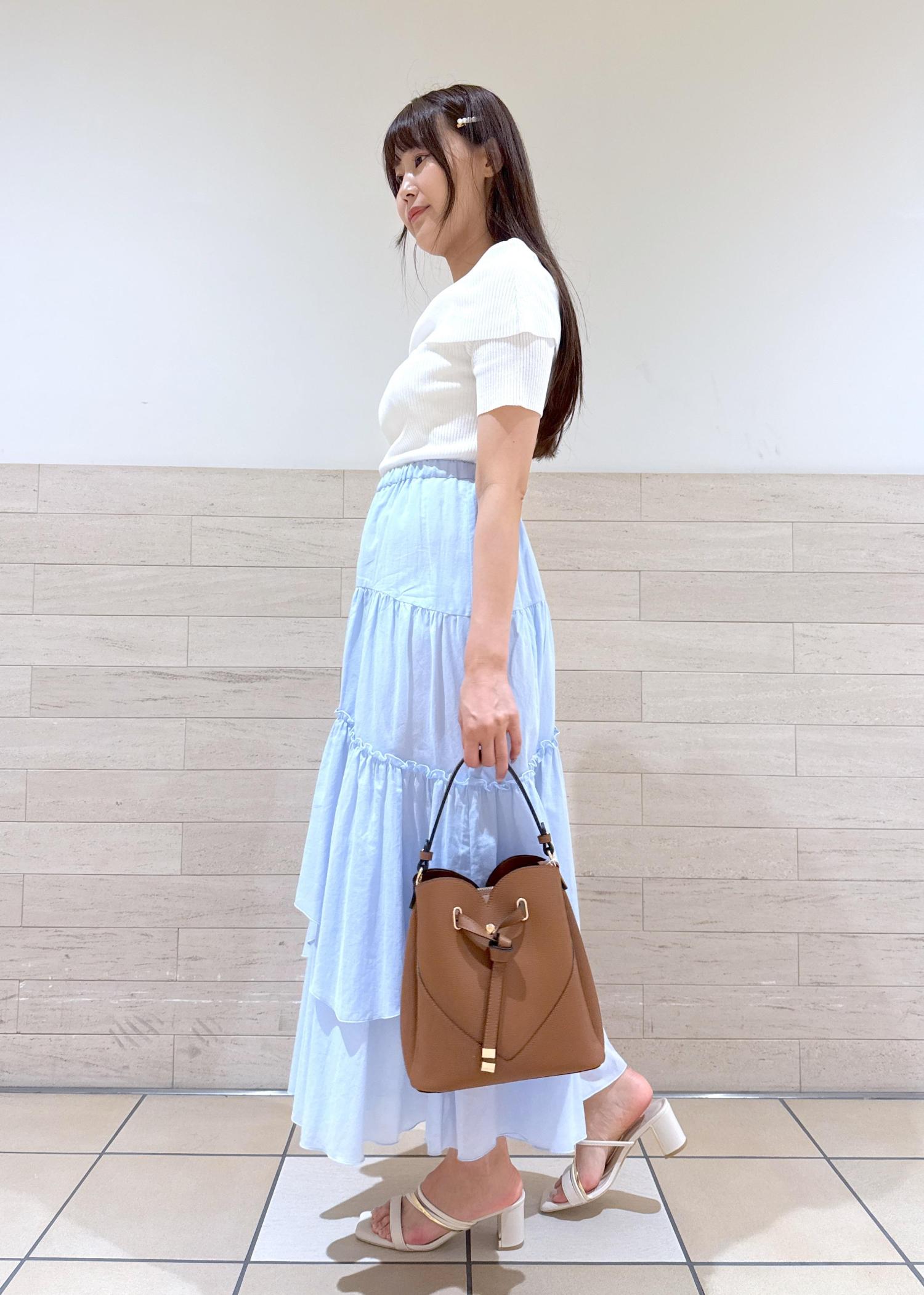 オフショルニットで大人っぽさをプラス。ブルーが爽やかティアードスカートを合わせて大人きれいめコーデに仕上げました。