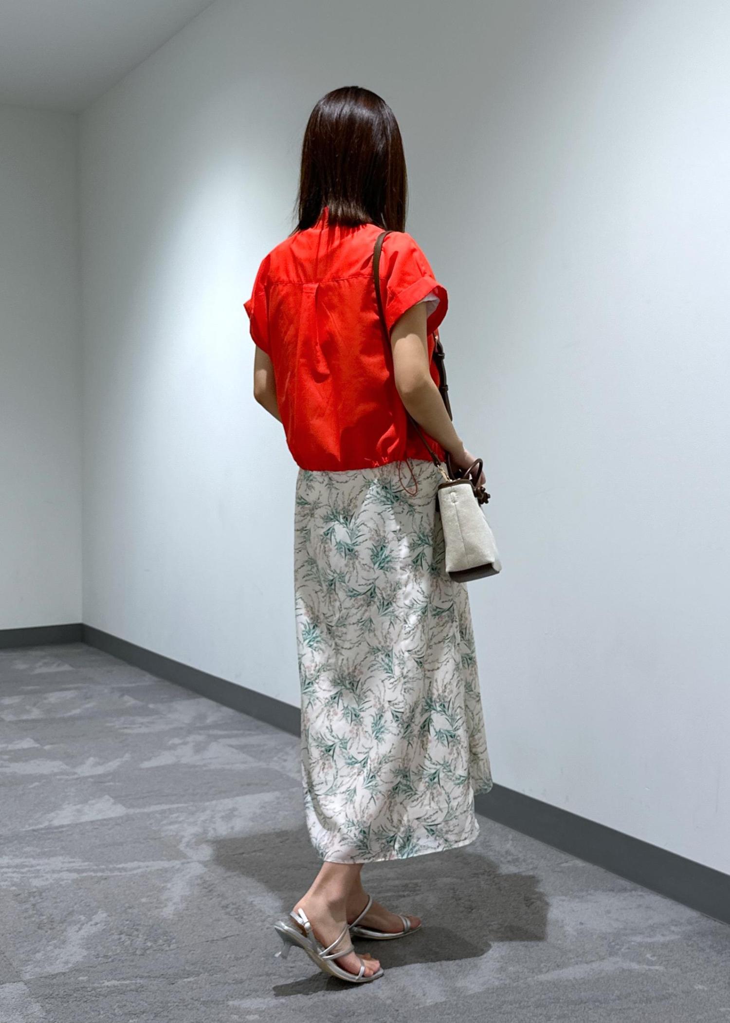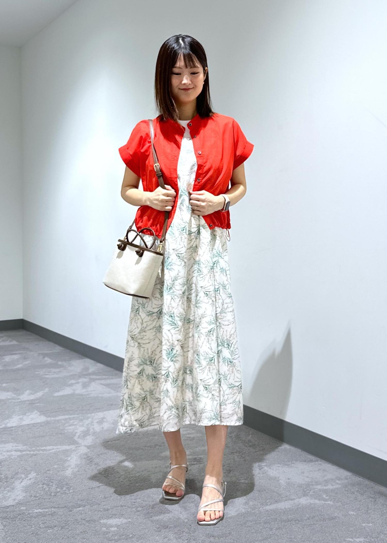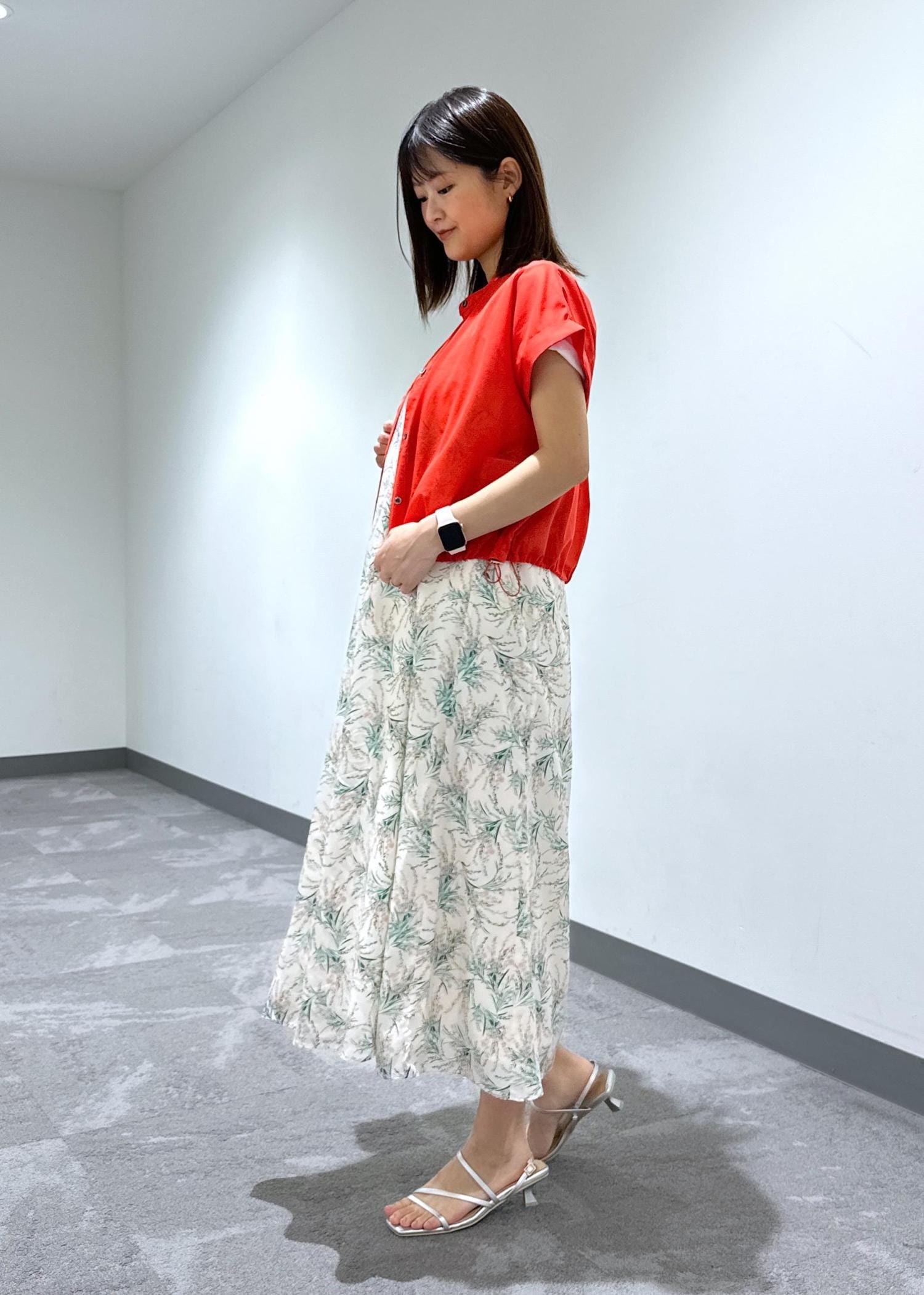明るいオレンジカラーのシアーシャツにガーデンフラワーのキャミワンピースを合わせて夏らしいお出かけコーデを組んでみました。