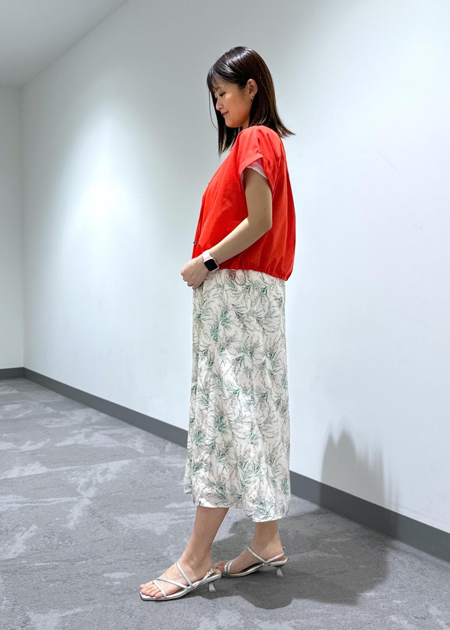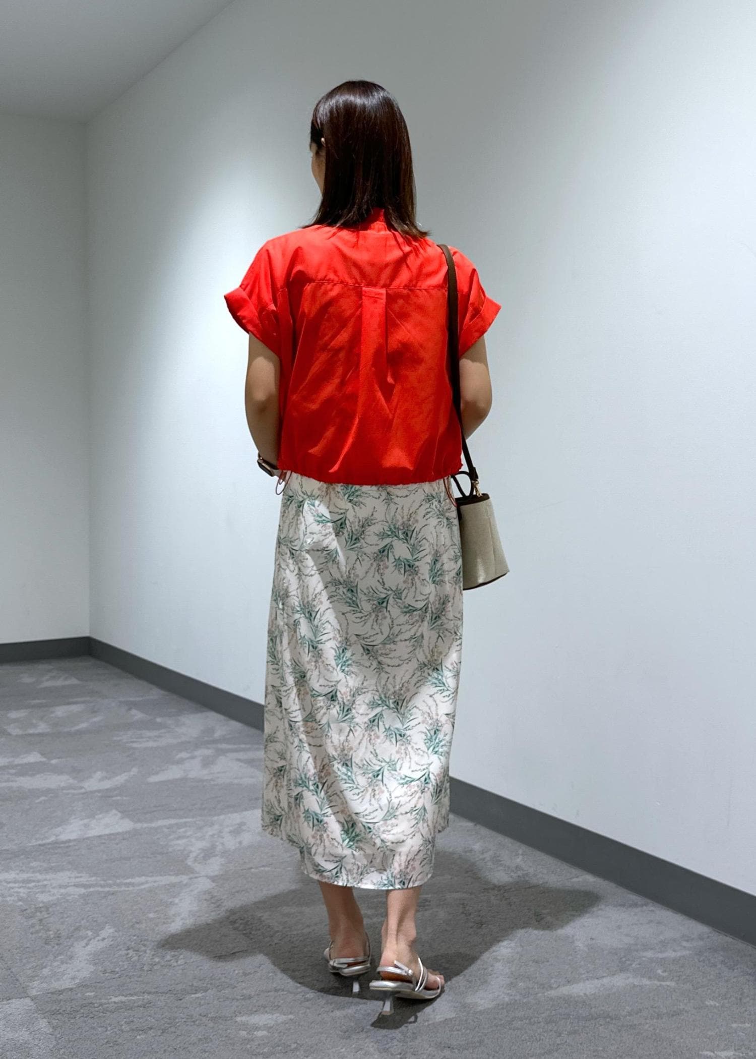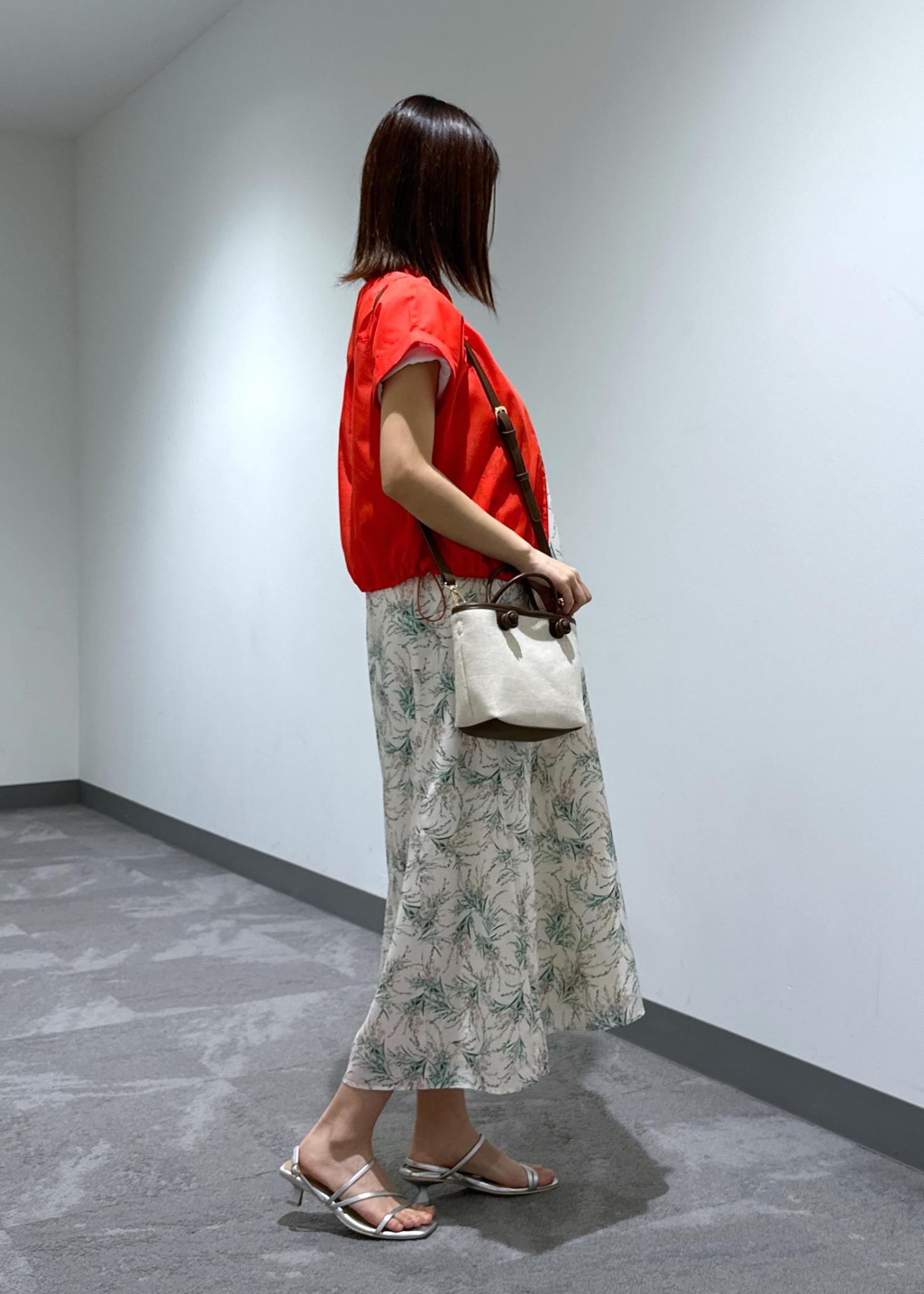 明るいオレンジカラーのシアーシャツにガーデンフラワーのキャミワンピースを合わせて夏らしいお出かけコーデを組んでみました。