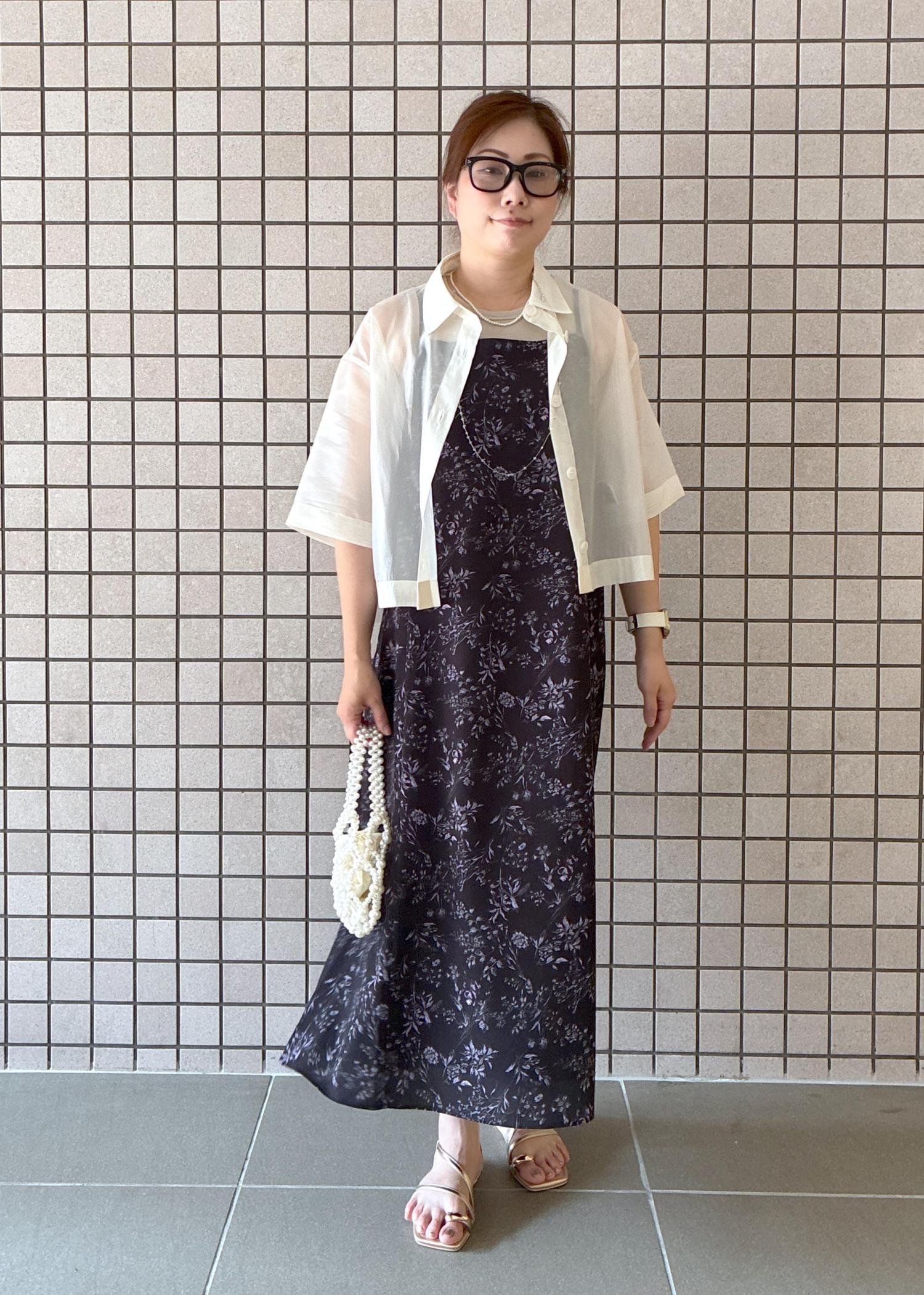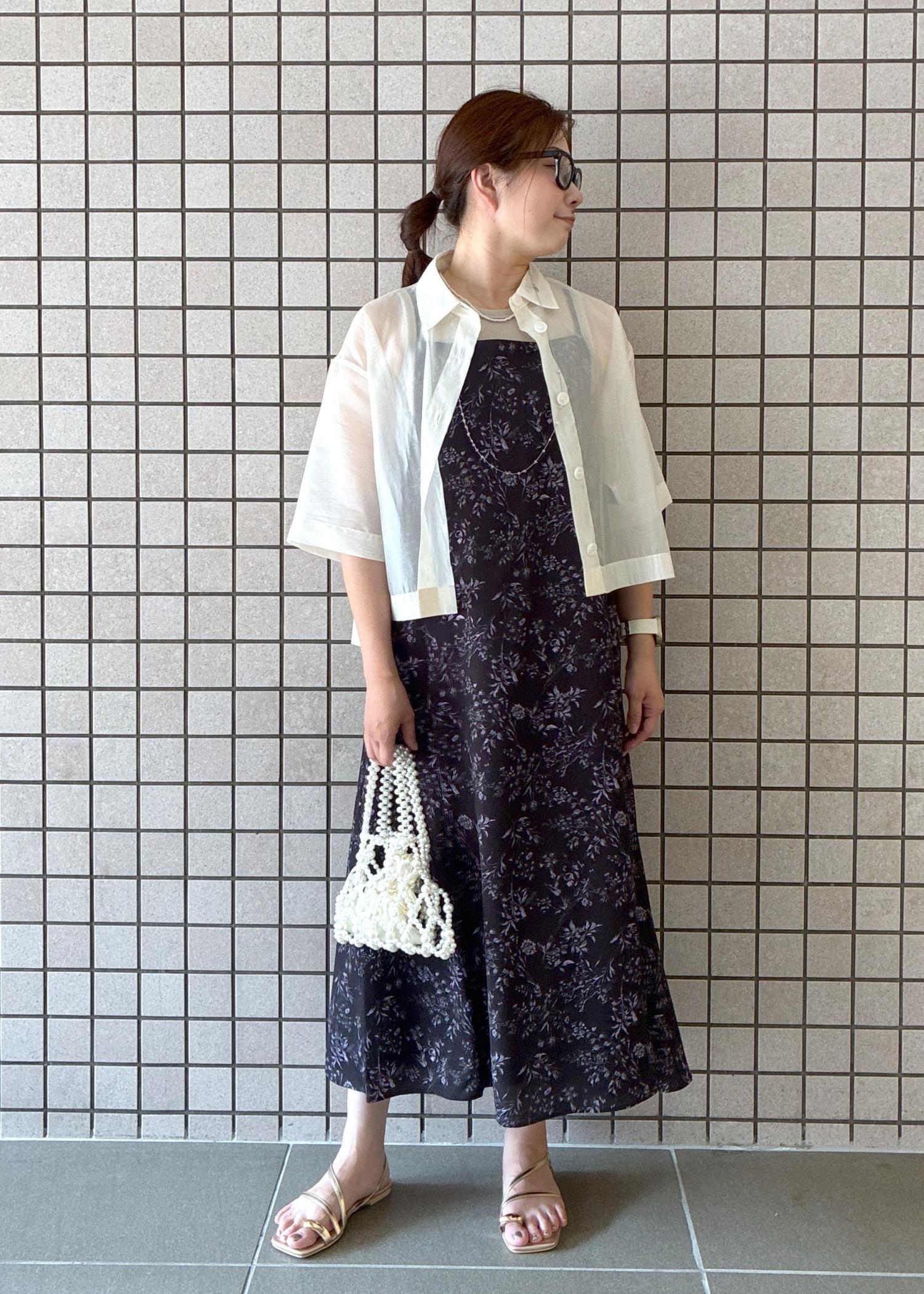 ワンピースが暗めだったので、小物は明るい色味を合わせて夏でも着れるスタイリングにしました!