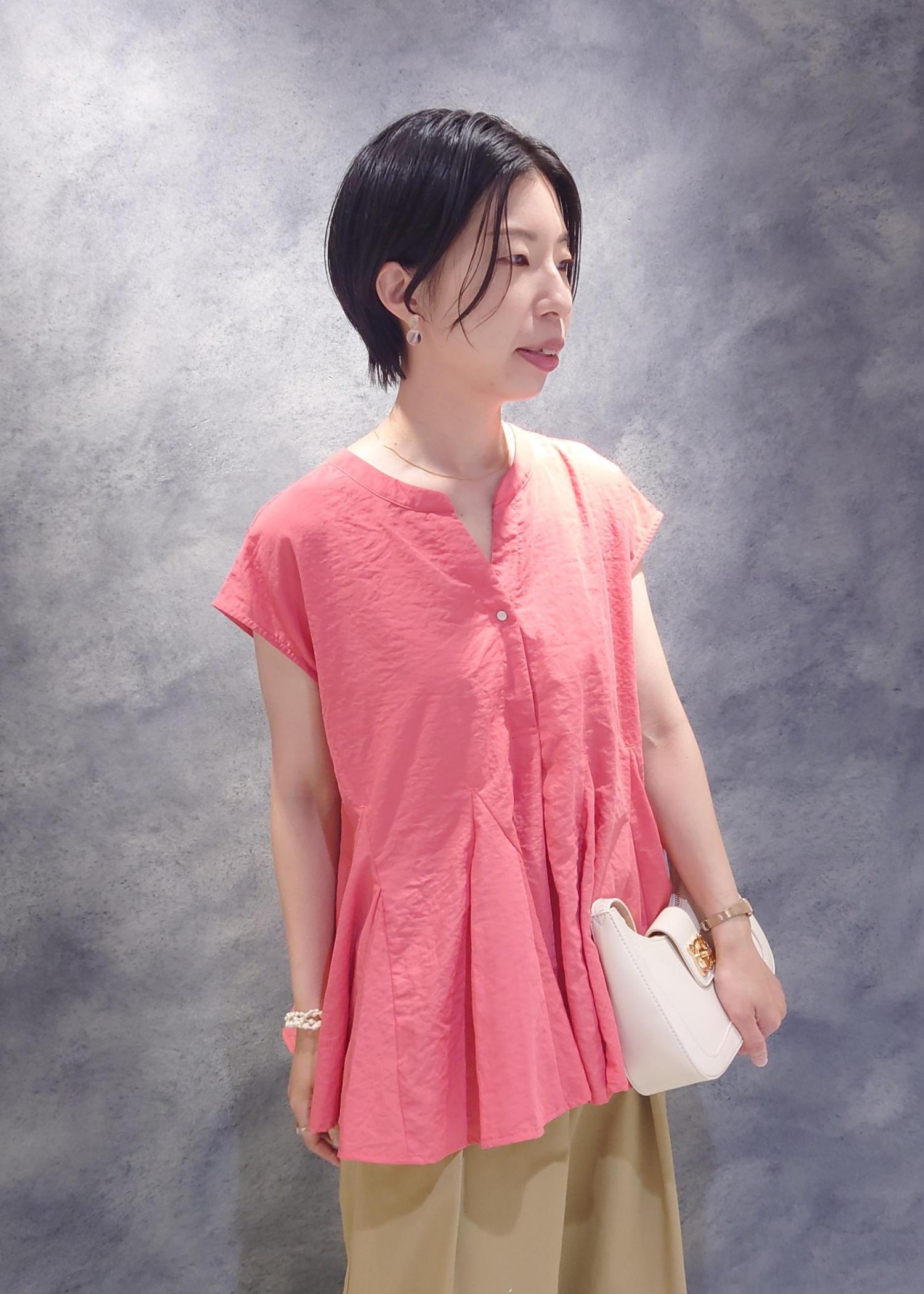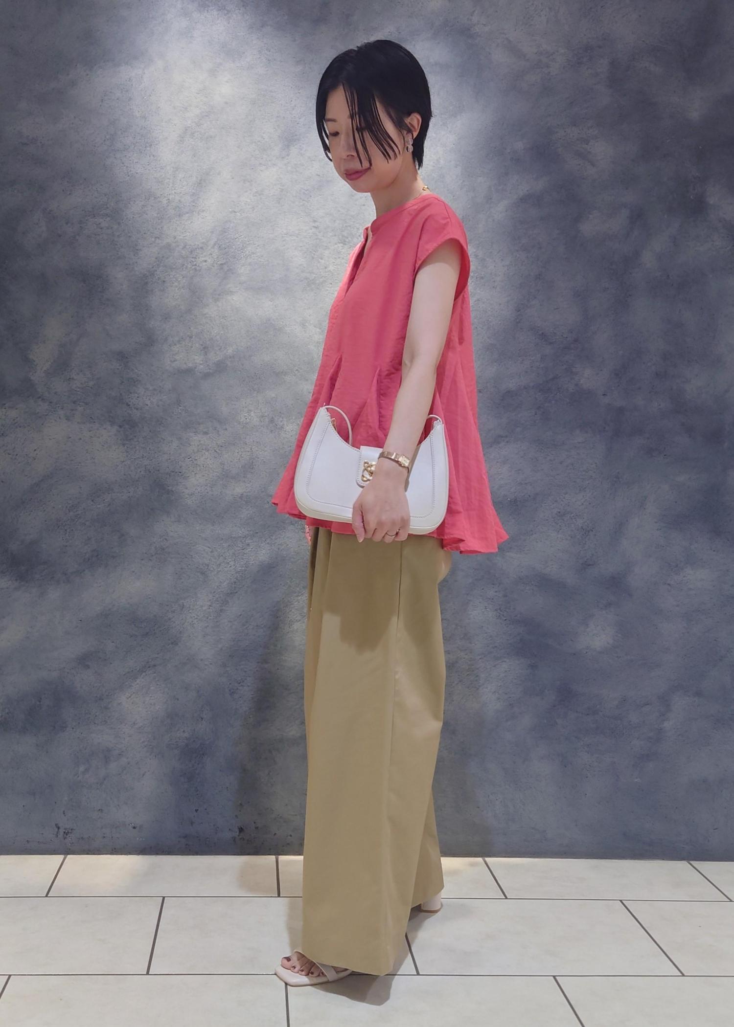 鮮やかなカラーのブラウスで夏らしいコーディネートにしました。
