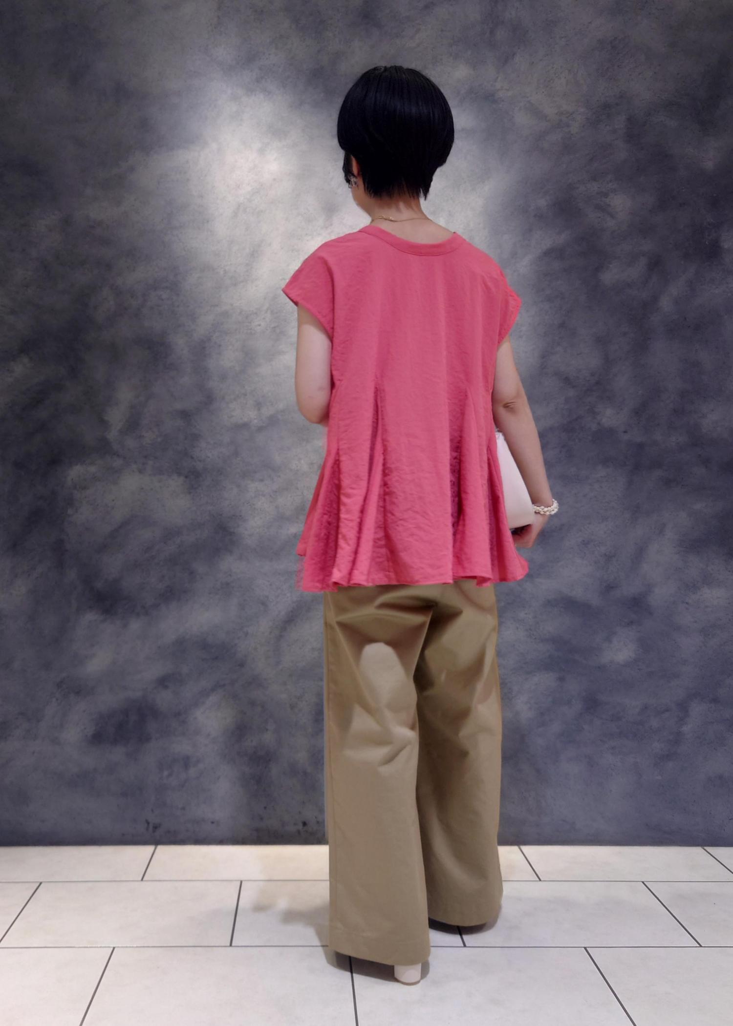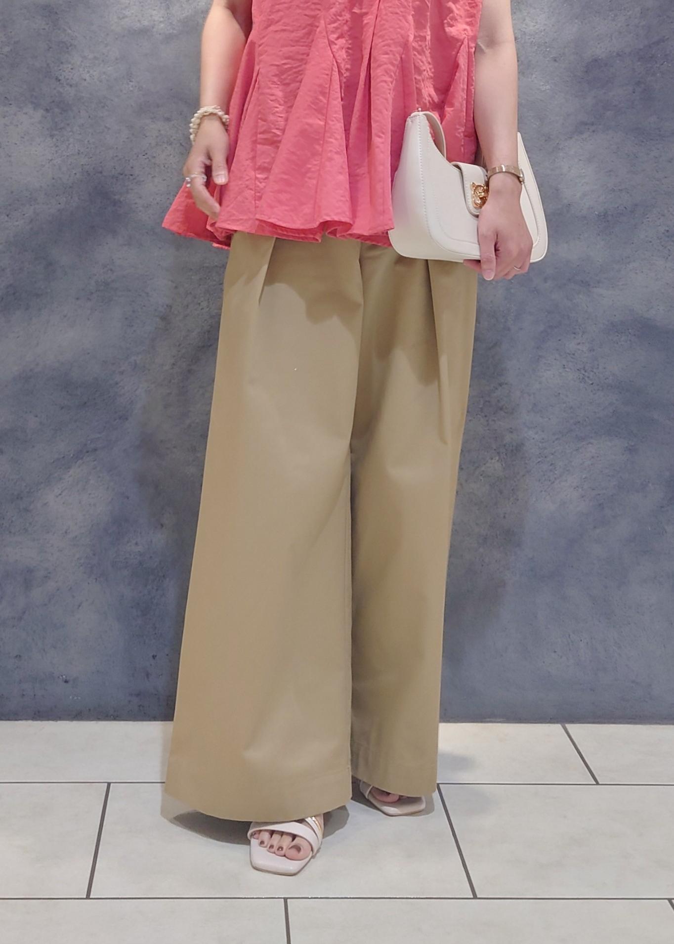 ウエストのタックが内向きになっていて、自然に裾広がりのシルエットになるので脚長効果があります。