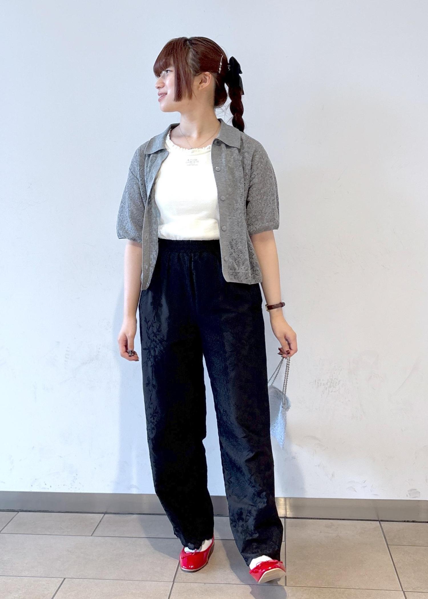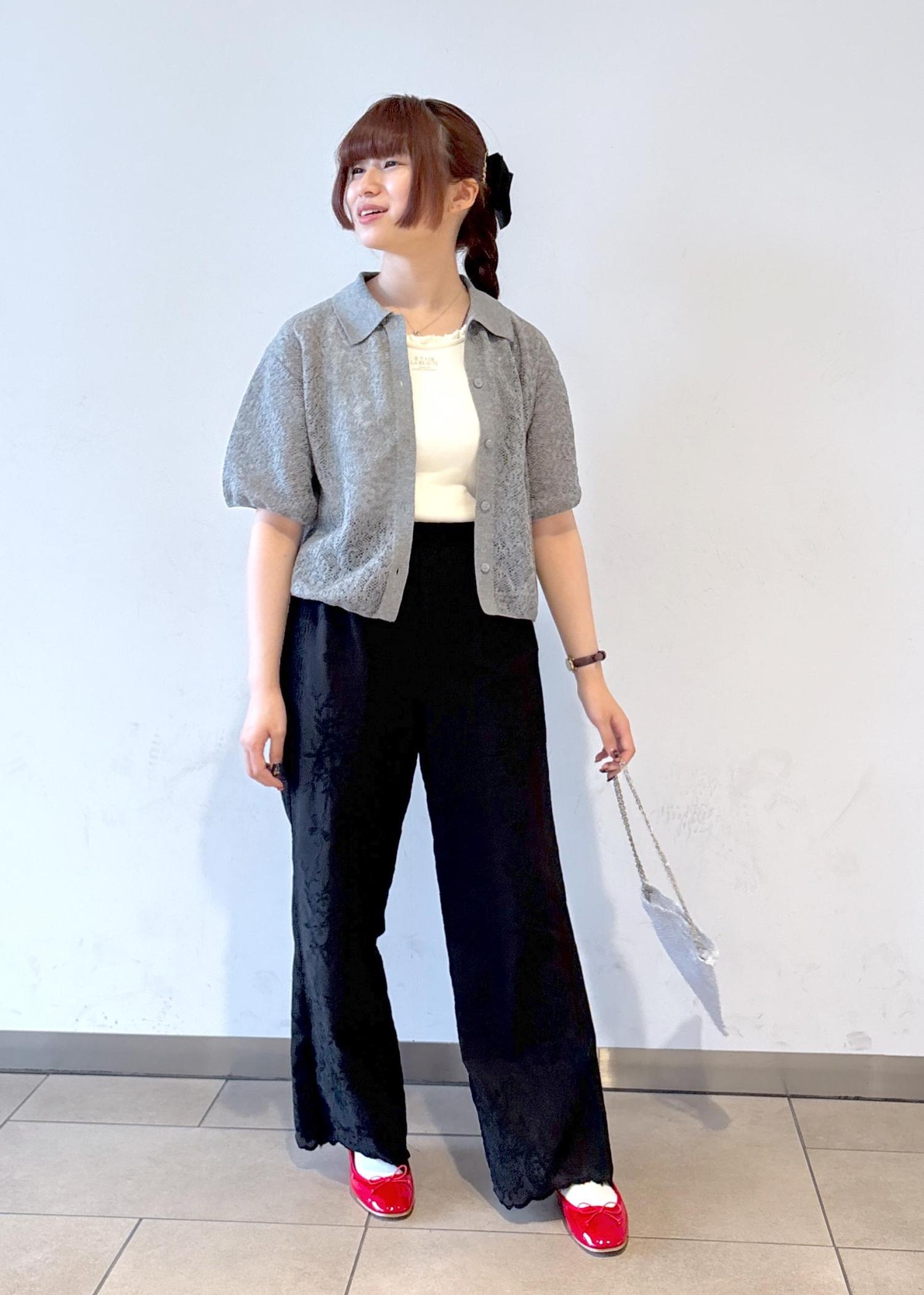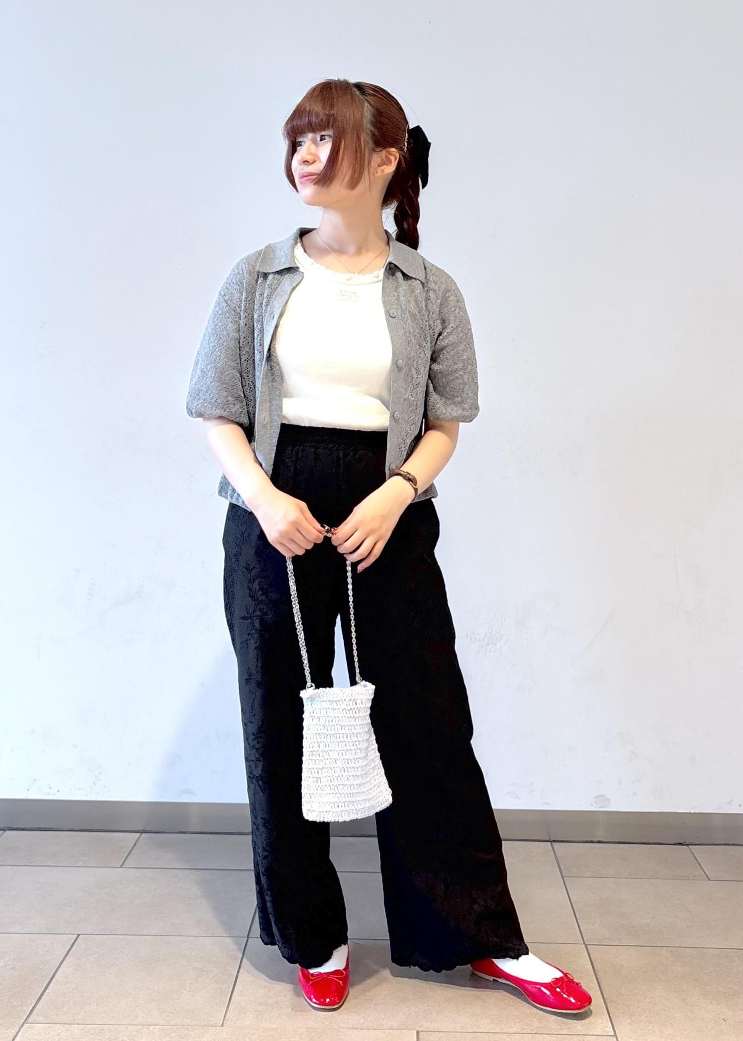 刺繍のパンツとレースのカーディガンで甘すぎずにカジュアルな印象を演出できるコーデにしました。刺繍とレースはデザインがきちんと違うので派手になり過ぎずに上品なコーデになります。ワンポイントで赤のパンプスを入れて足元を明るくさせました。