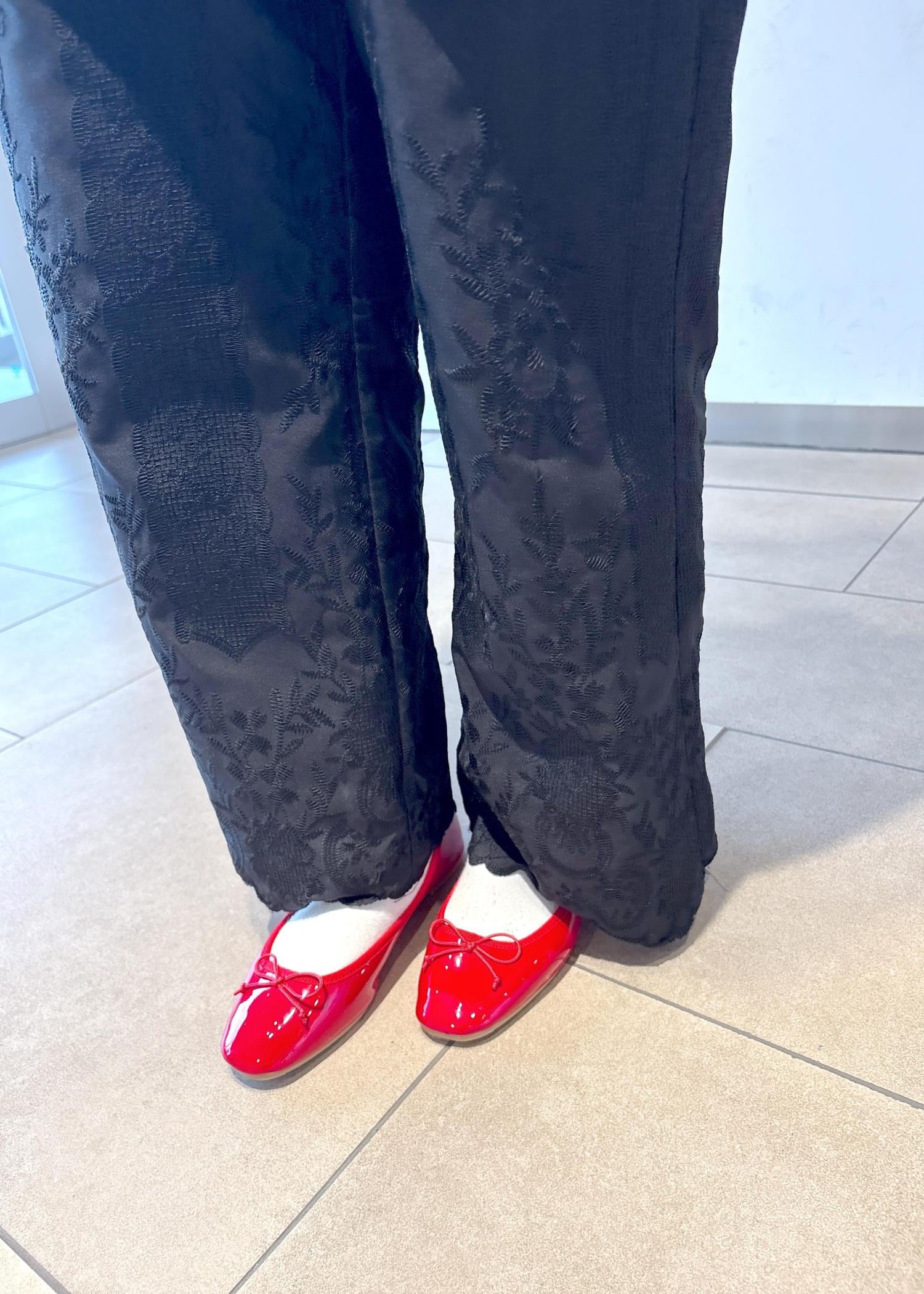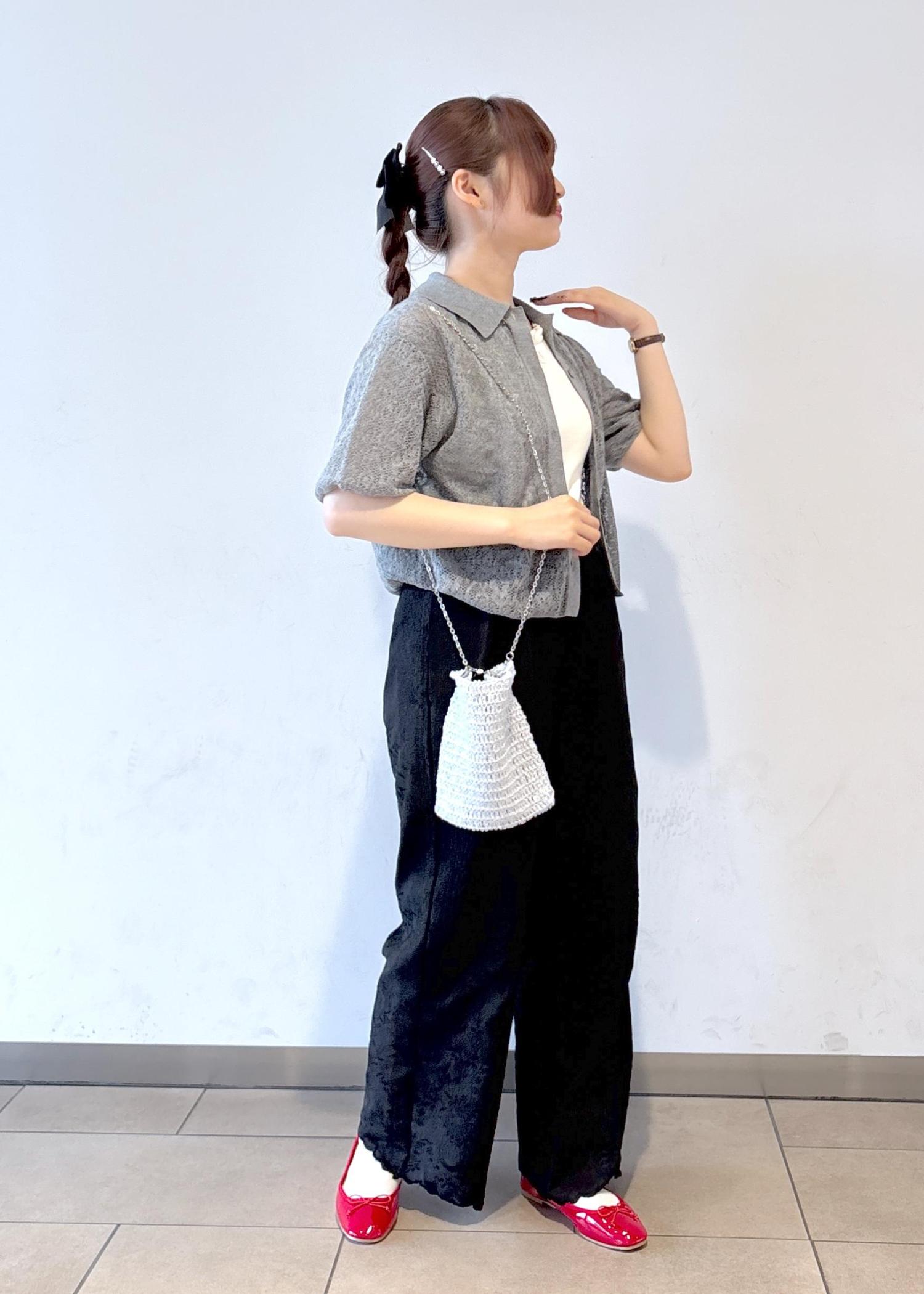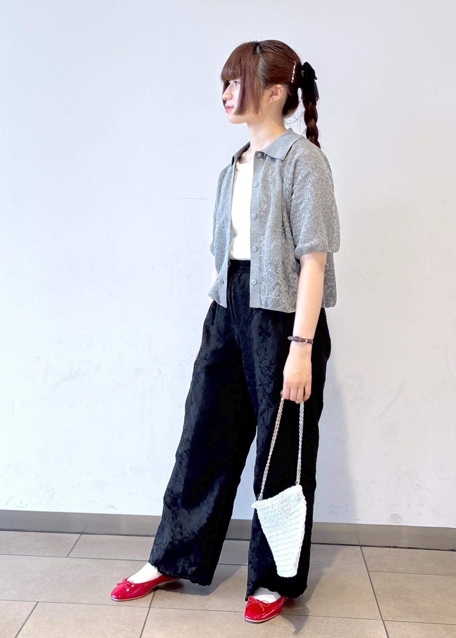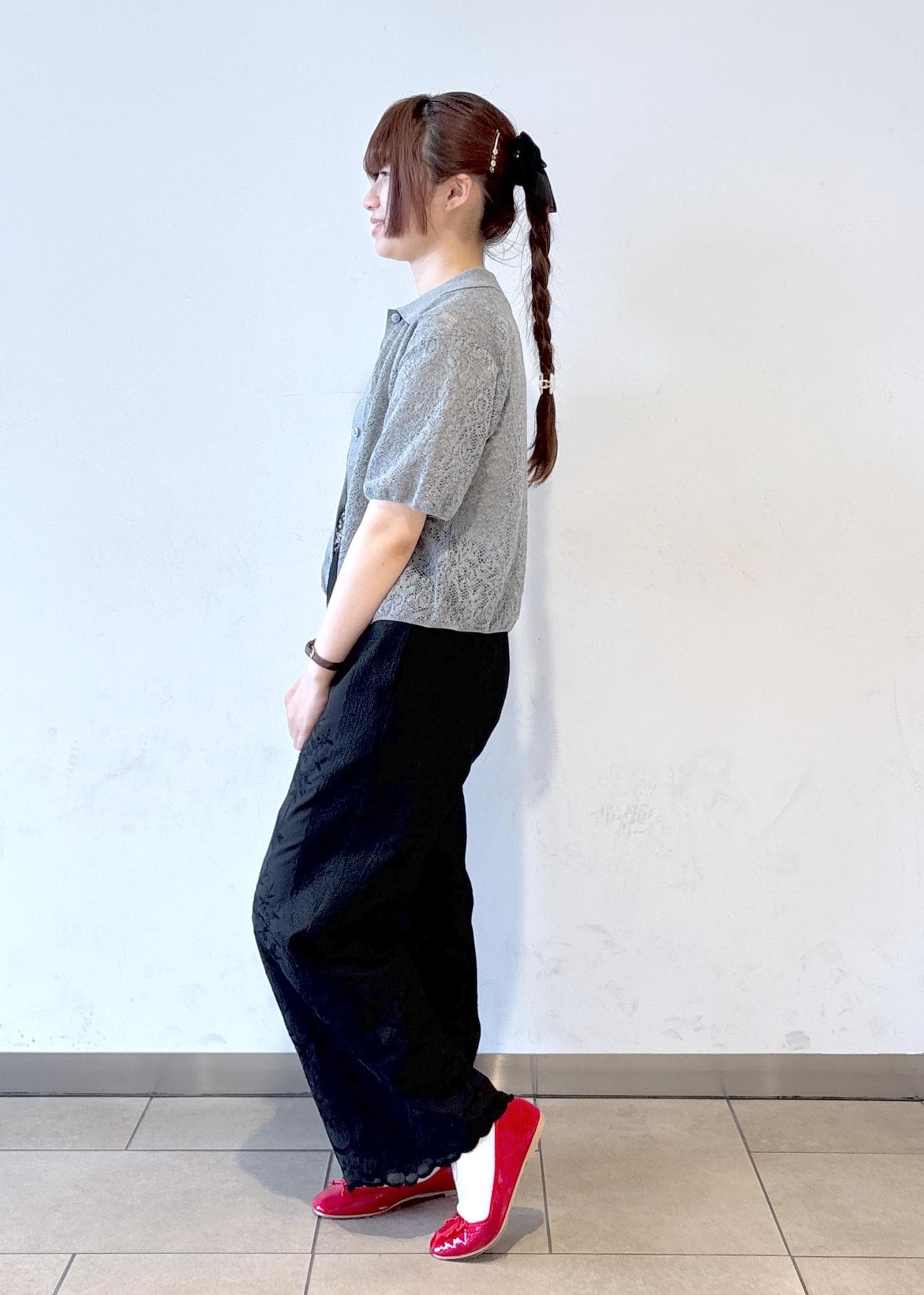 刺繍のパンツとレースのカーディガンで甘すぎずにカジュアルな印象を演出できるコーデにしました。刺繍とレースはデザインがきちんと違うので派手になり過ぎずに上品なコーデになります。ワンポイントで赤のパンプスを入れて足元を明るくさせました。