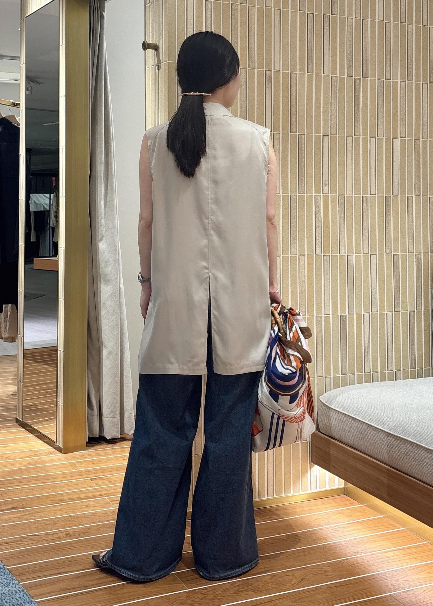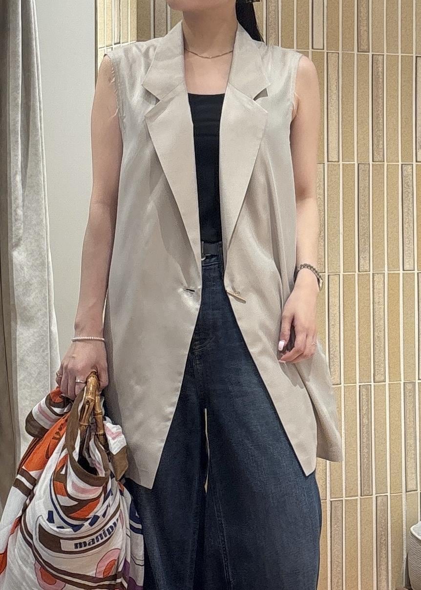 酷暑にも軽く着られてオンオフ使い回しのできるジレブラウスを、インナーを軽くしてノースリーブで着用してみました!