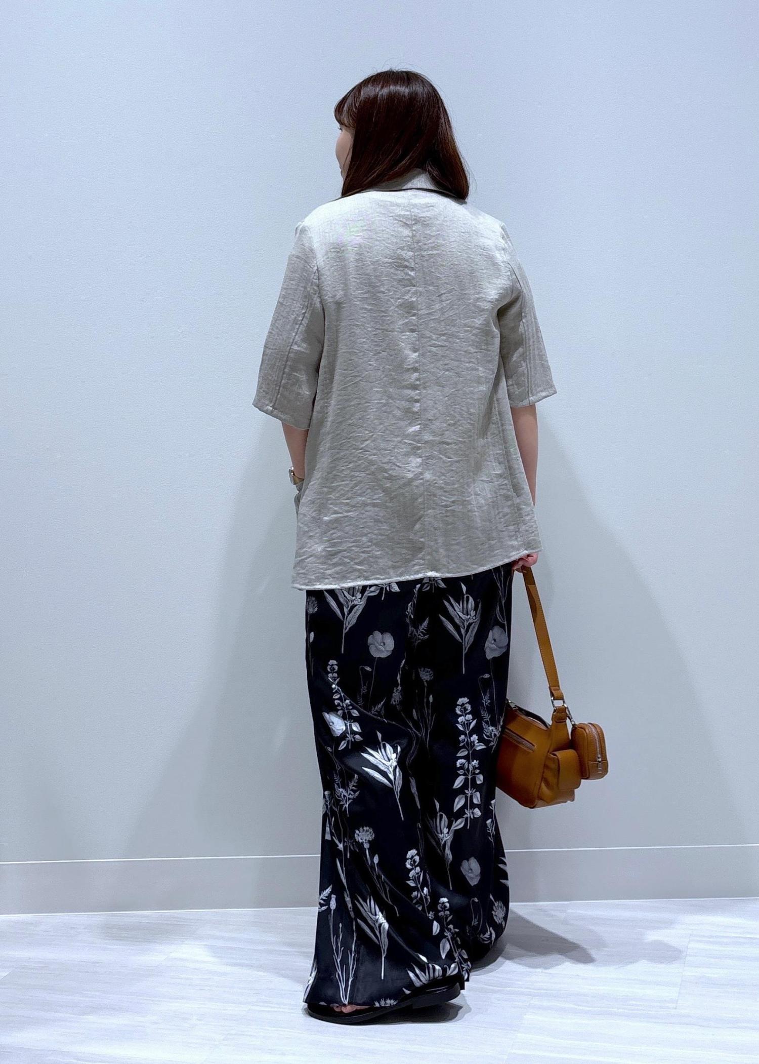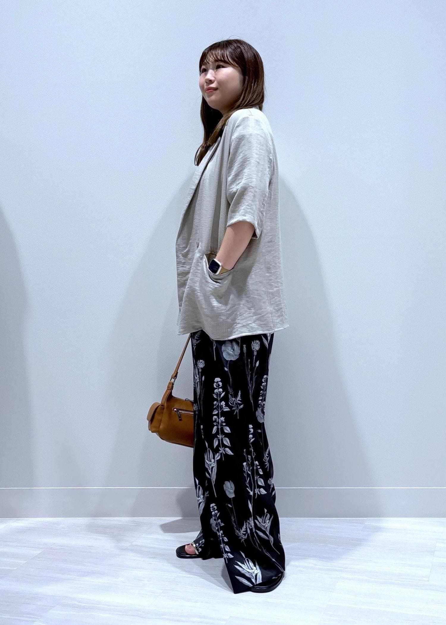 ゆったりとしたサイズ感で大人っぽい麻調のダブルジャケットにNYBGの別注アイテムを合わせたボタニカルコーデ