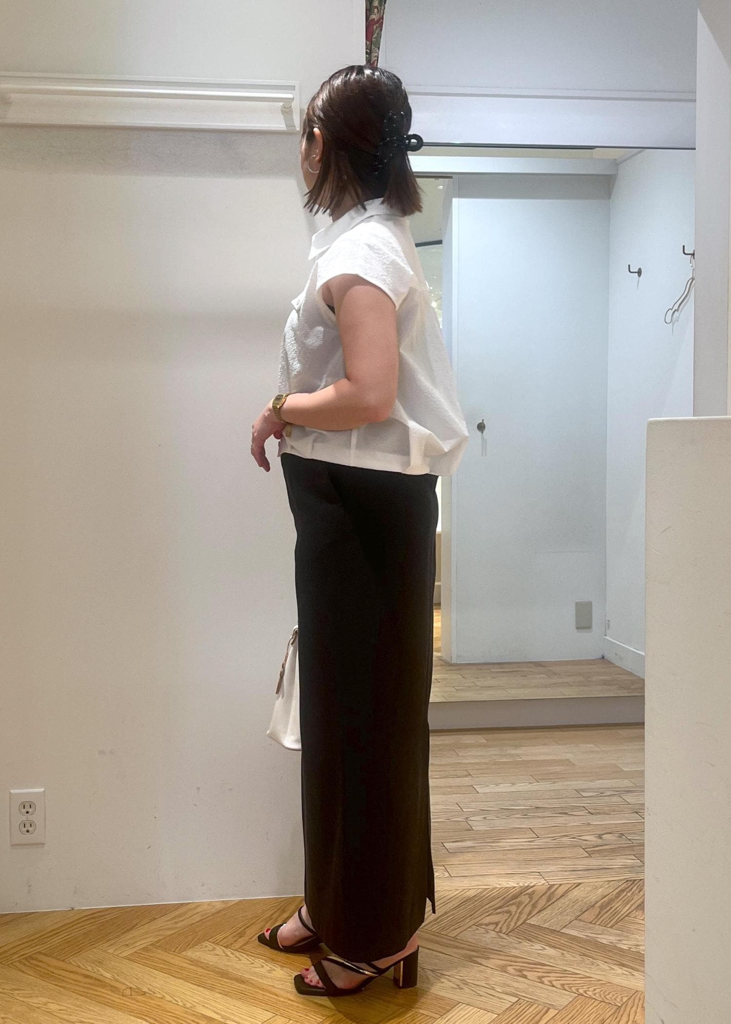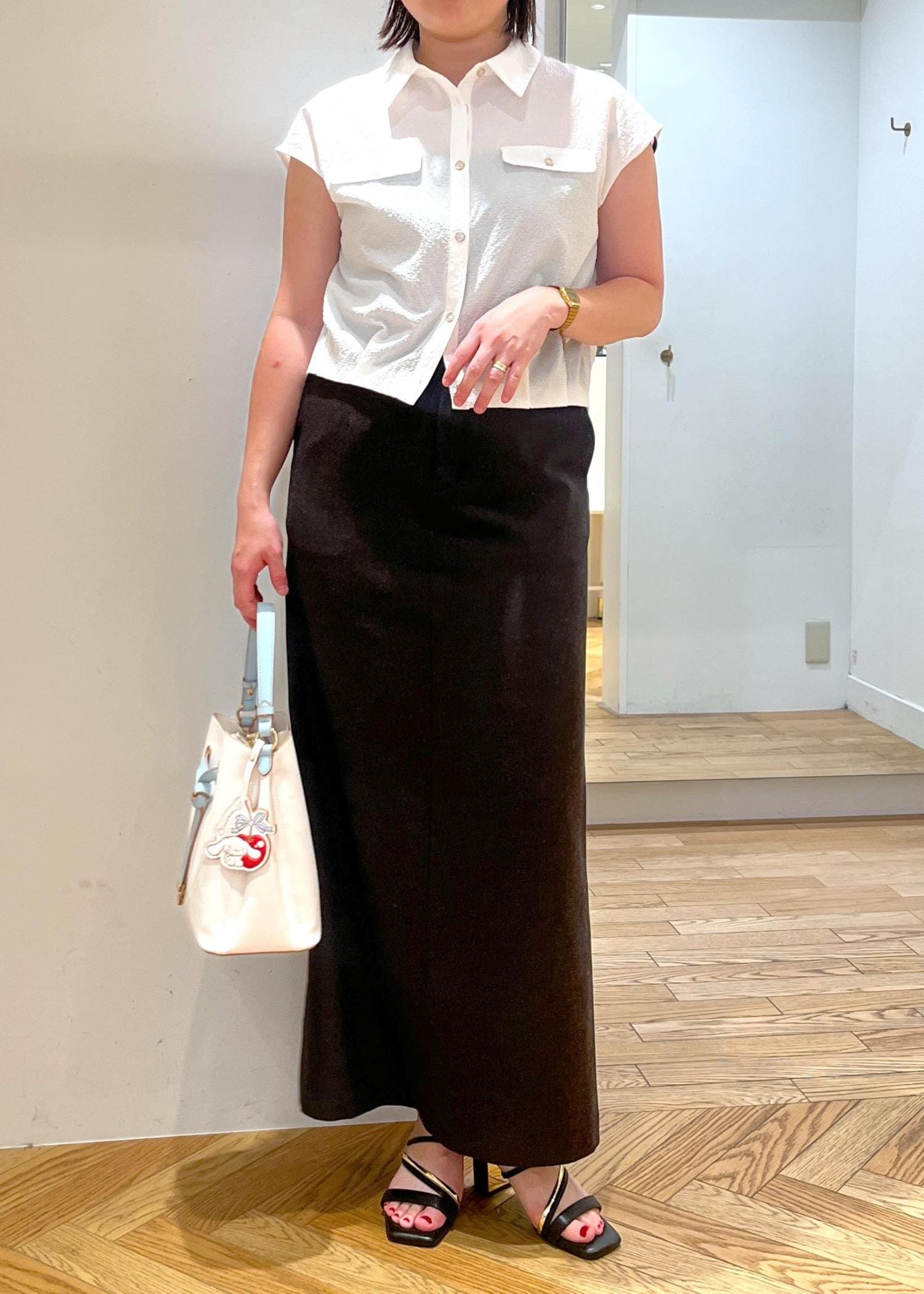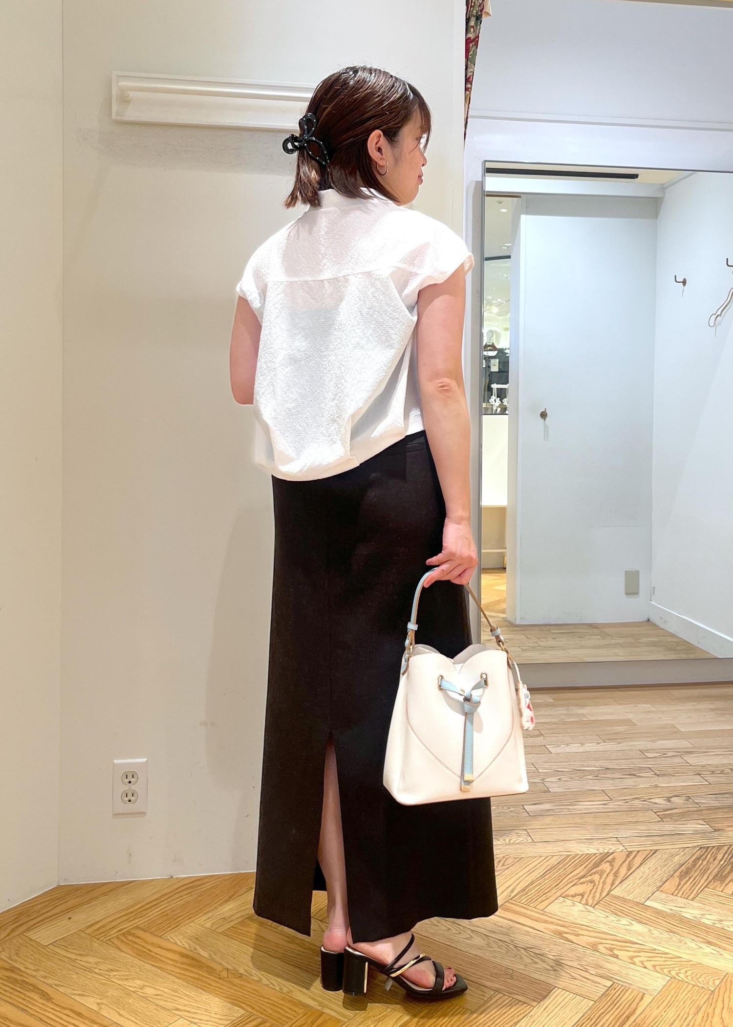 夏にサラッと着れるホワイト系のブラウスを使ったスタイルです。