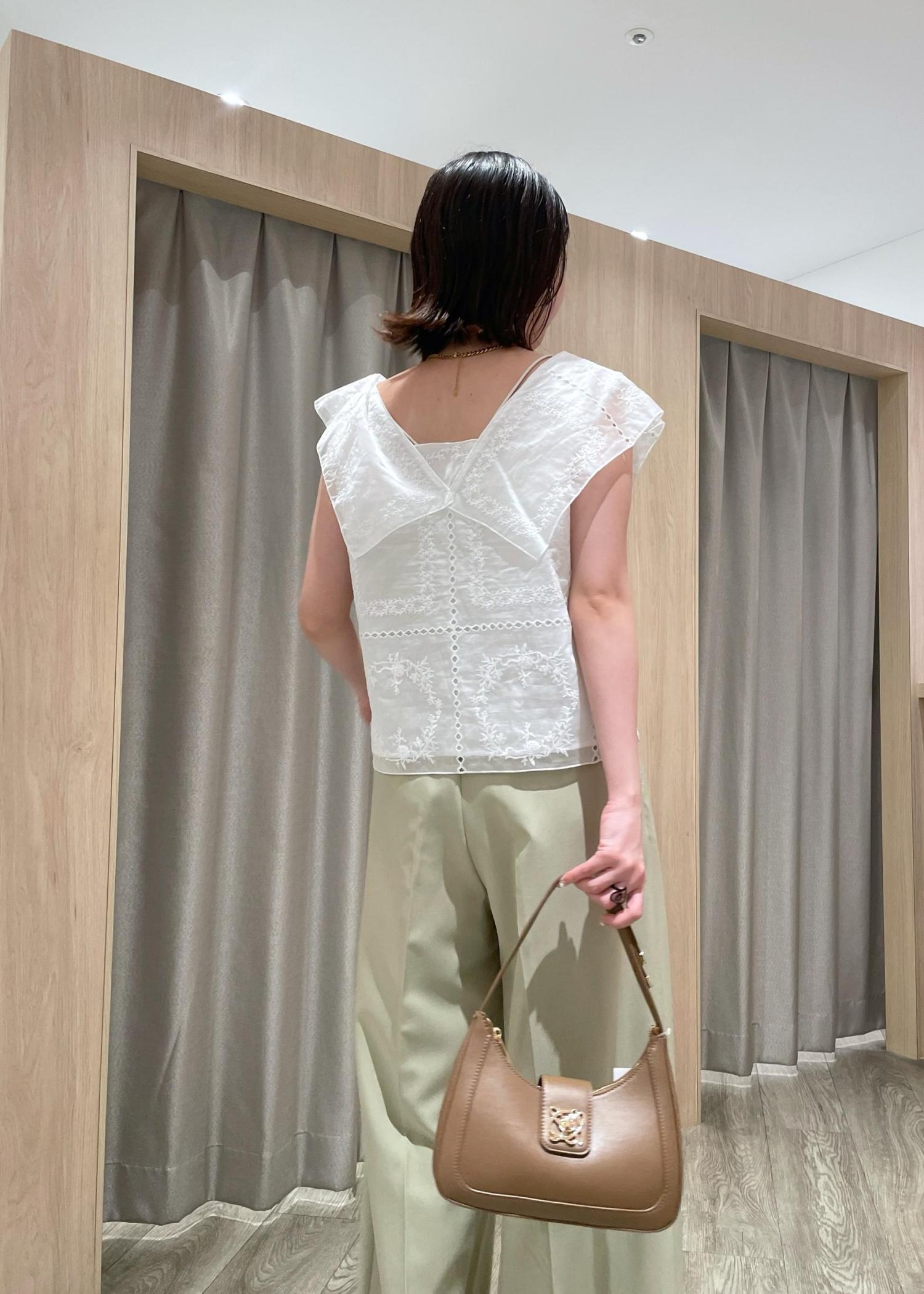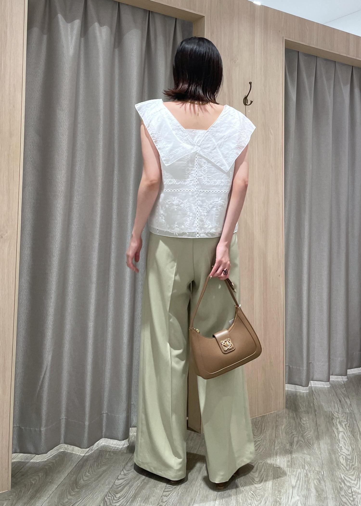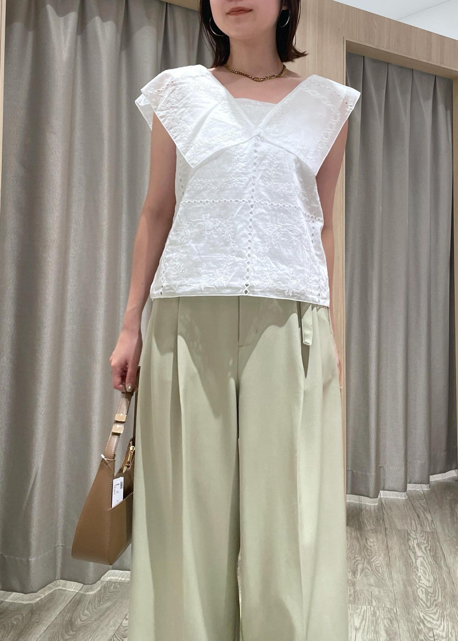 淡めのトーンなので白ブラウスを合わせて