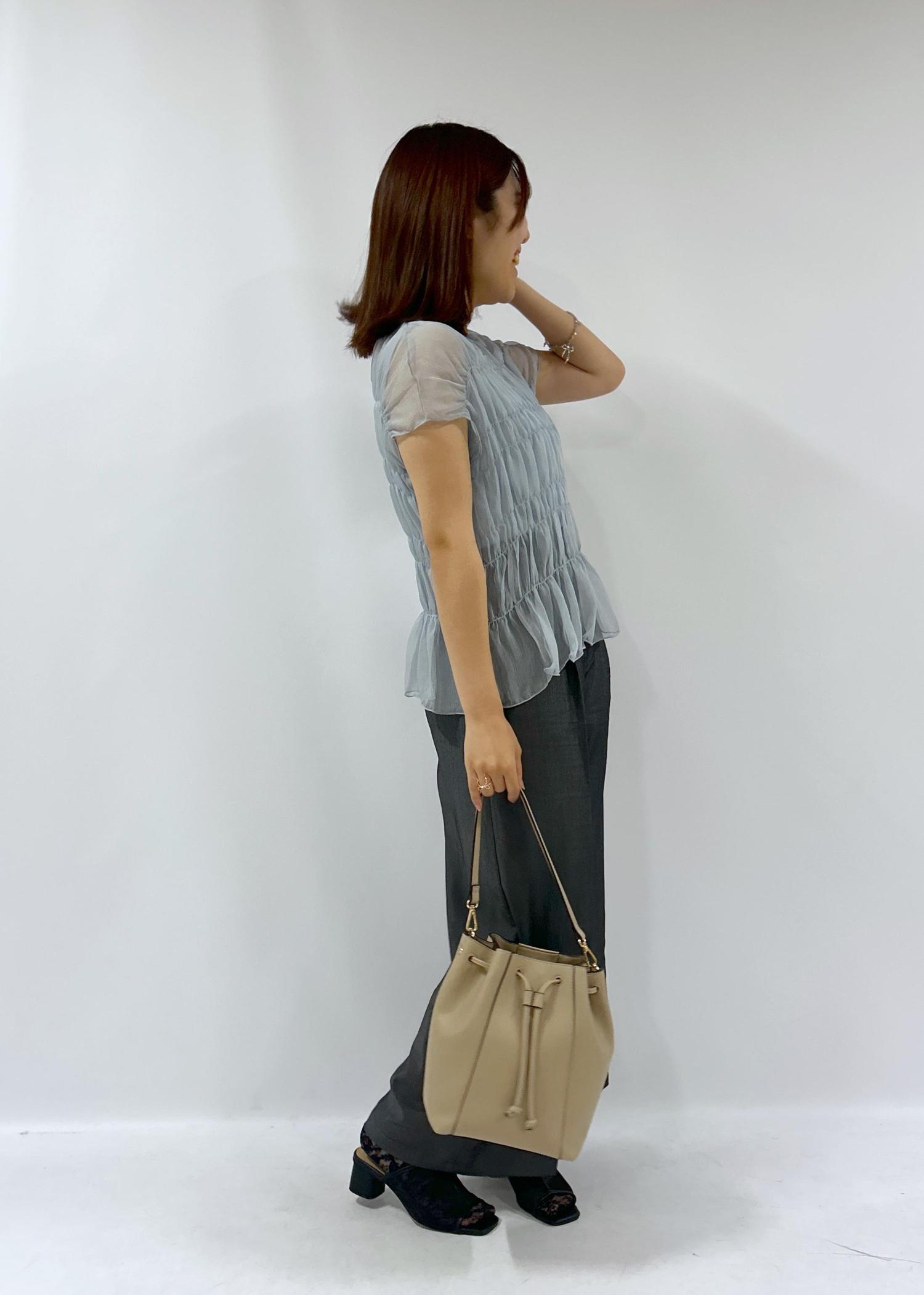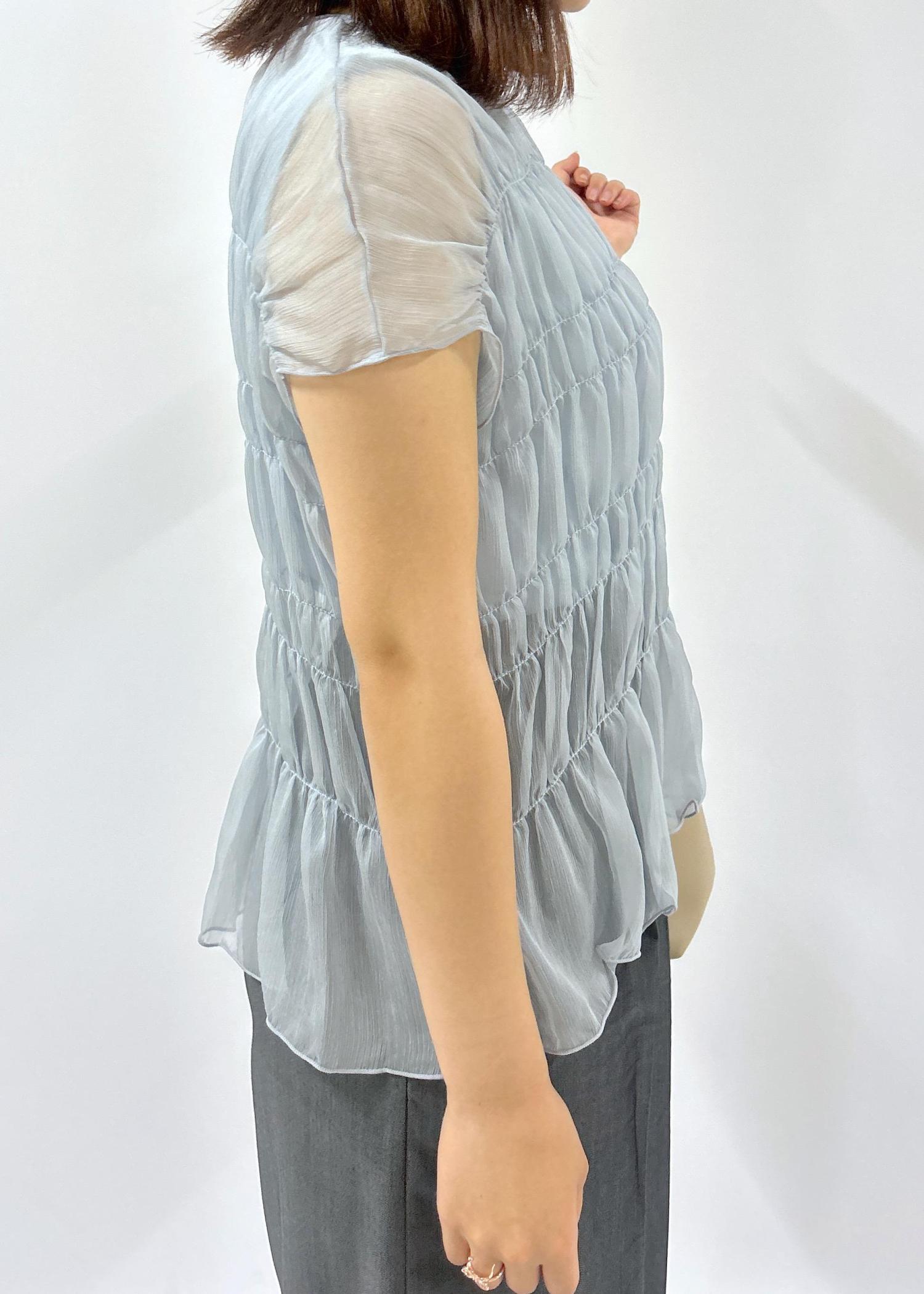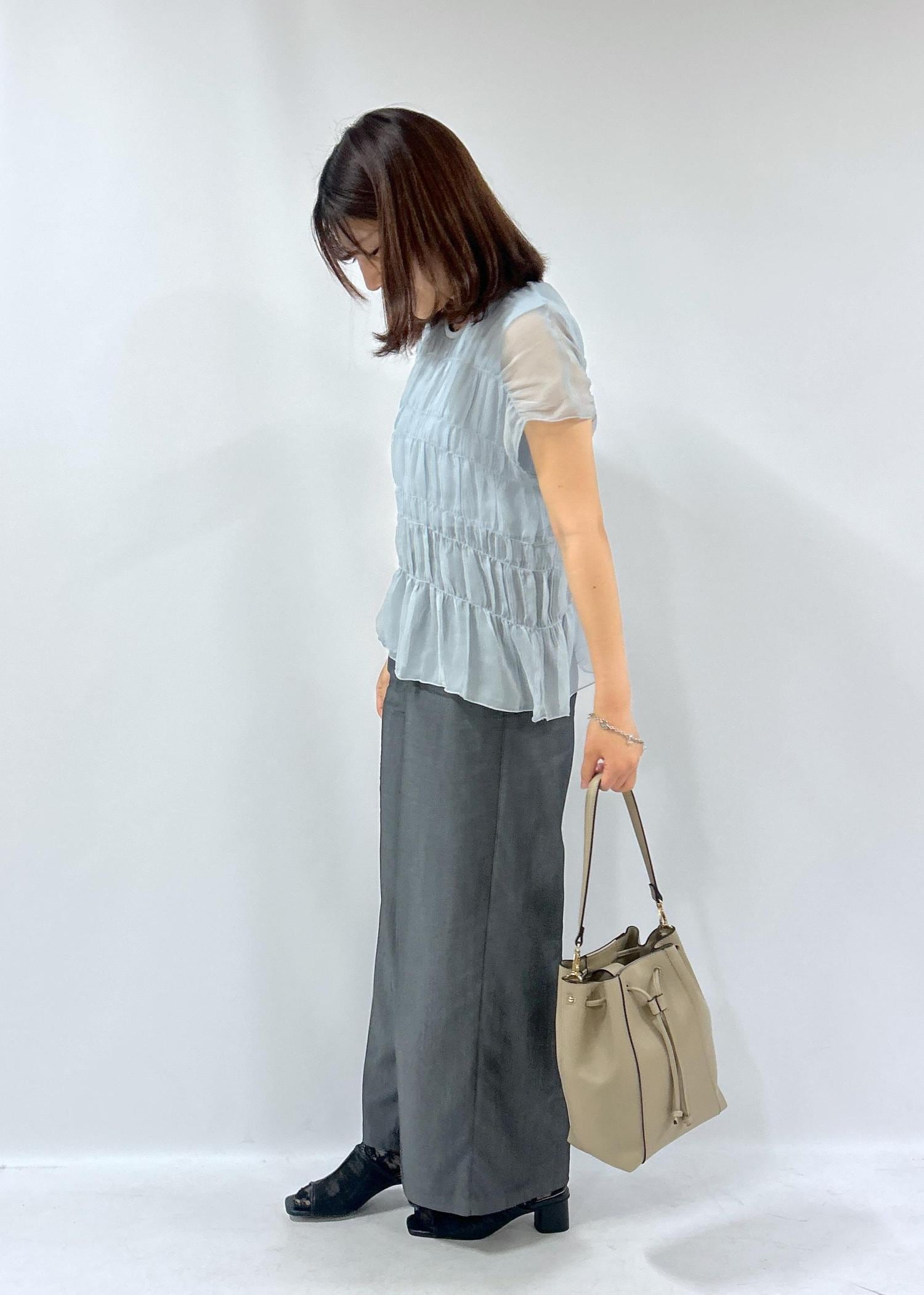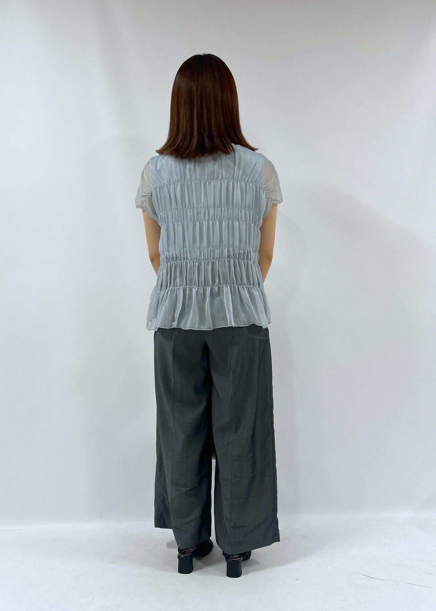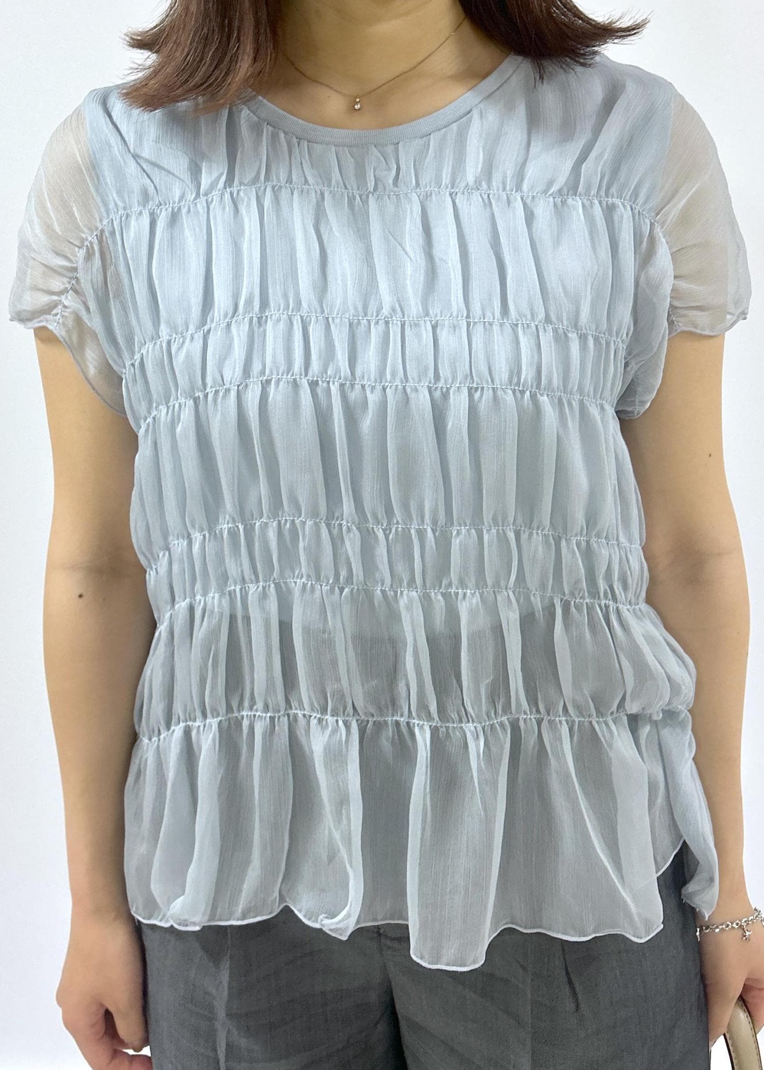 シャーリング素材が涼しげでデザイン性のあるトップスです!内側のシャツと外側のチュールが別々になっていて、両方入れても外側のチュールだけ出してもスタイリングに合わせてどちらでも着られます◎