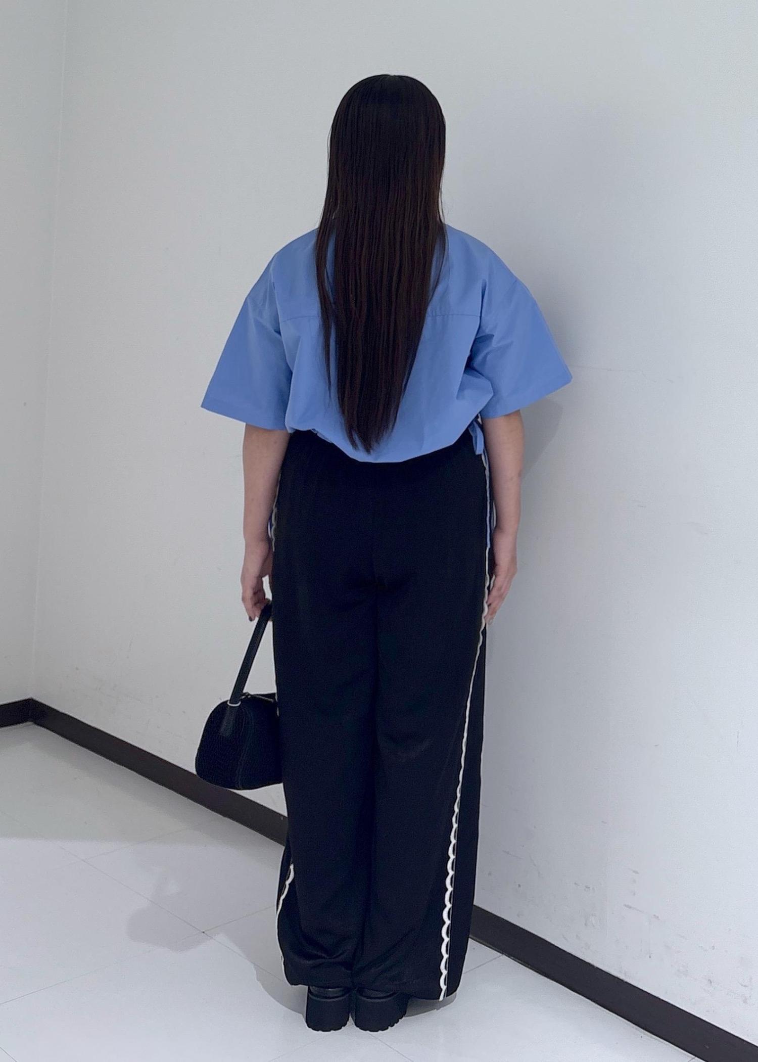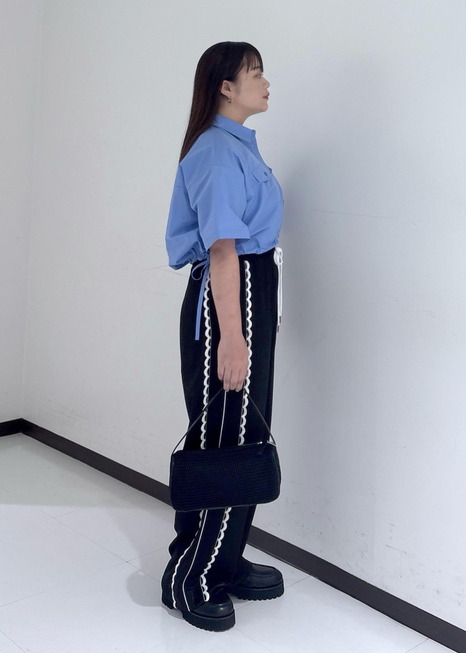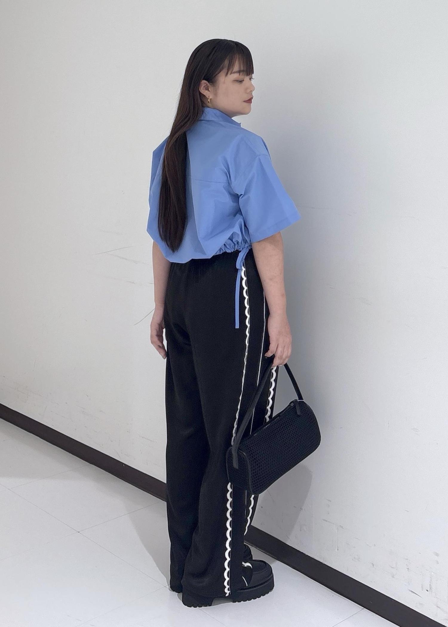 今日は、クロップドギャザリングシャツとサイドレーストラックパンツを使用したコーデを組んでみました‼︎