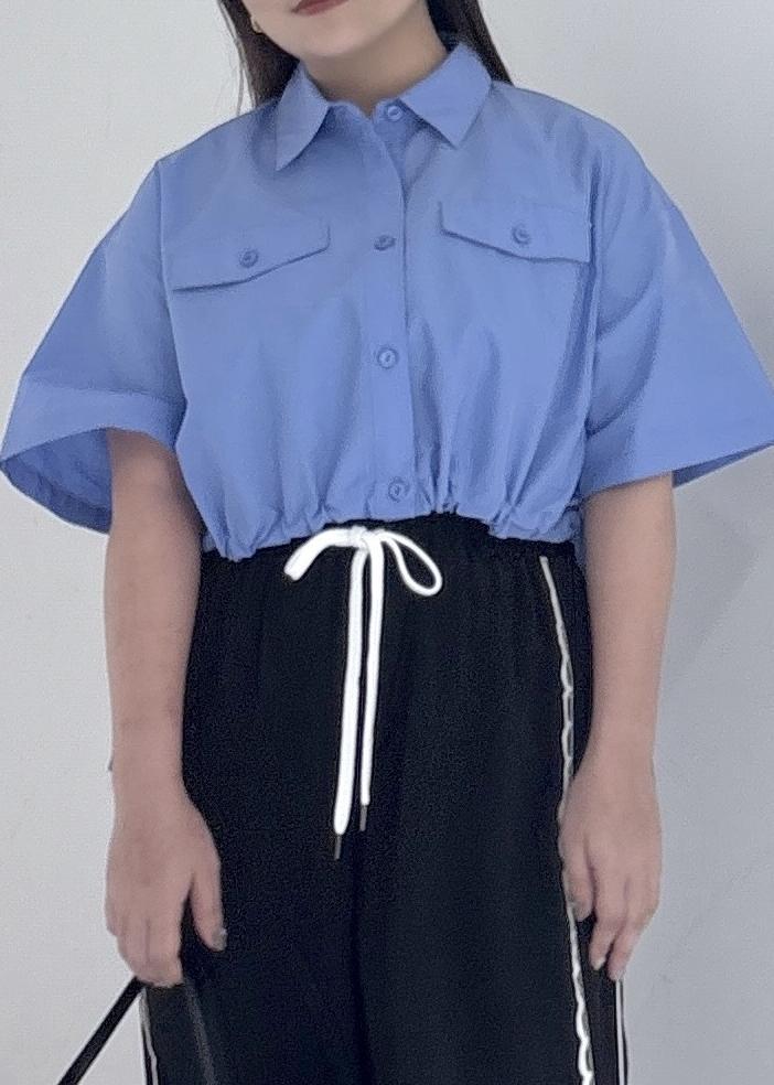 アウトレットADAM ET ROPÉ FEMME【逸品】・【サステナブル】クロップドギャザリングシャツブルー系 / F¥6,776レビュー短めの丈でパンツスタイル、スカートスタイルともに綺麗に着られます。サイドも自由に絞れます。