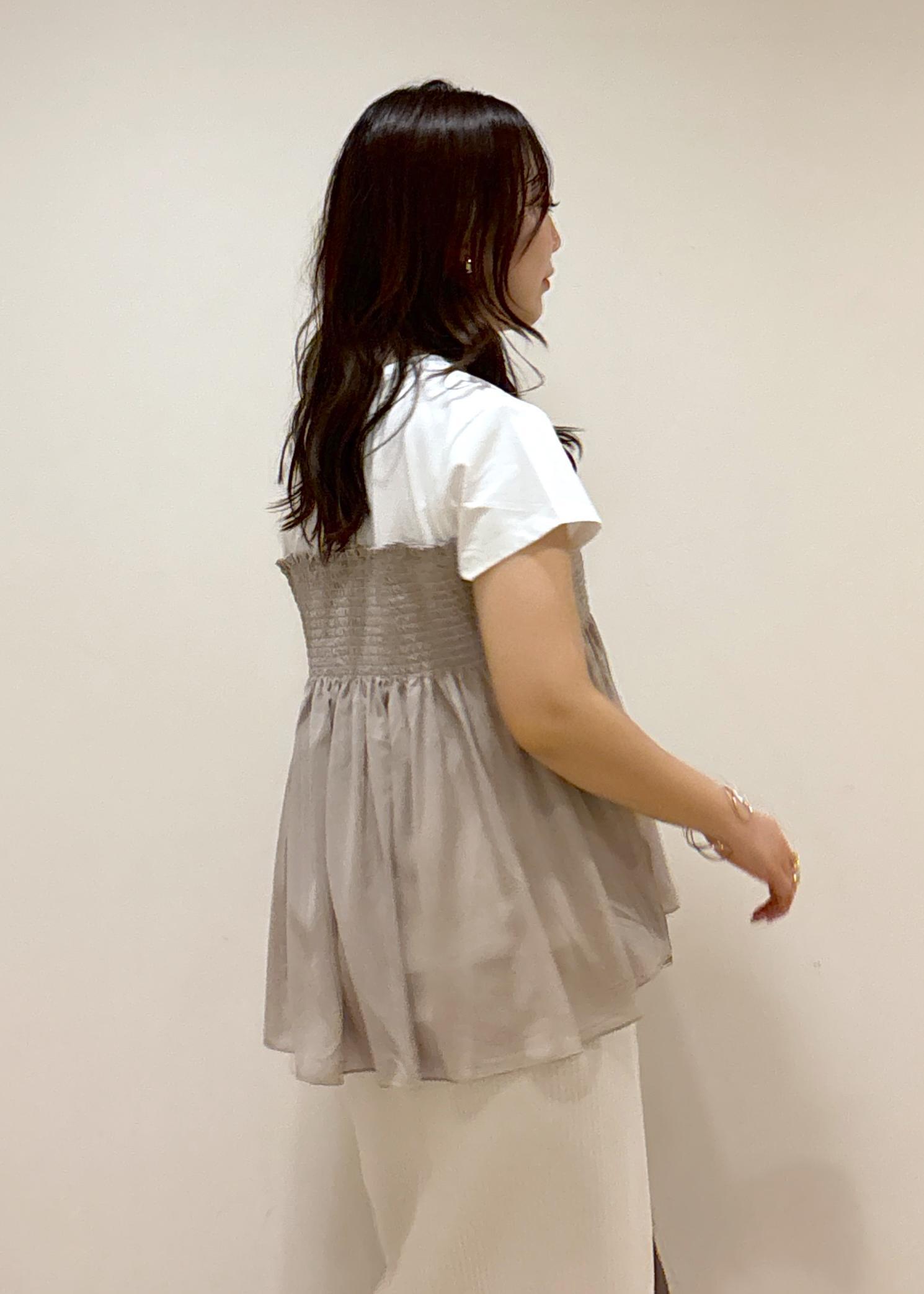 胸元のシャーリングは窮屈感なく伸縮性があり着やすいです。