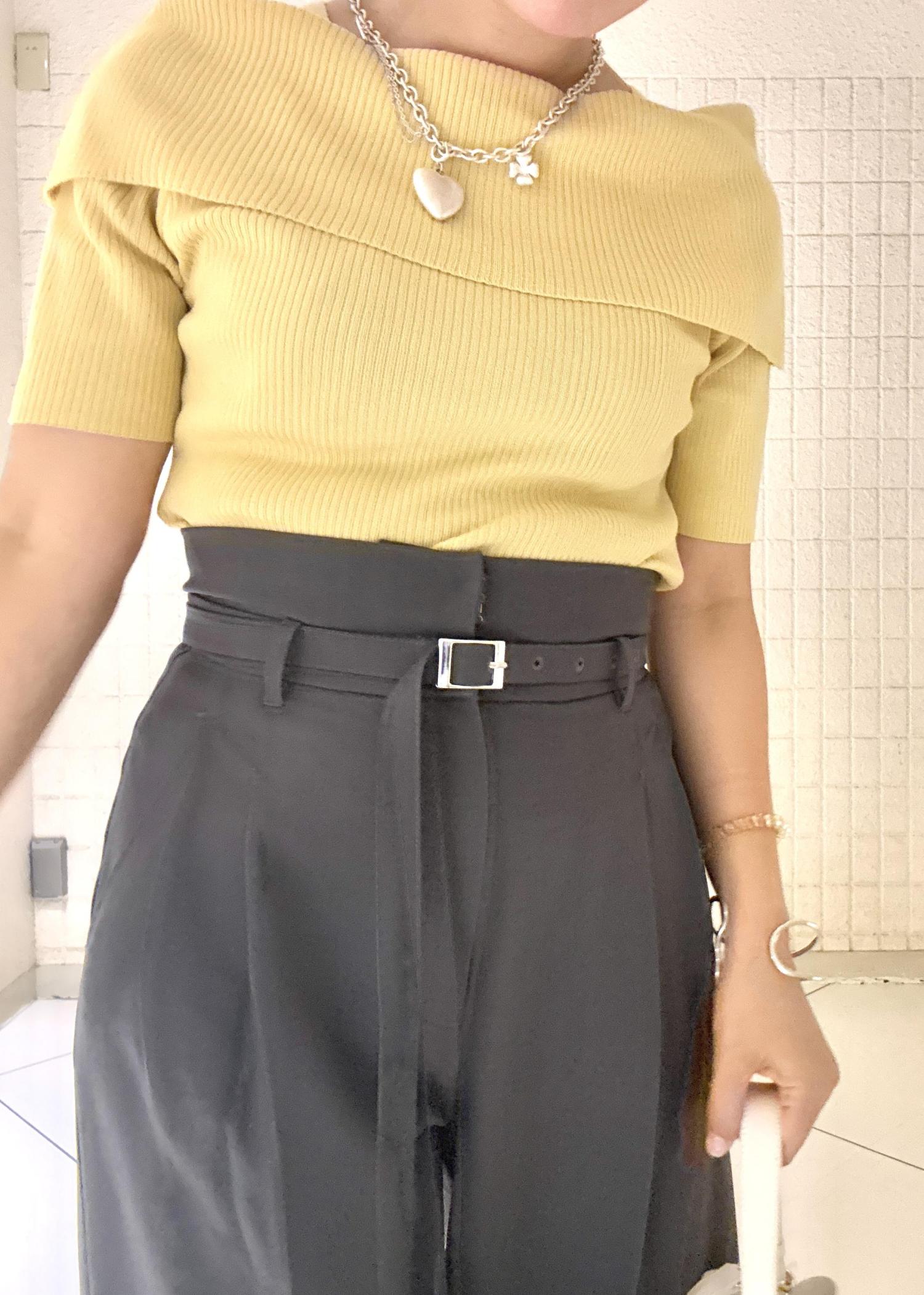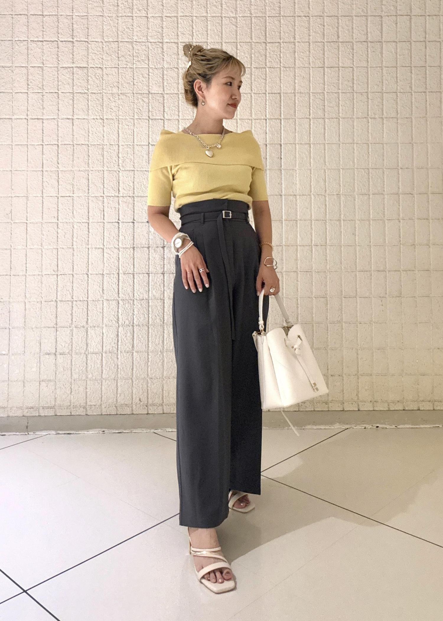 トップスがオフショルでフェミニンな印象なのでパンツスタイルで少しヘルシーさも出しました。