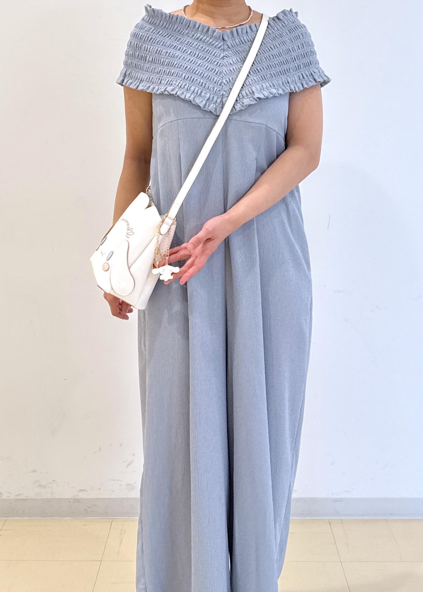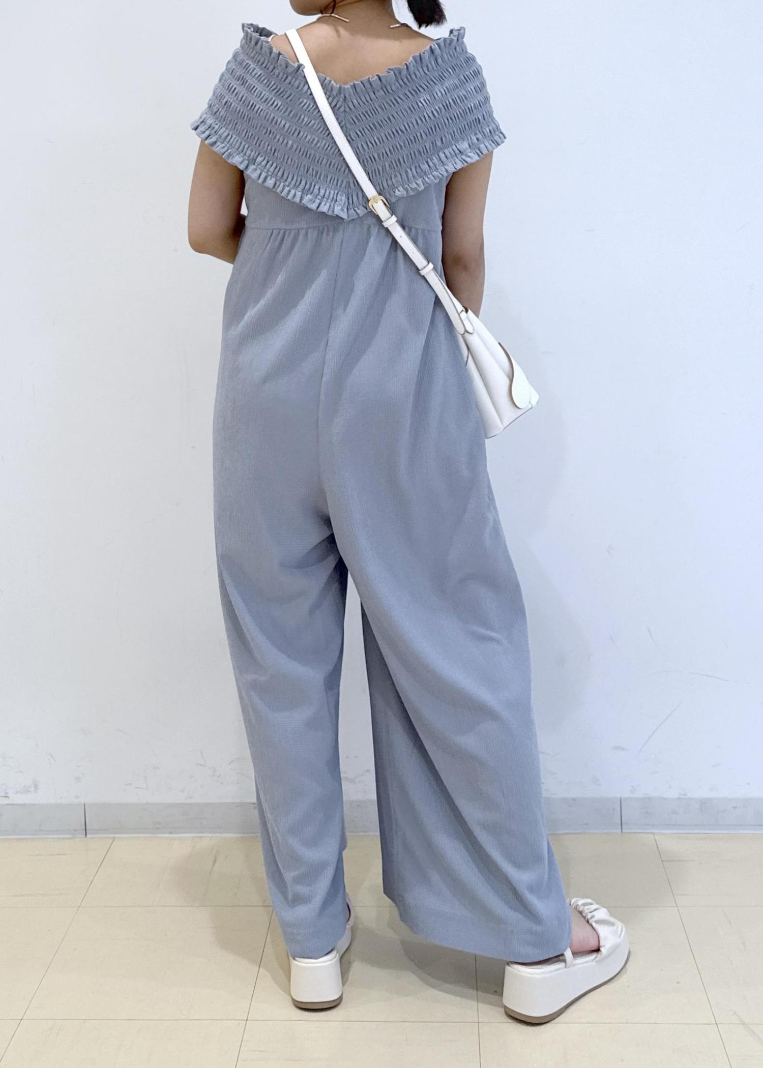 アウトレットVISシャーリングオフショルダーオールインワンブルー系 / F¥6,327レビュー肩紐で長さ調節が可能なので身長152cmでもヒールなしで着れました!