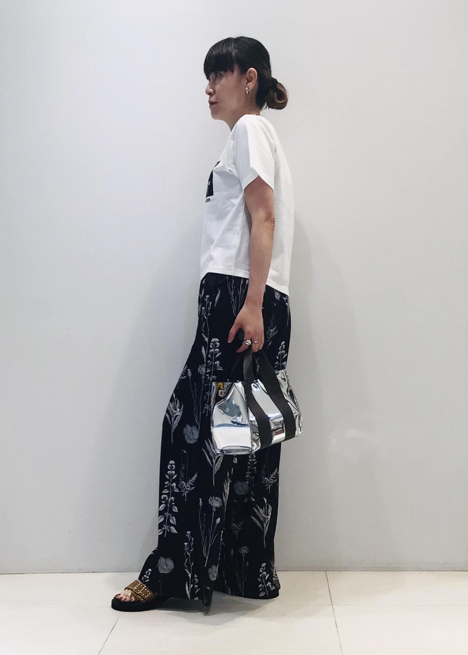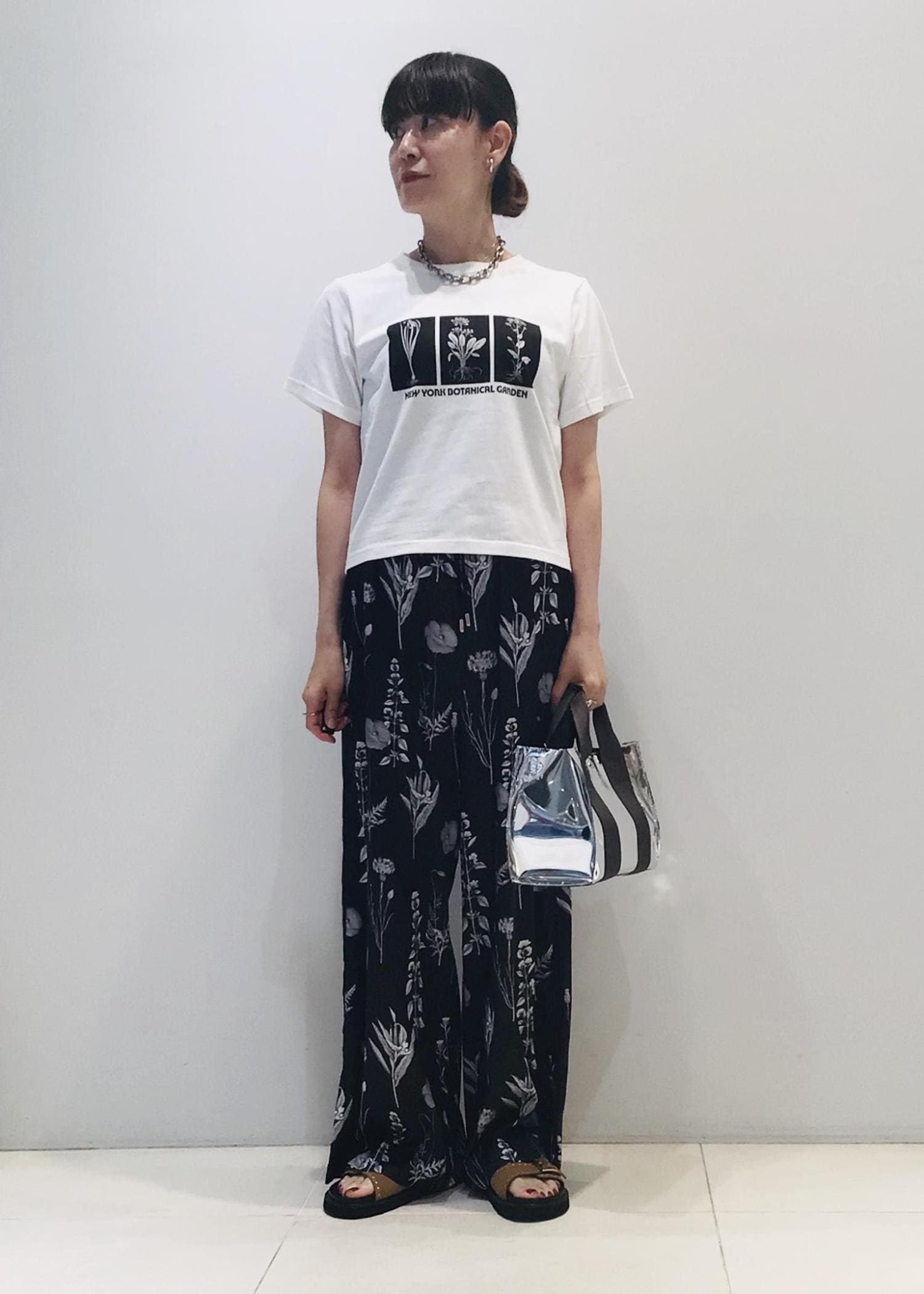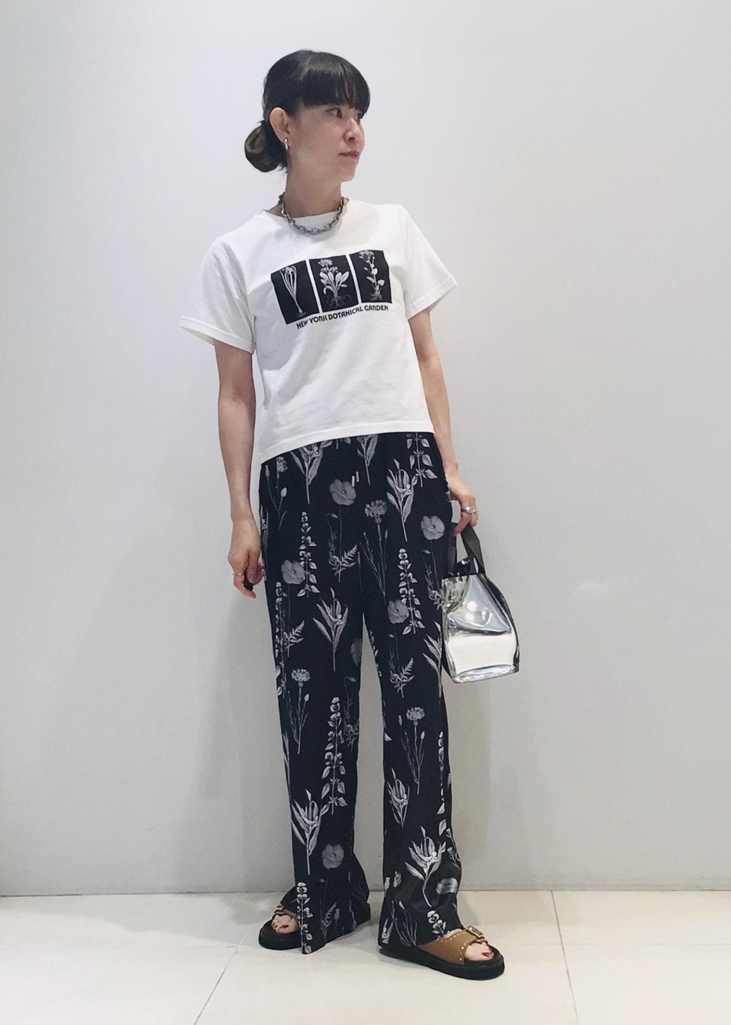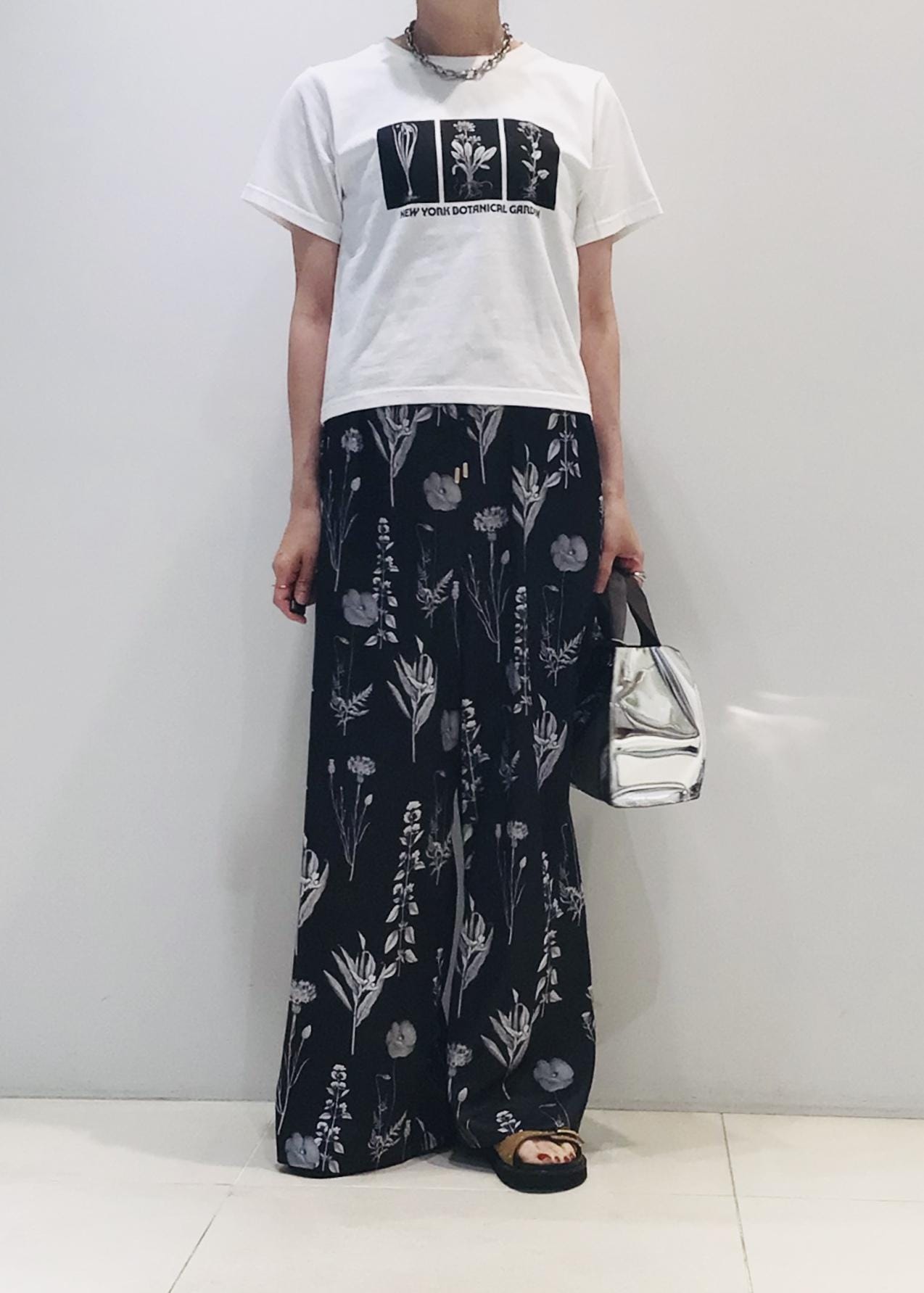モノトーンの花のデッサンがプリントされていて、どことなくモードな雰囲気漂う大人女子にオススメのTシャツです