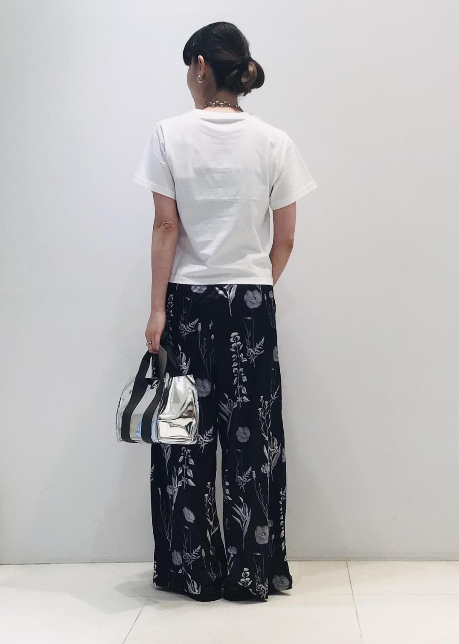 微光沢のあるサテン地にボタニカルプリントを施したイージーパンツ