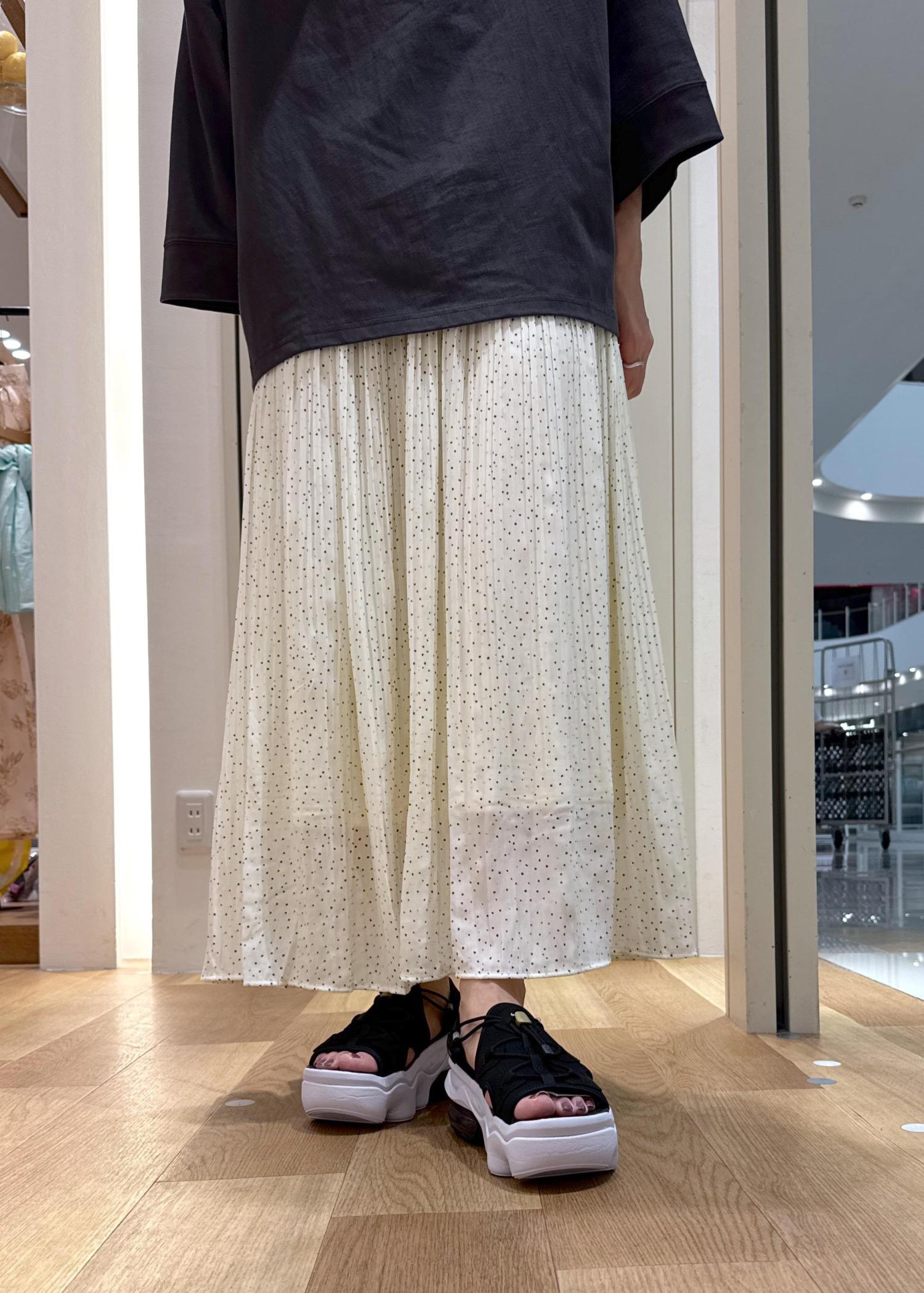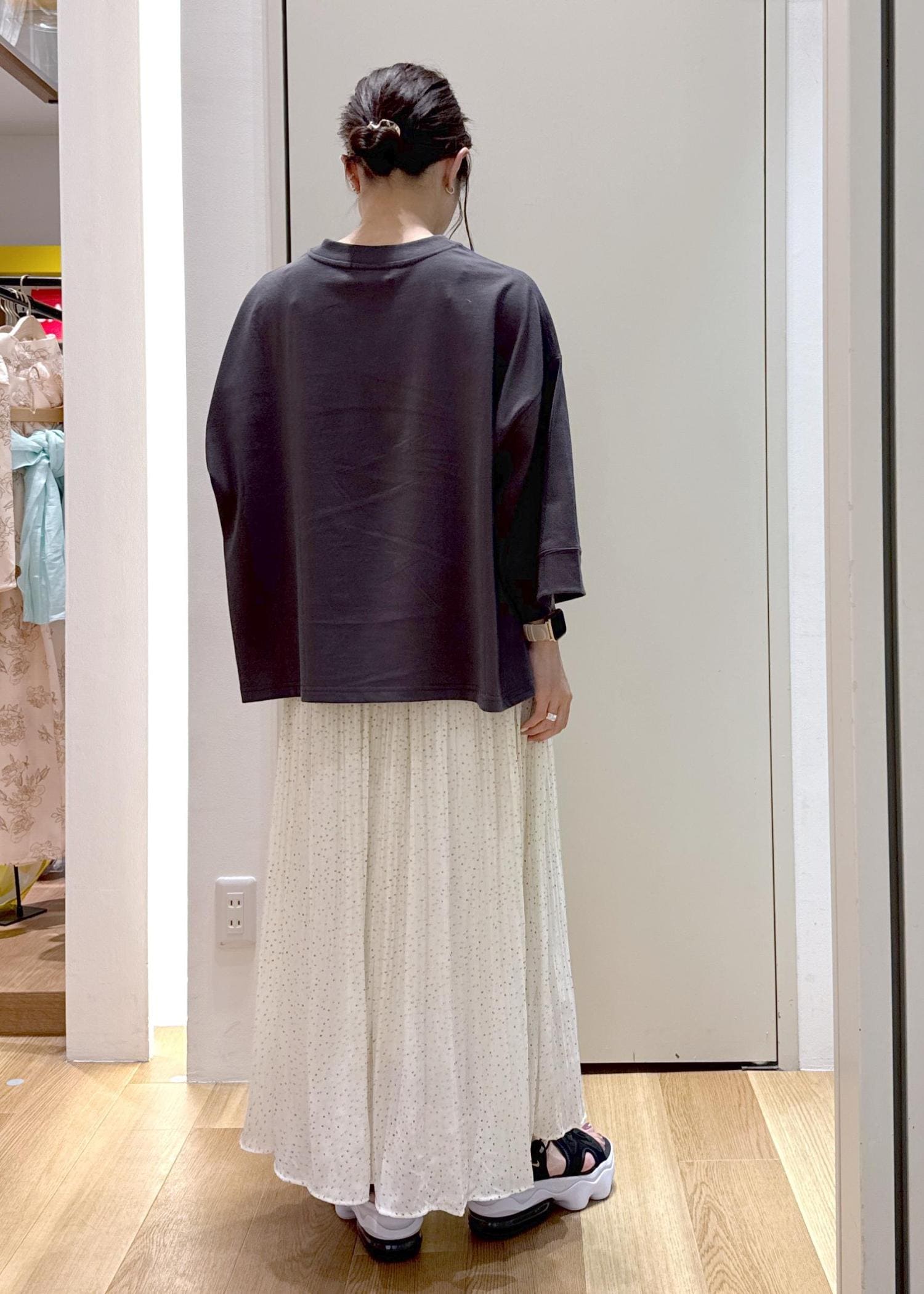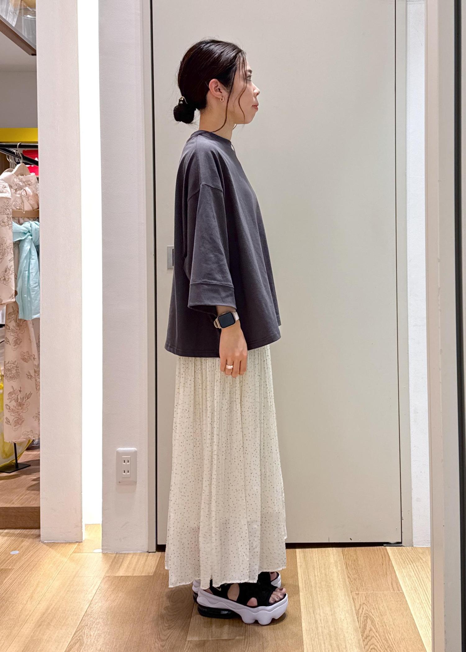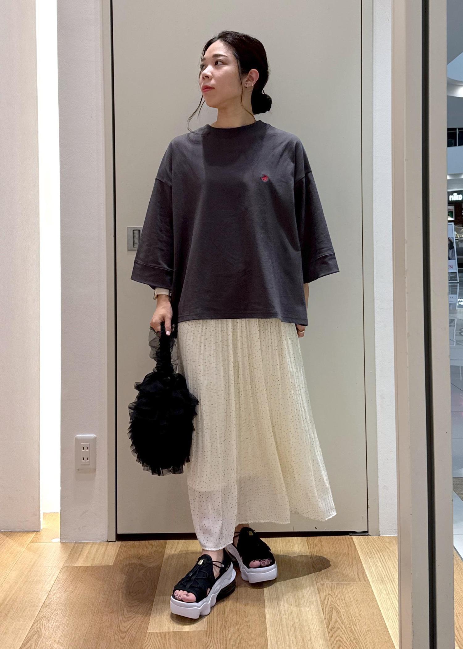 カジュアルなデザインなので、ボトムはスカートで少し甘さを加えました!