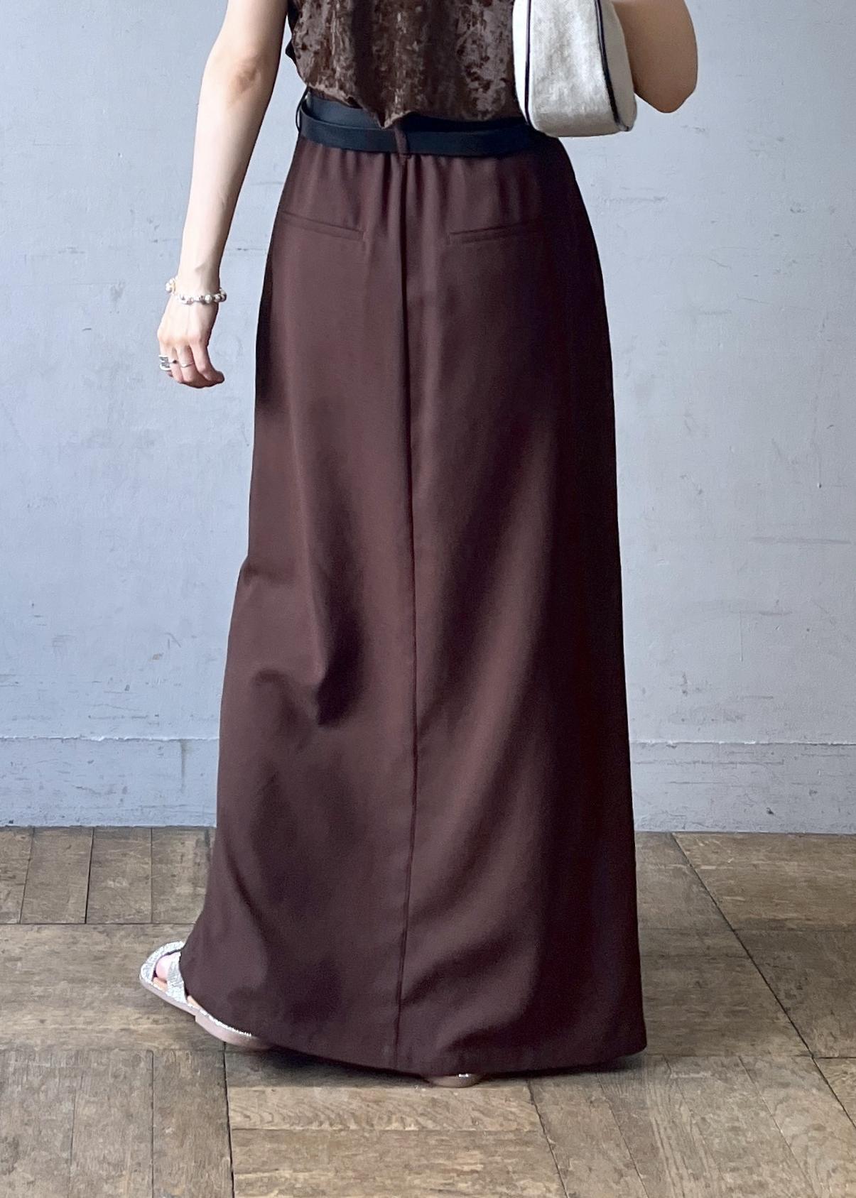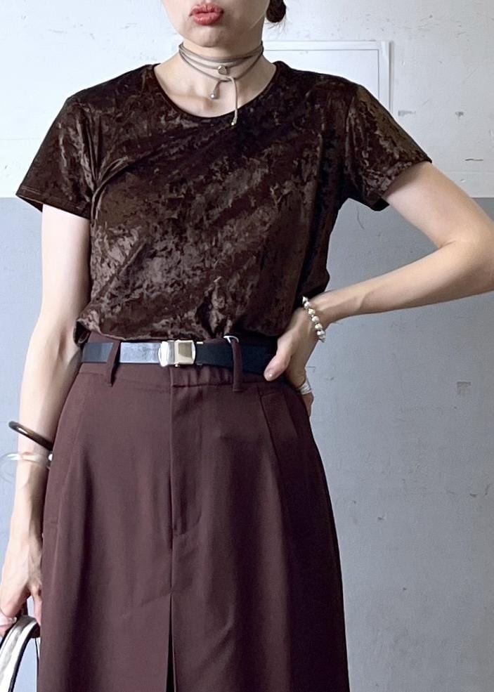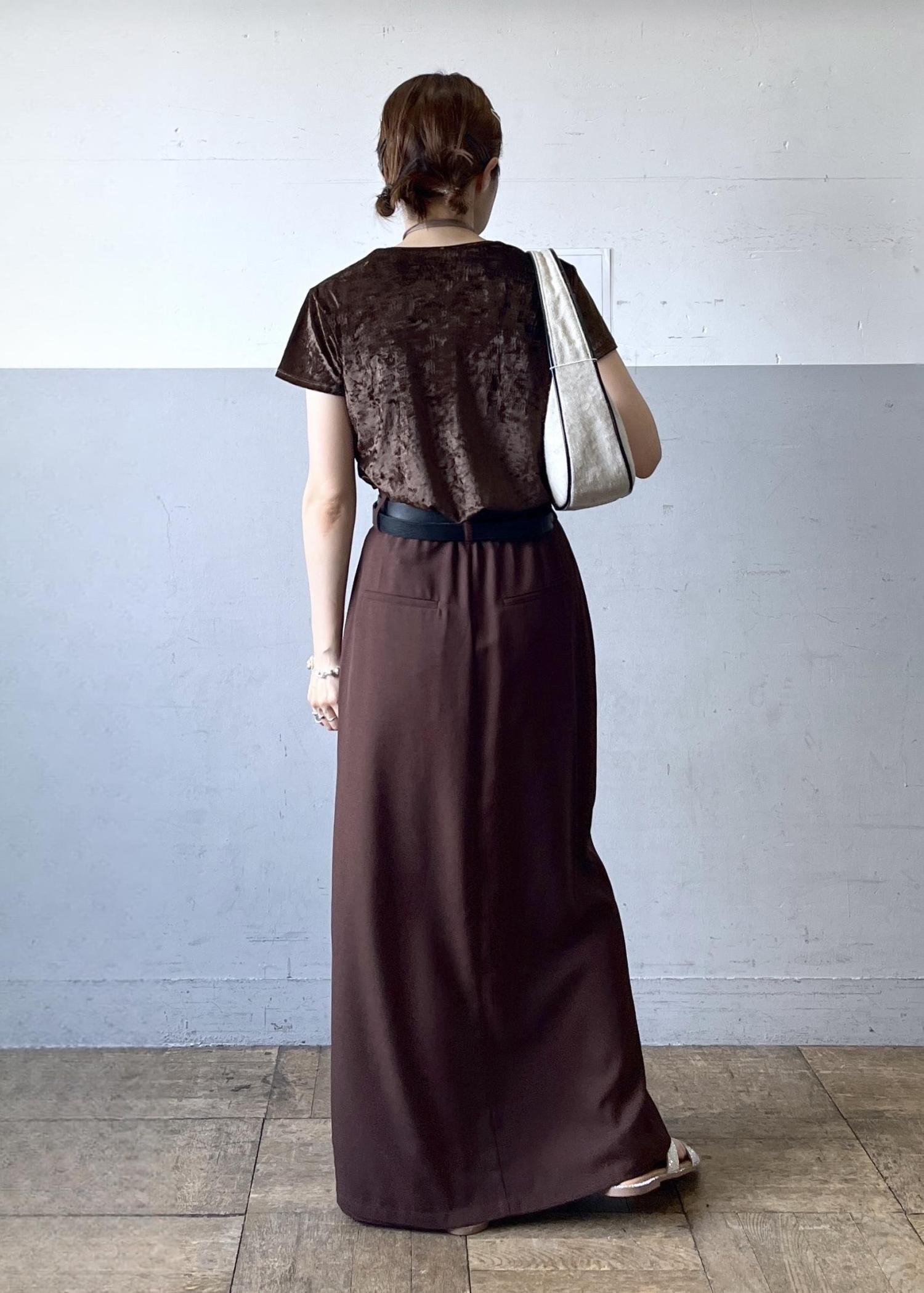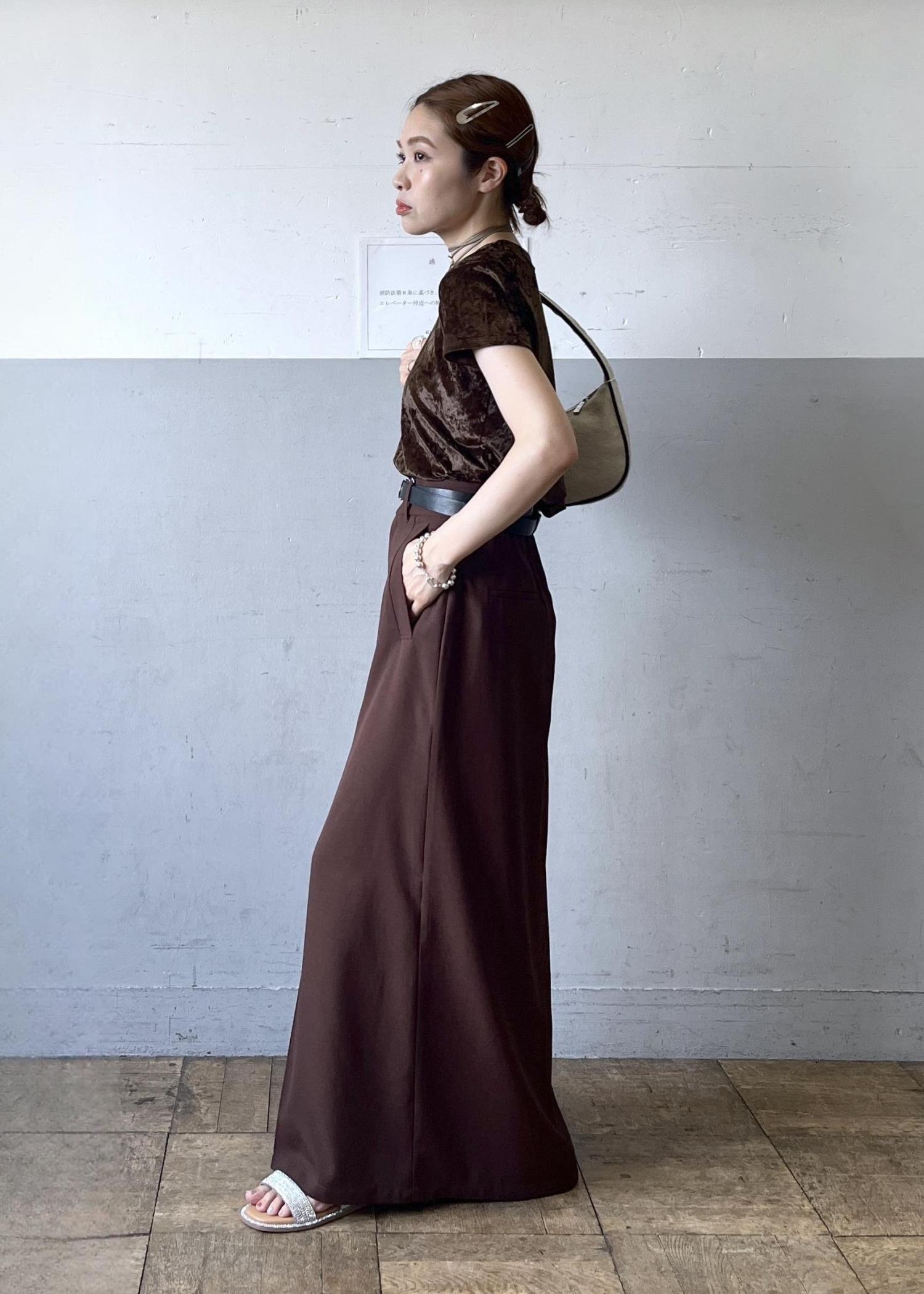 ブラウンのワントーンながら、ベロアTEEと合わせて異素材コーディネート。