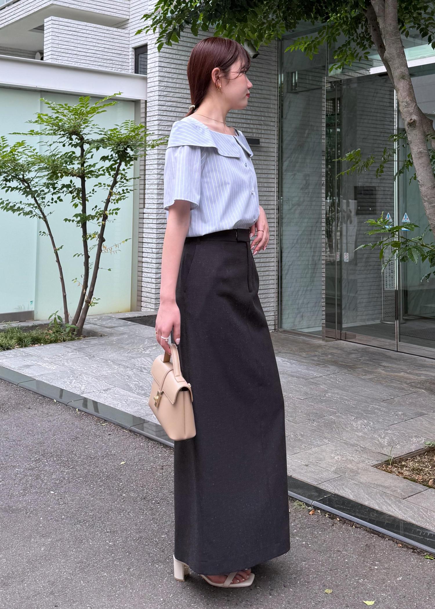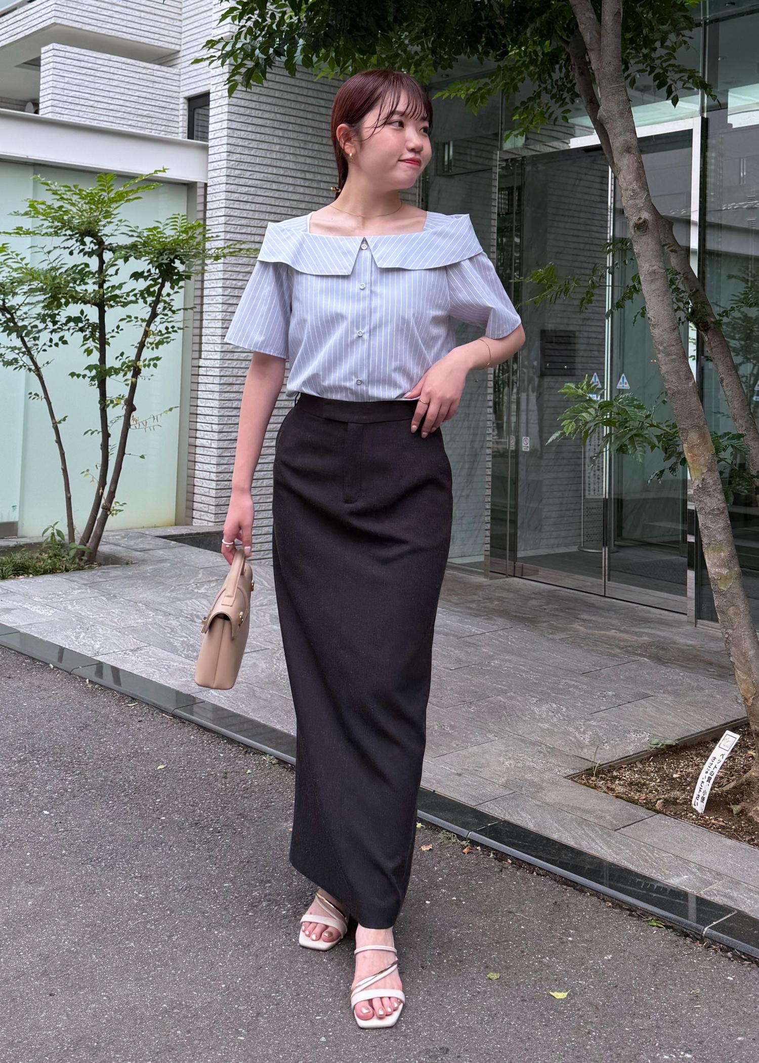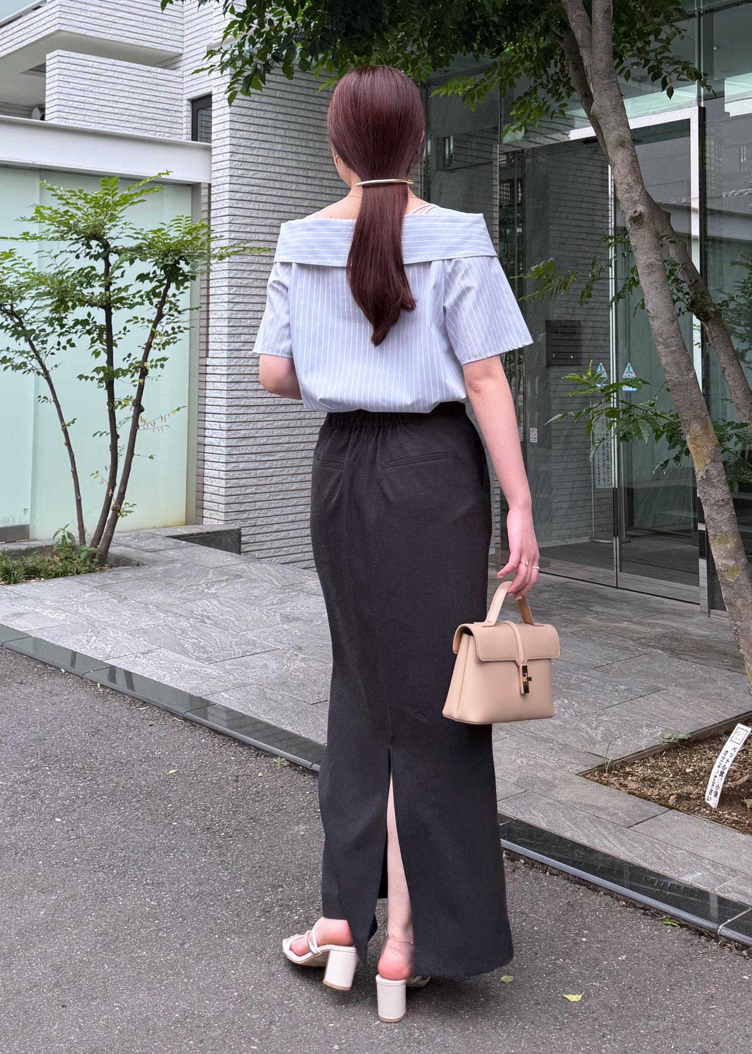 オフショルシャツに、タイトスカートを合わせてきれいめコーデに!程良い肌見せが女性らしさをプラス◎
