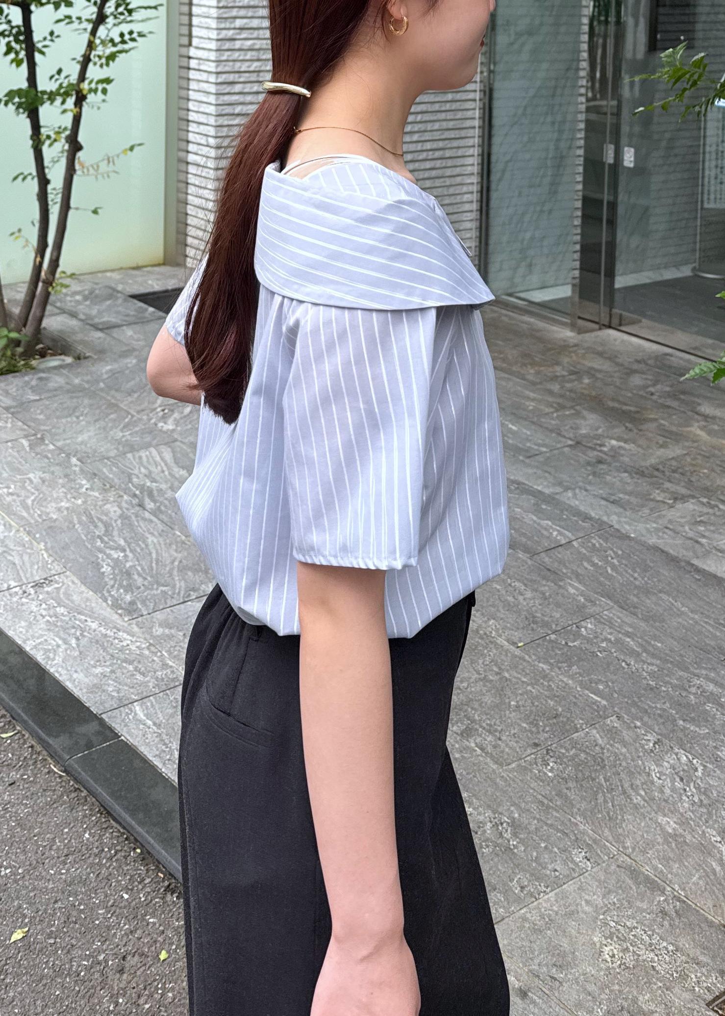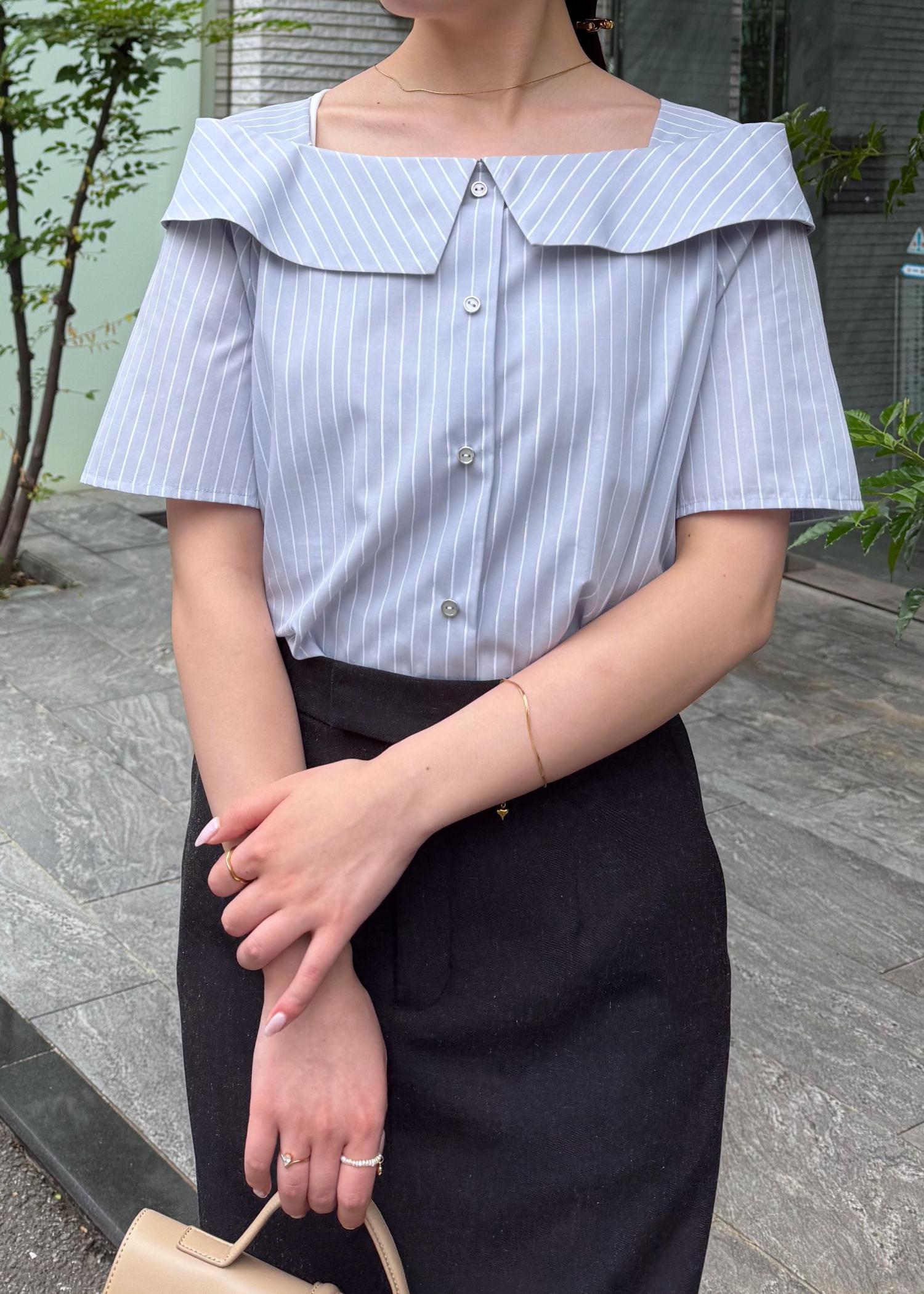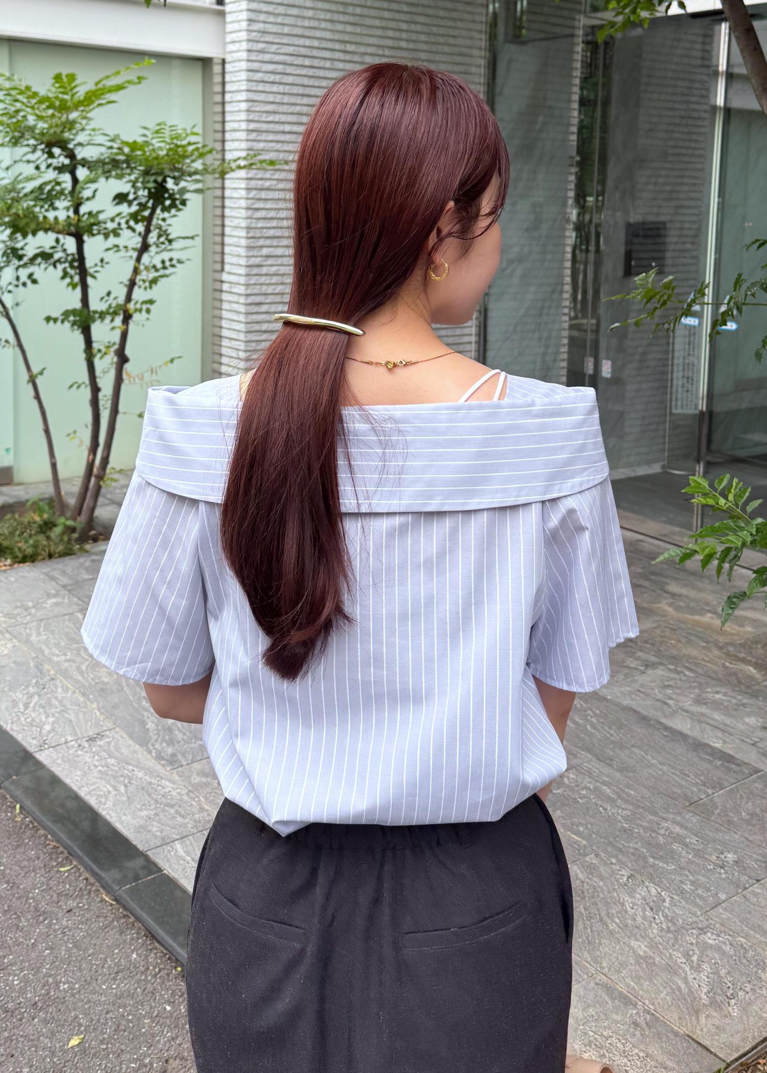 VIS【新色追加】【防シワ】ラメミックスオフショルダー風ストライプシャツライトグレー / F¥5,489レビュー素材感はしっかりとしたハリのあるシャツです!なので、シワになりにくく、襟の部分もお洗濯しても取れにくいです◎
