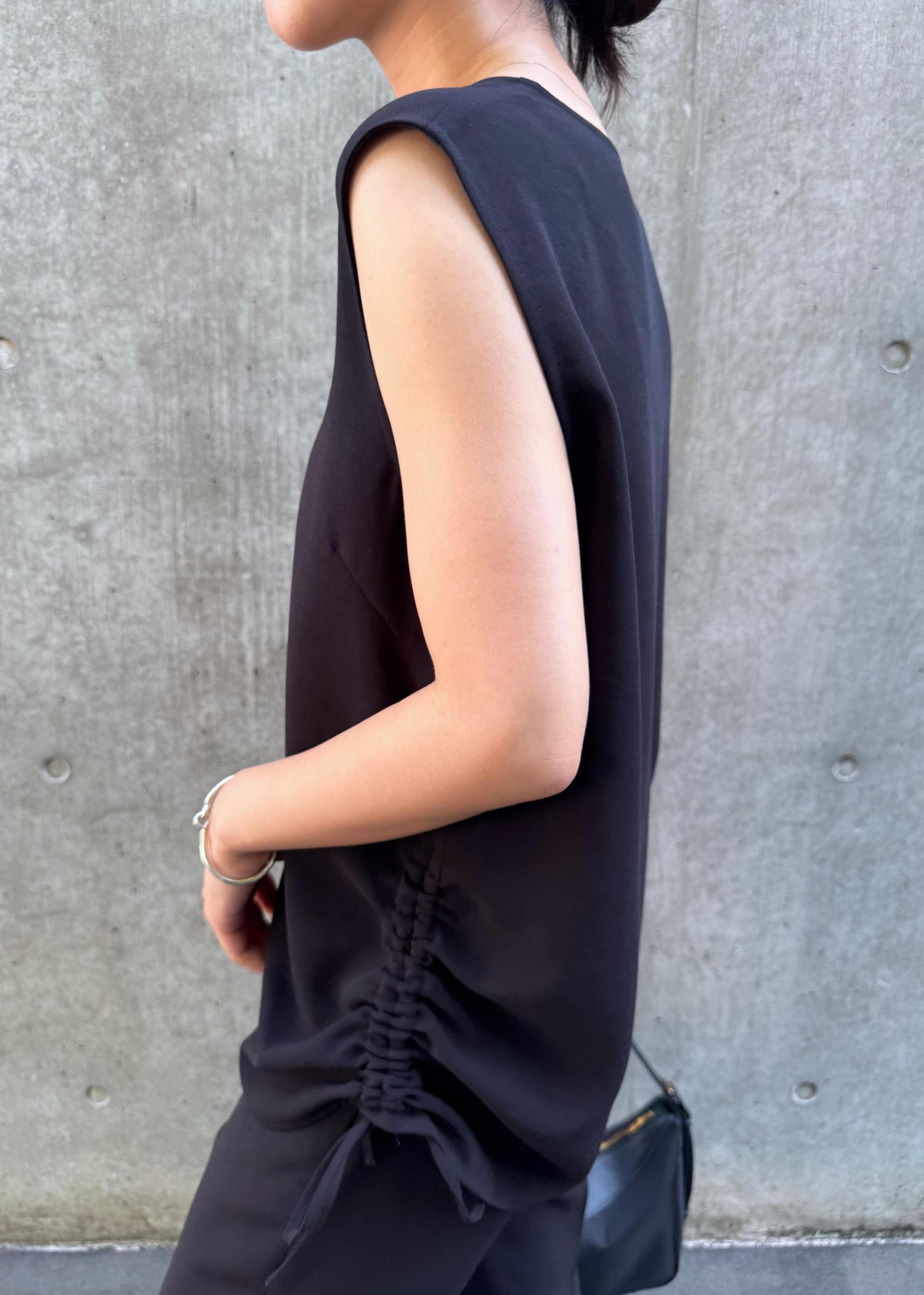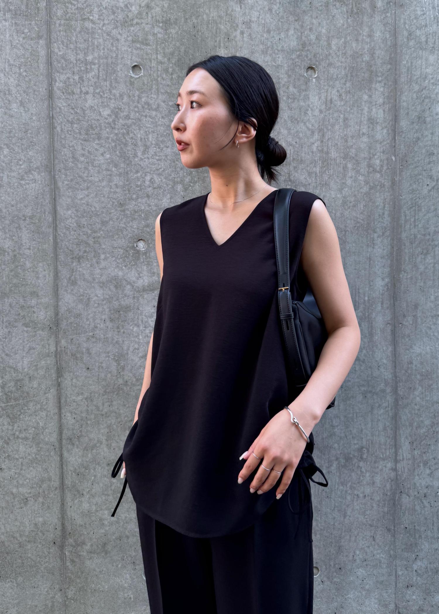 アウトレットROPÉ【WEB・一部店舗限定】バックサテンドロストVネックブラウス/洗えるブラック / F¥10,780レビュー163cmでFサイズ着用。