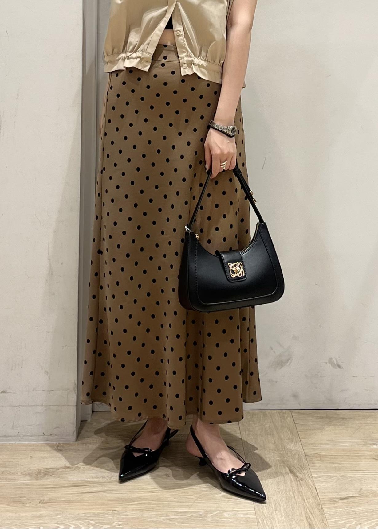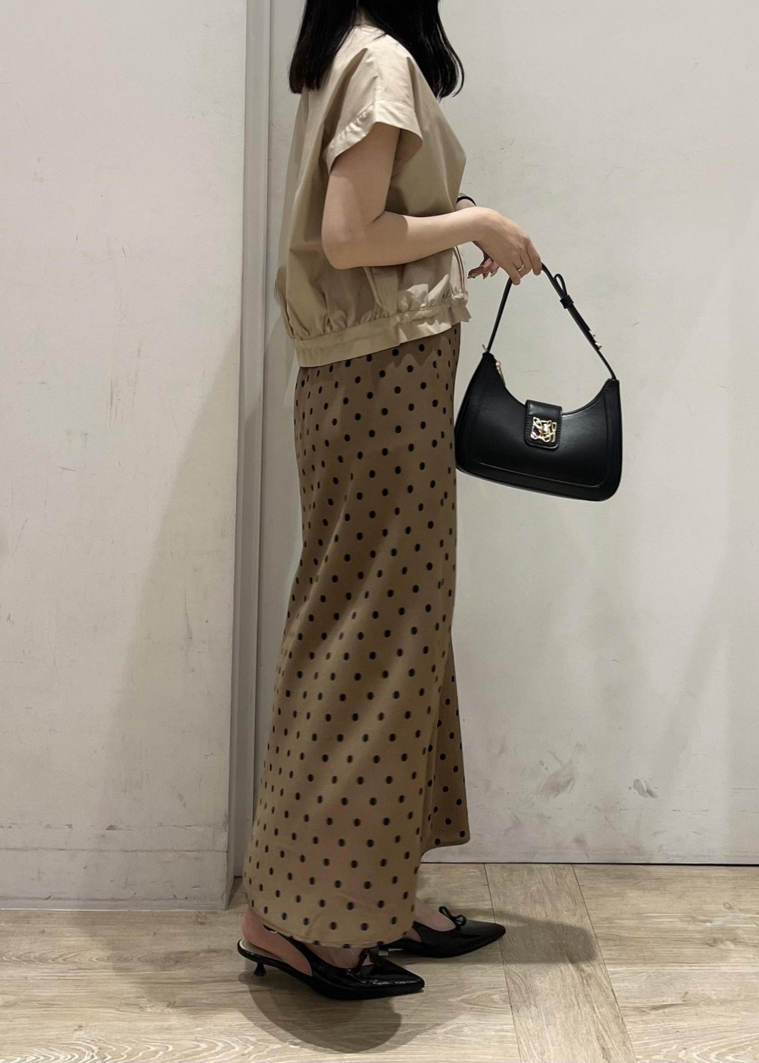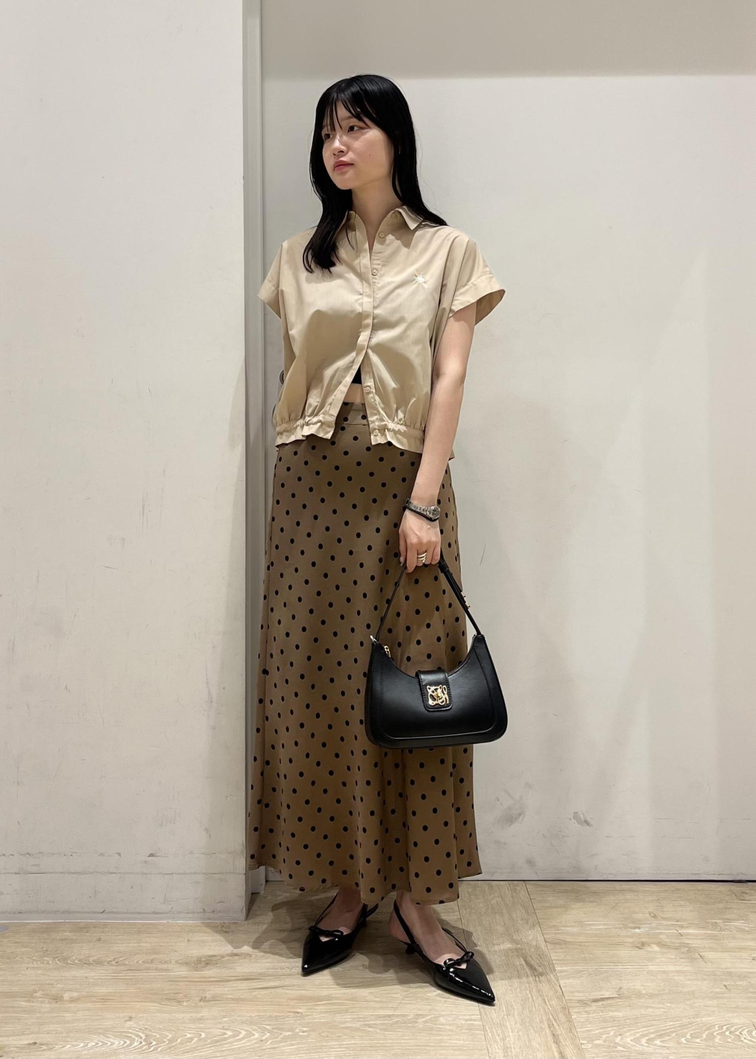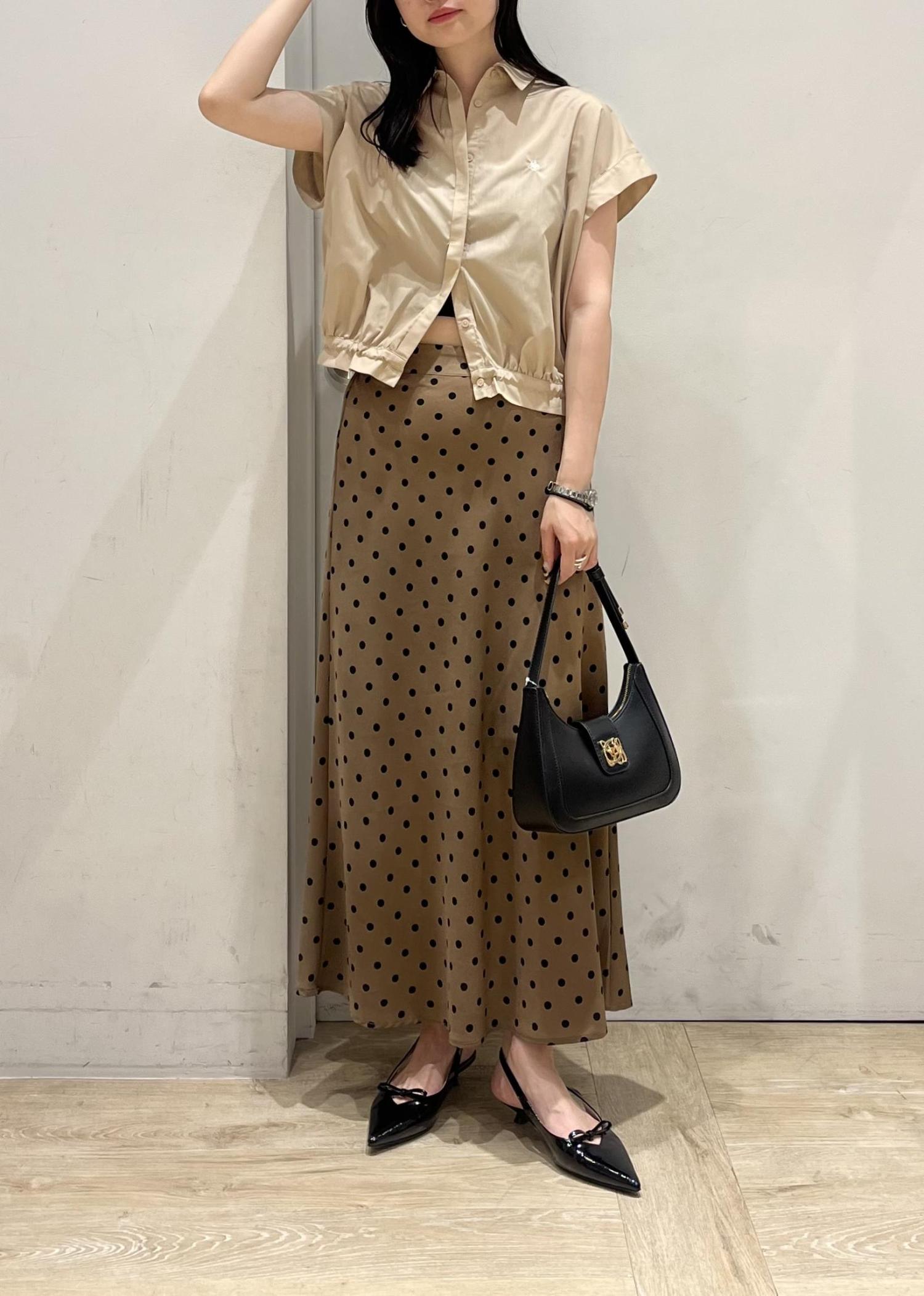 ドット柄のスカートがフェミニンさもありつつ、パリッとしたシャツで大人っぽさもしっかり出るフェミニンハンサムコーデに。