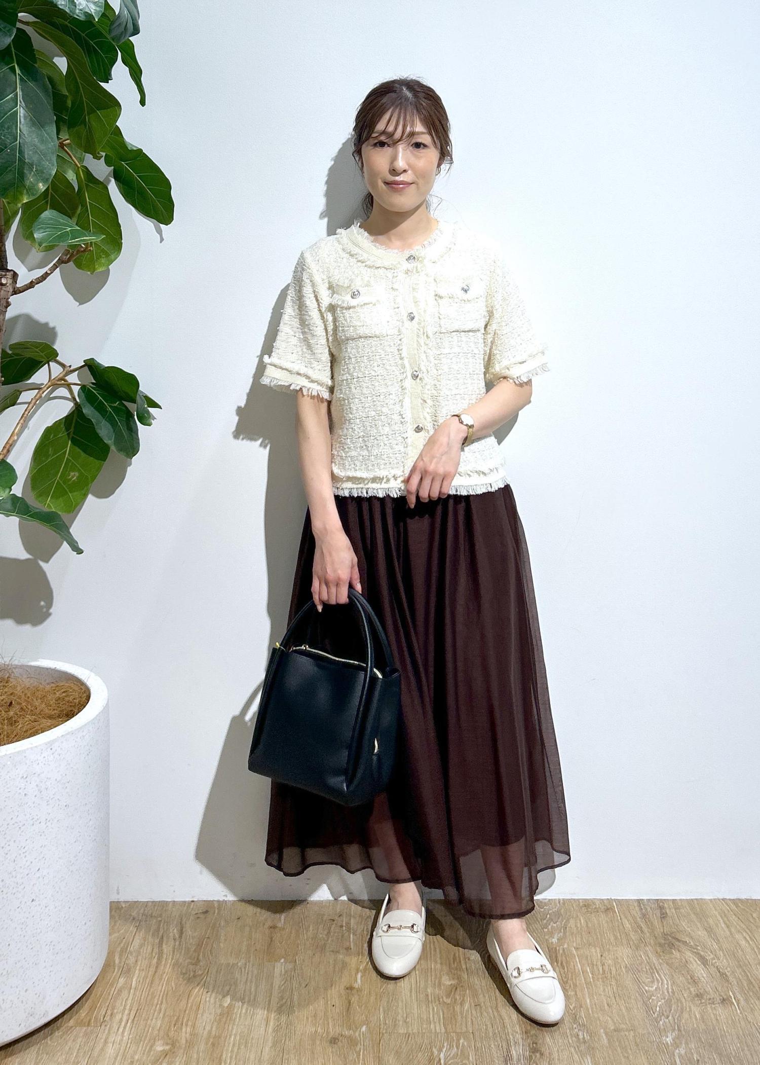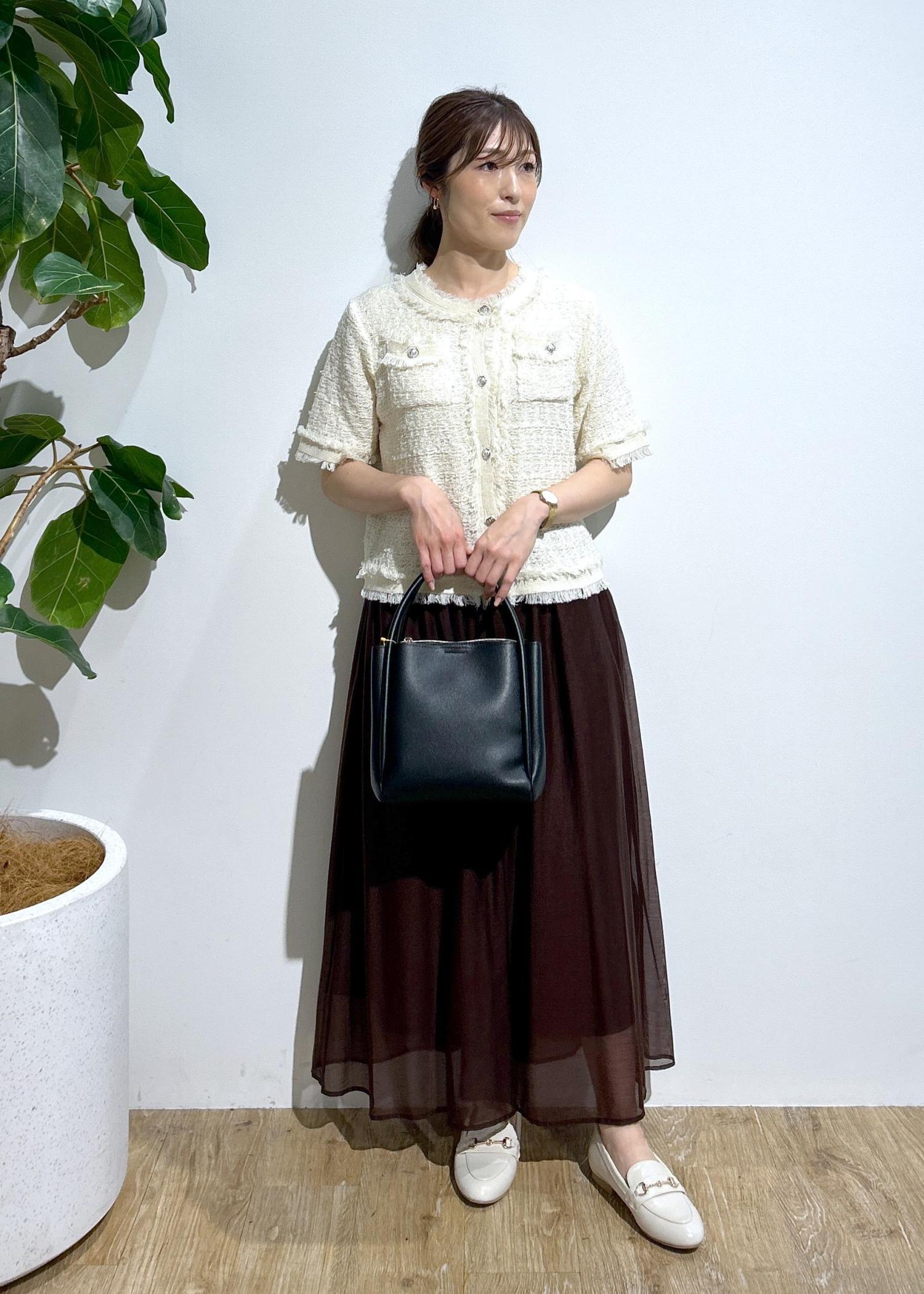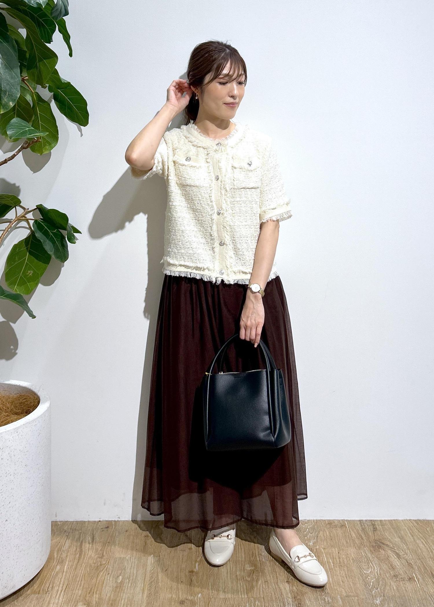 シアースカートにツイードカーディガンを合わせた夏らしいコーディネートです。