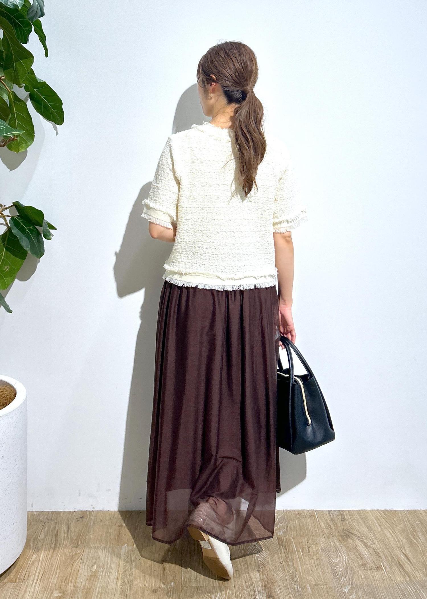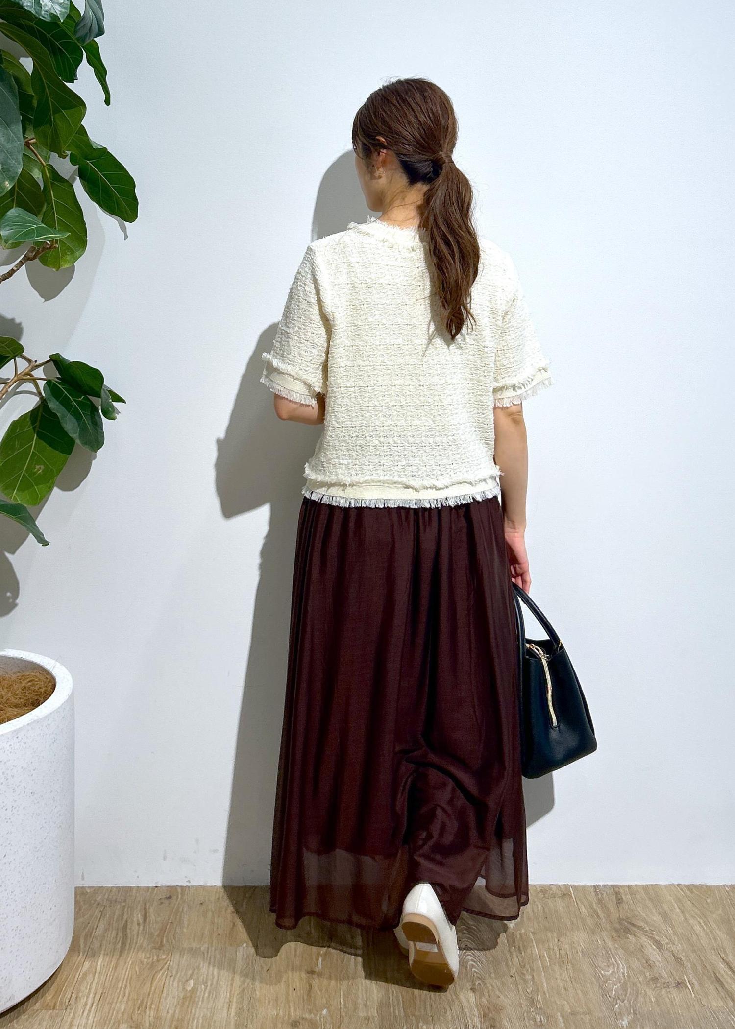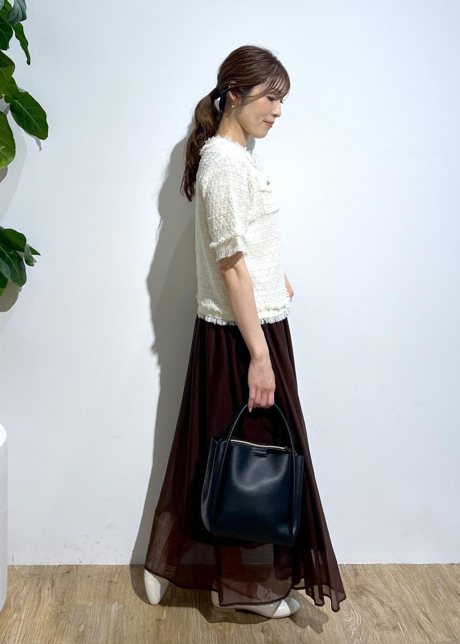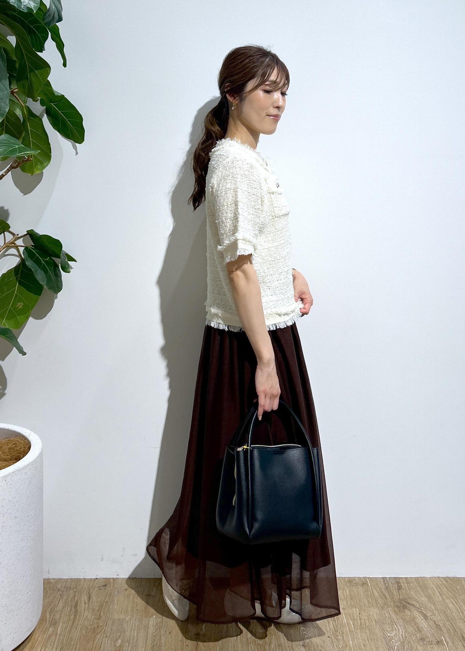 シアースカートにツイードカーディガンを合わせた夏らしいコーディネートです。