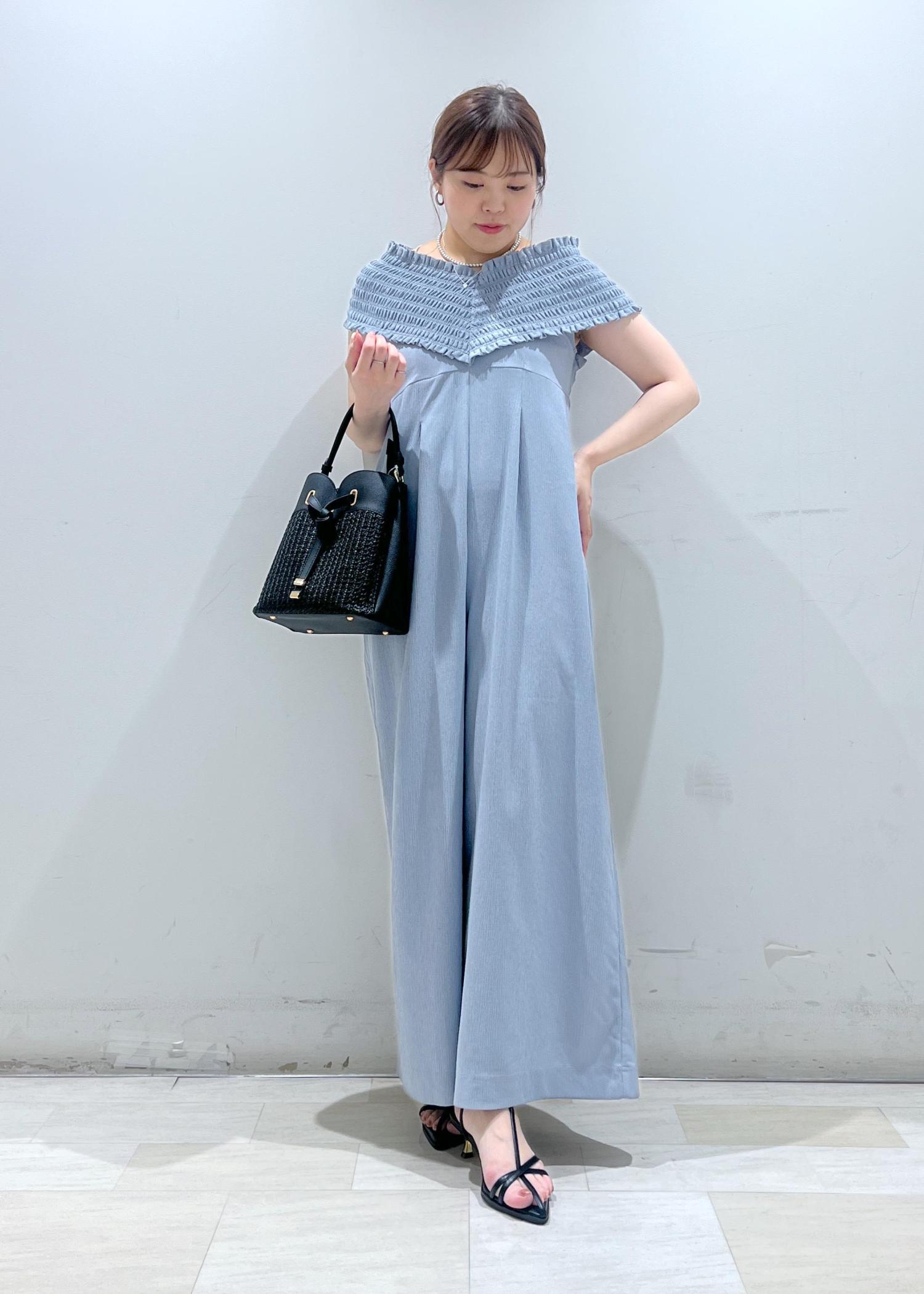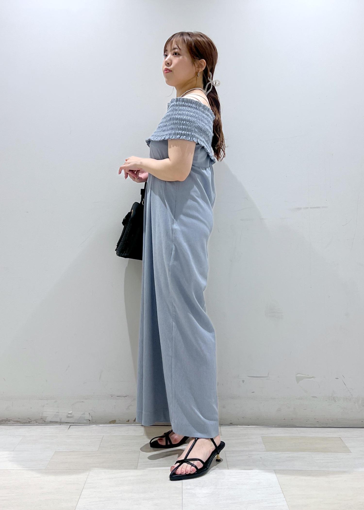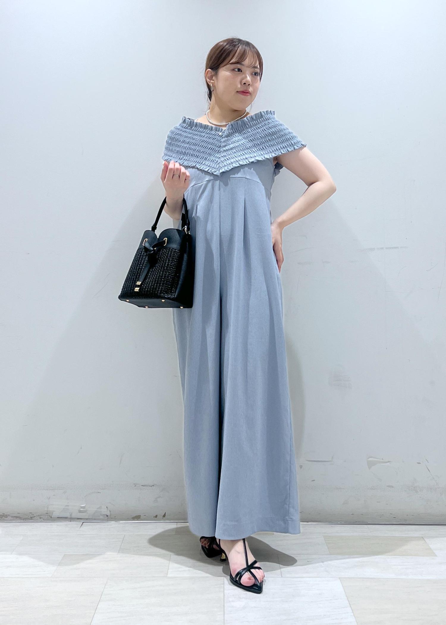 ブルーの涼しげな色味と肩〜胸元のシャーリングデザインがとても可愛いオールインワンです!