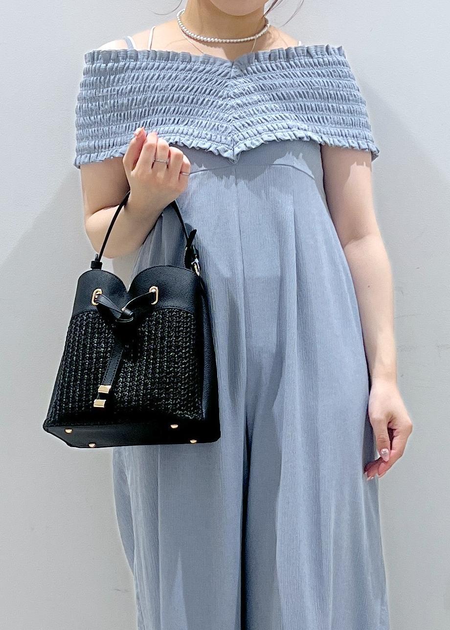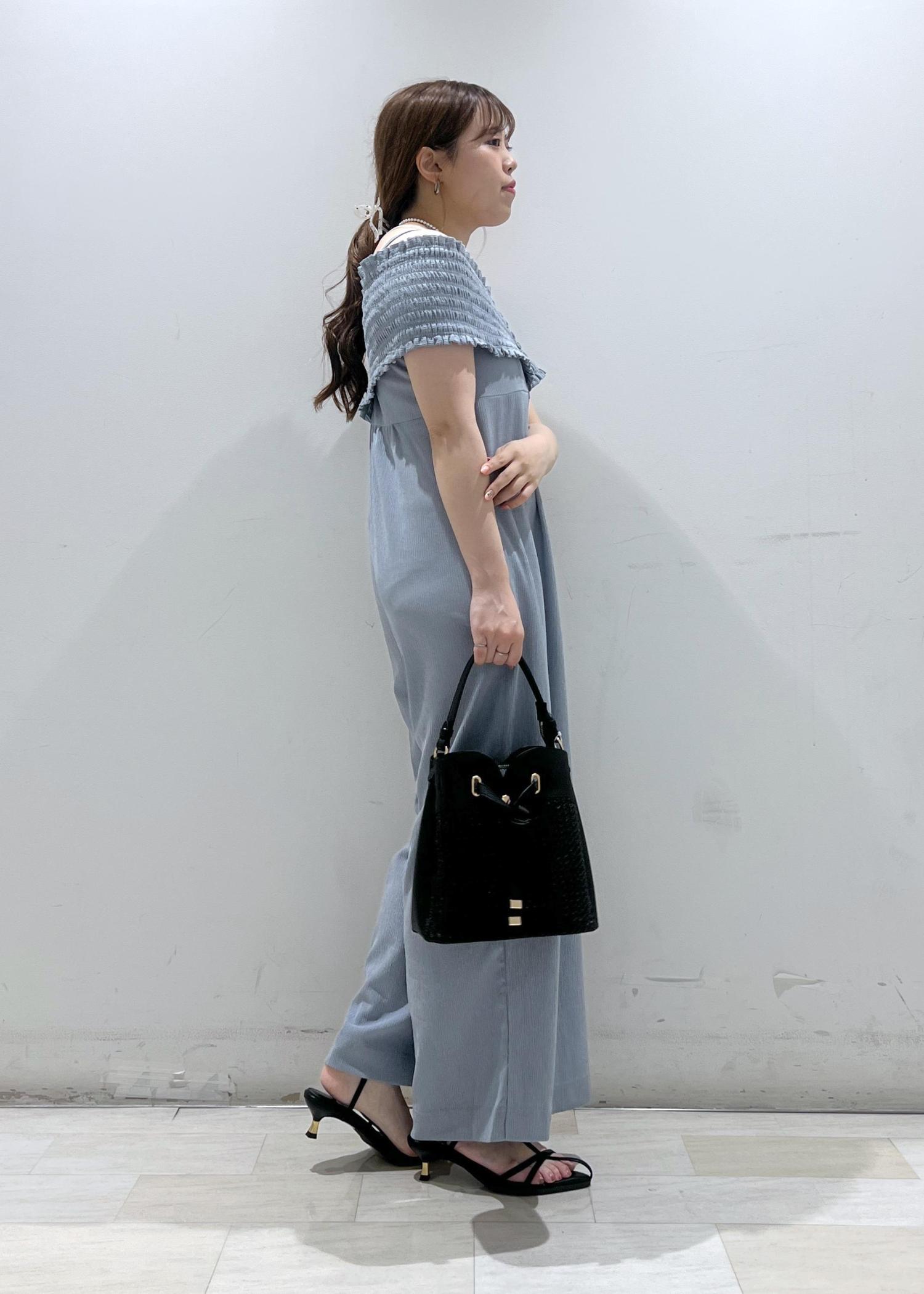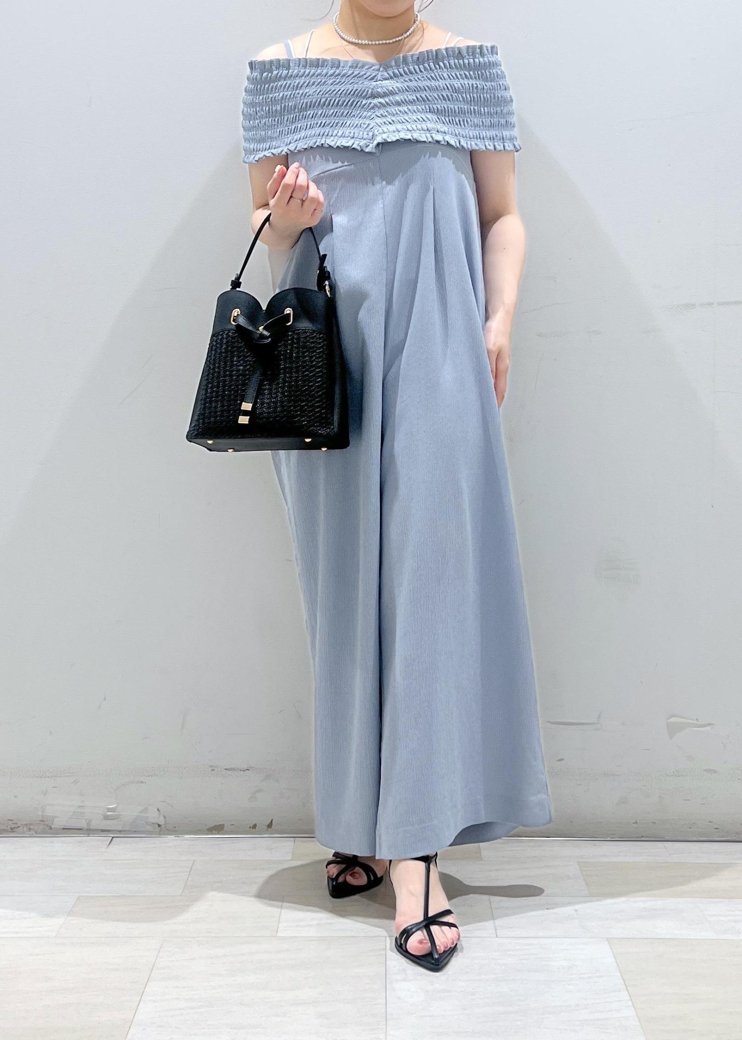 ブルーの涼しげな色味と肩〜胸元のシャーリングデザインがとても可愛いオールインワンです!