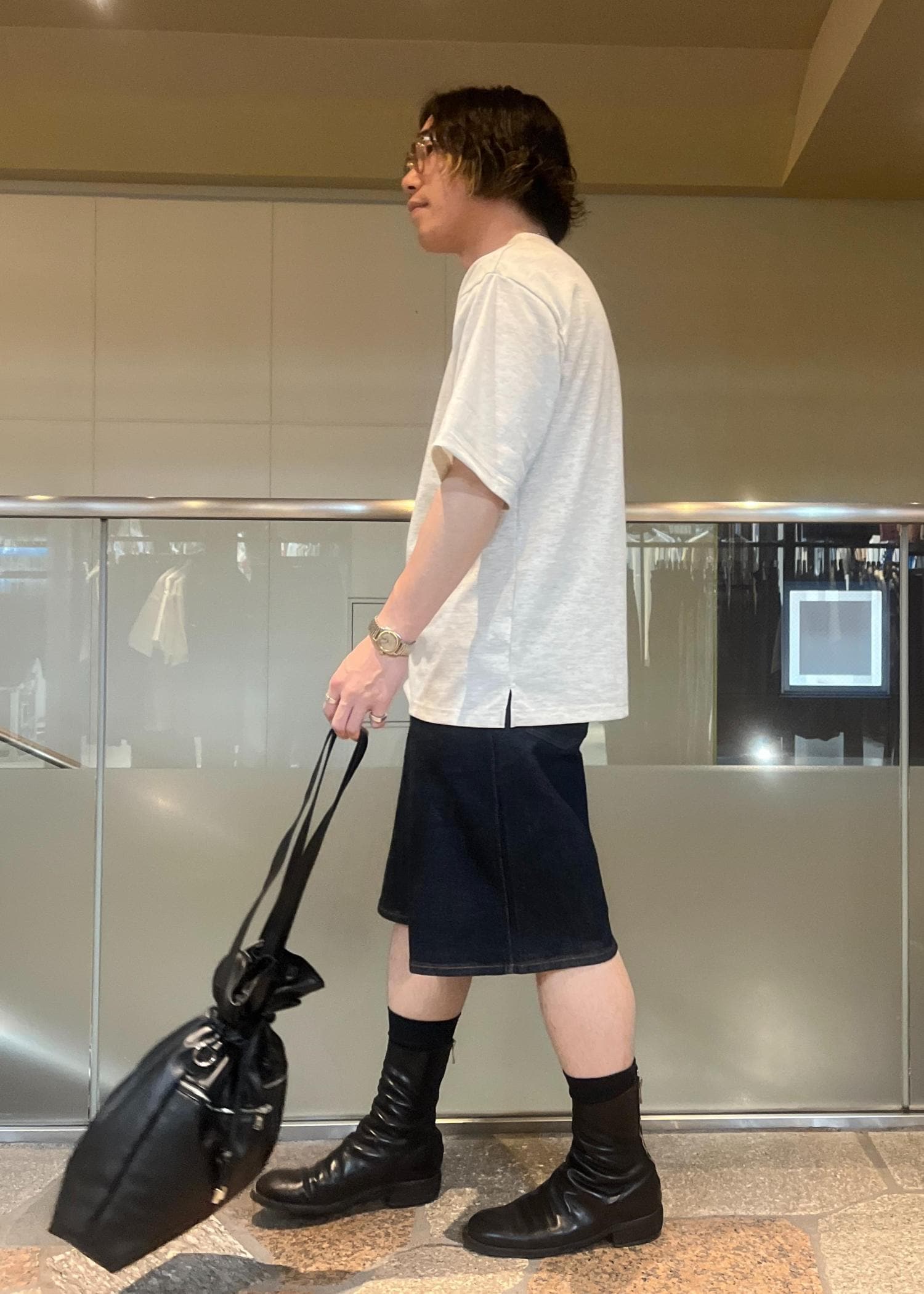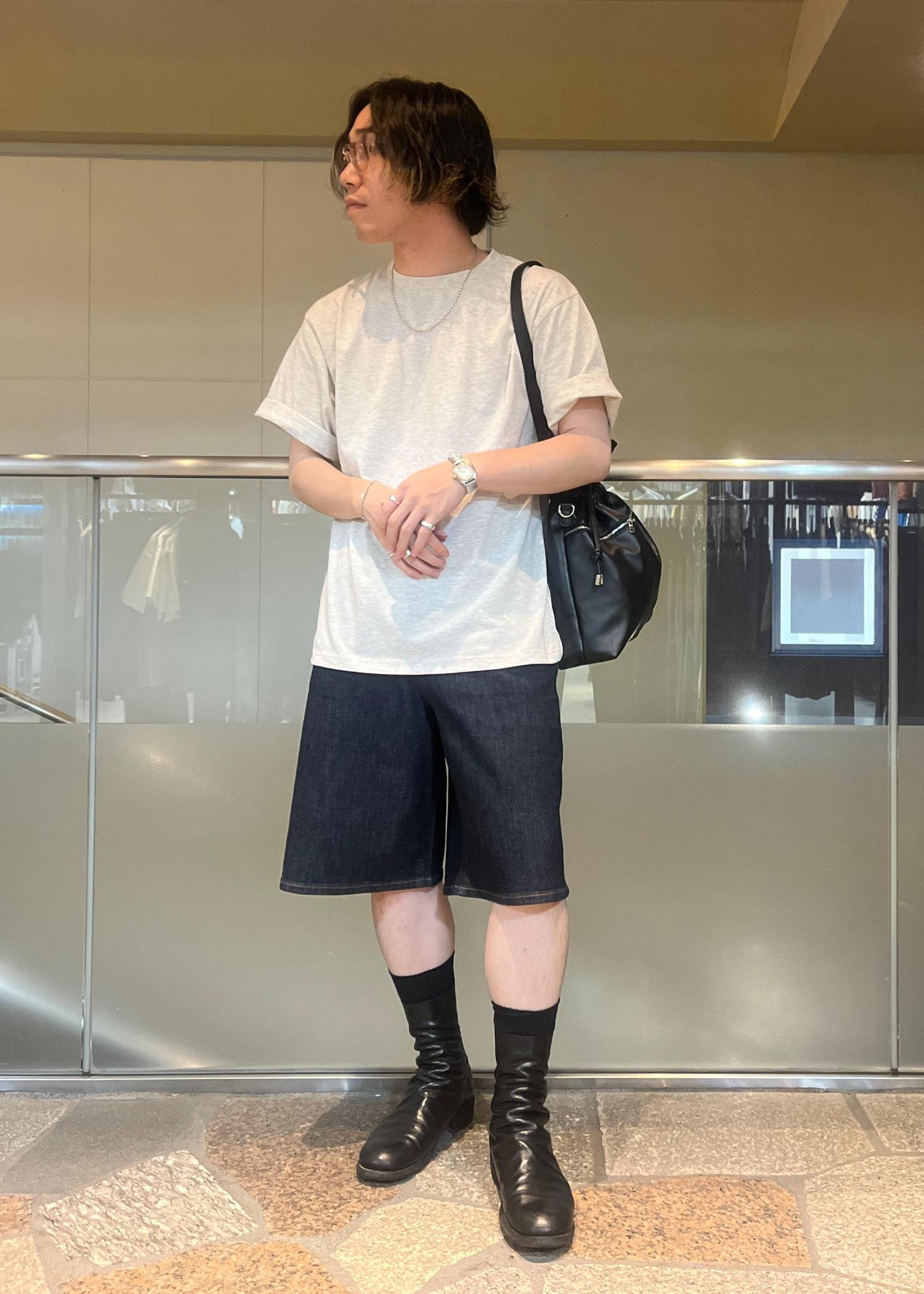 杢グレーのTシャツにデニムショーツを合わせたスタイル。
