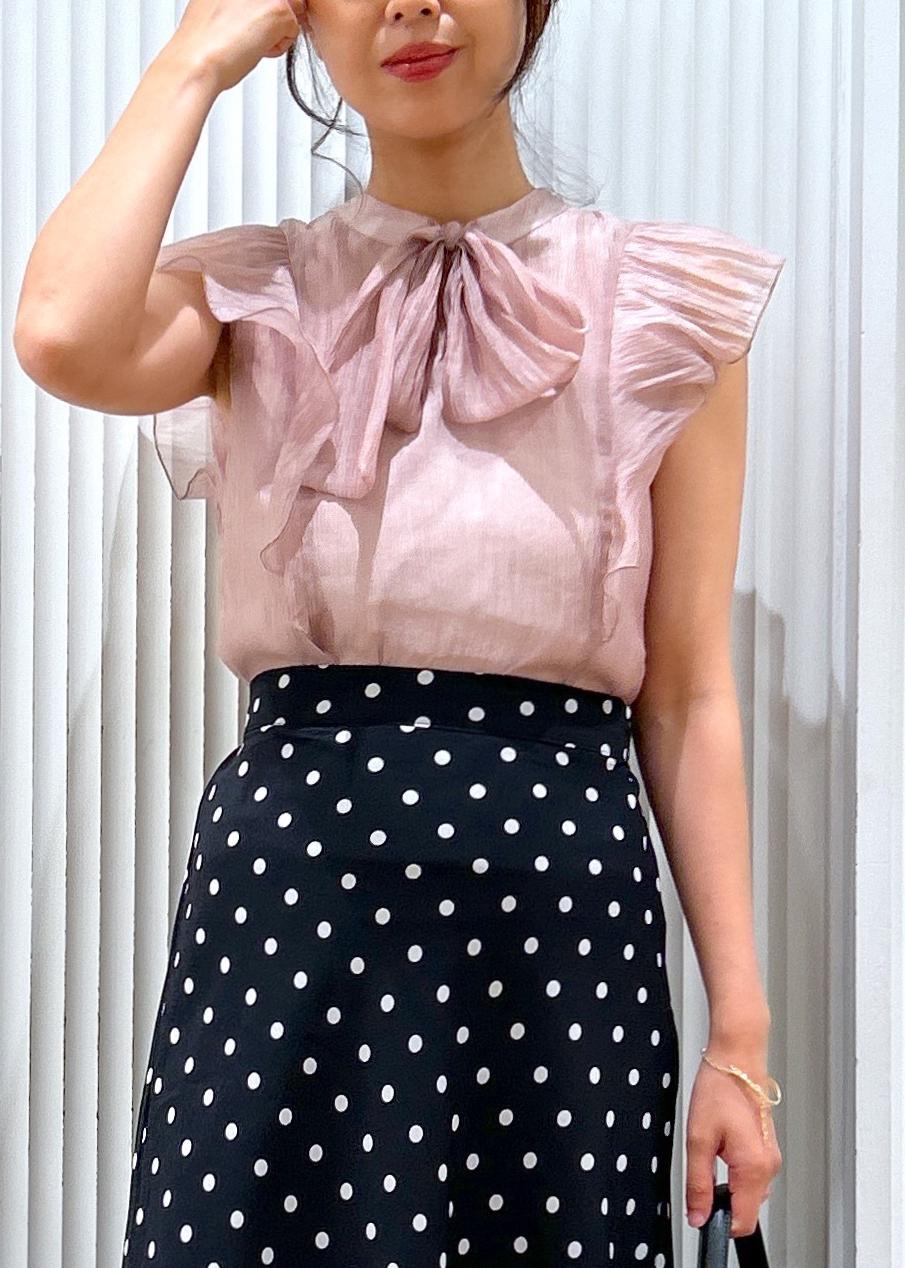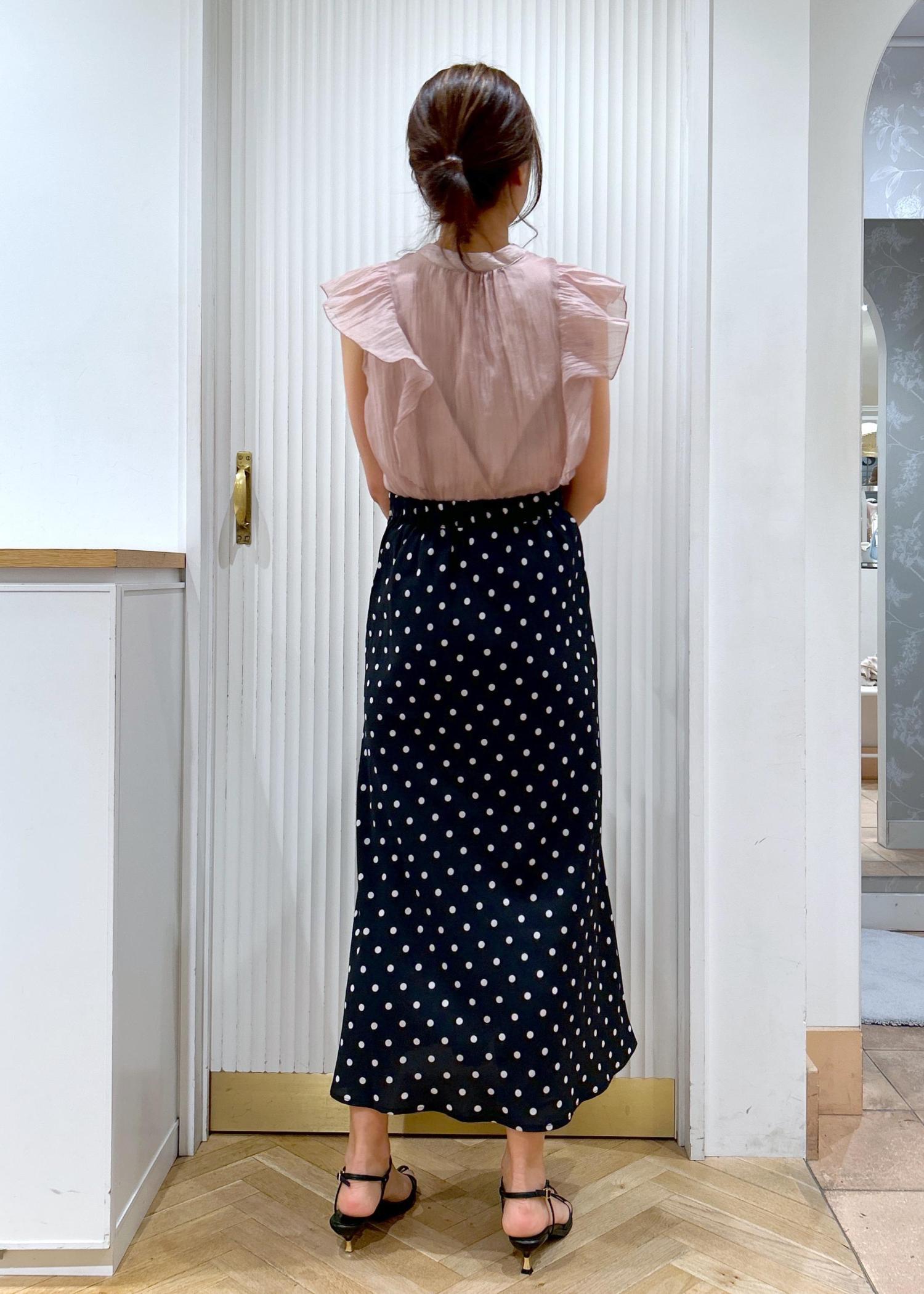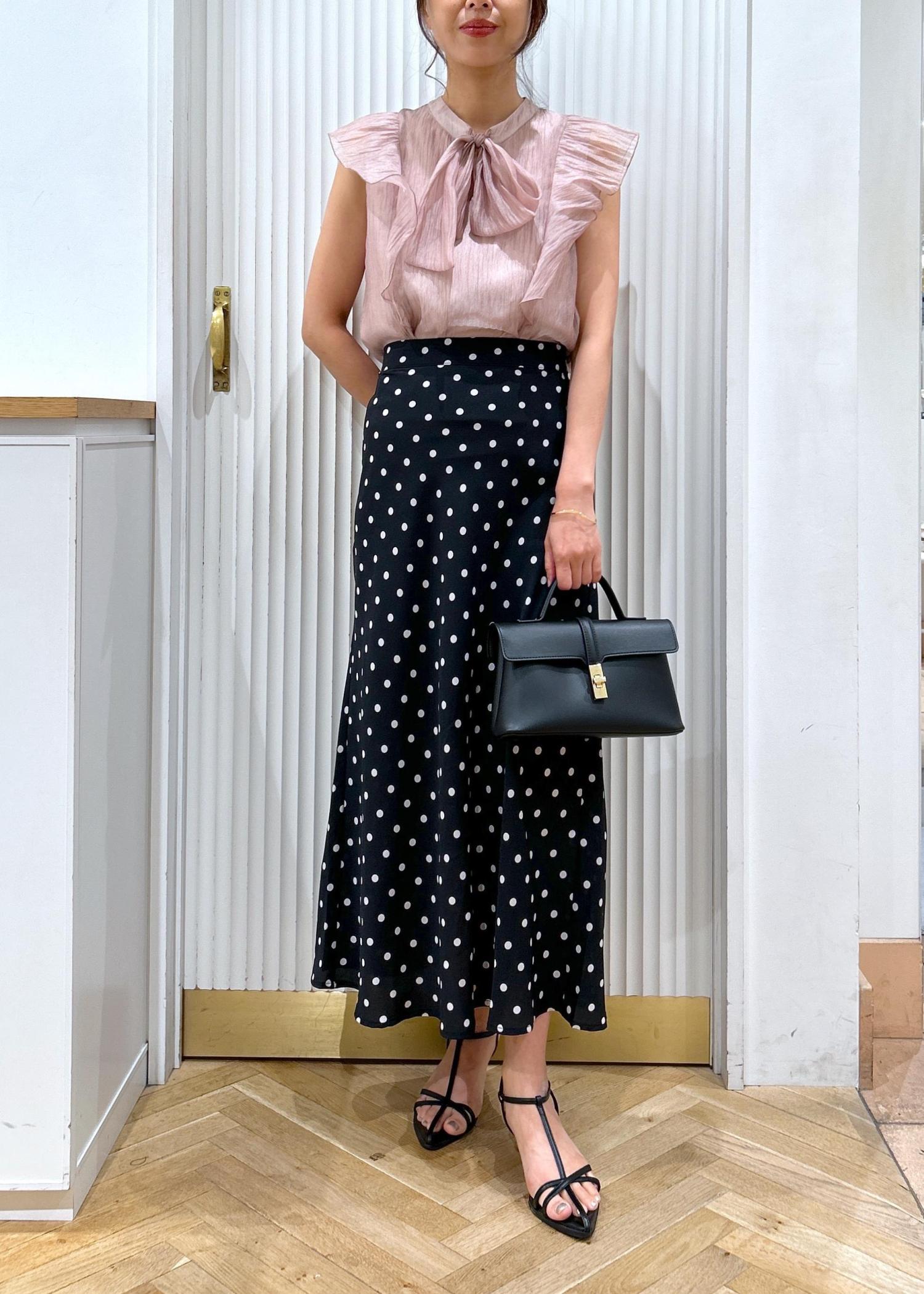 ピンクのブラウスにドットのスカートを合わせた