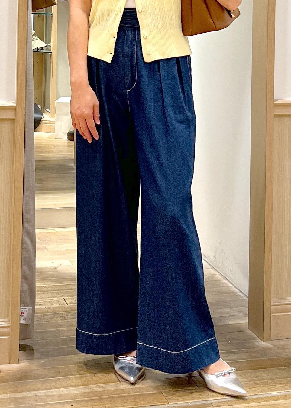 アウトレットVISタックデザインリラックスデニムパンツブルー / M¥3,460レビューデニムのワイドパンツです。ゆるっとしたラインと薄手の生地で軽やかに履けるパンツです。濃いほうのカラーは白いステッチがポイントになります。ウエストはホックとスナップボタンのデザインです!