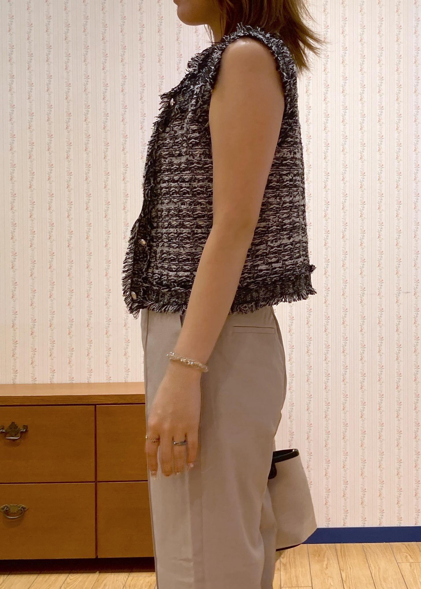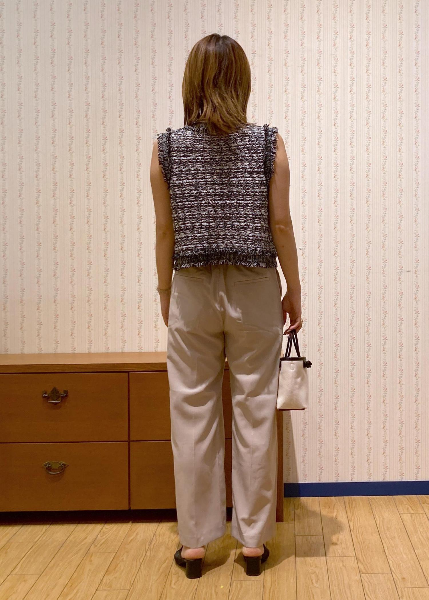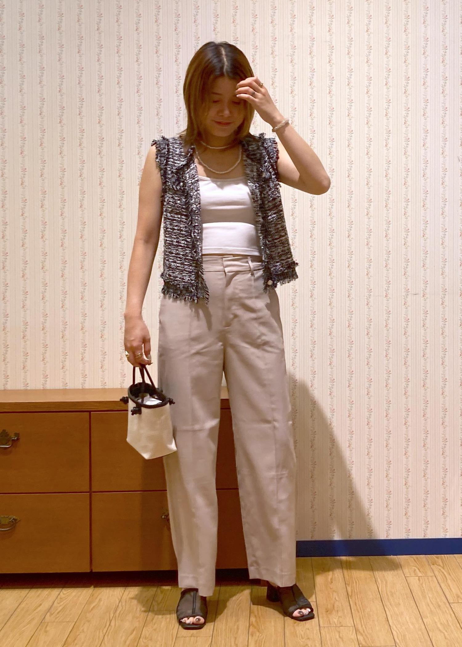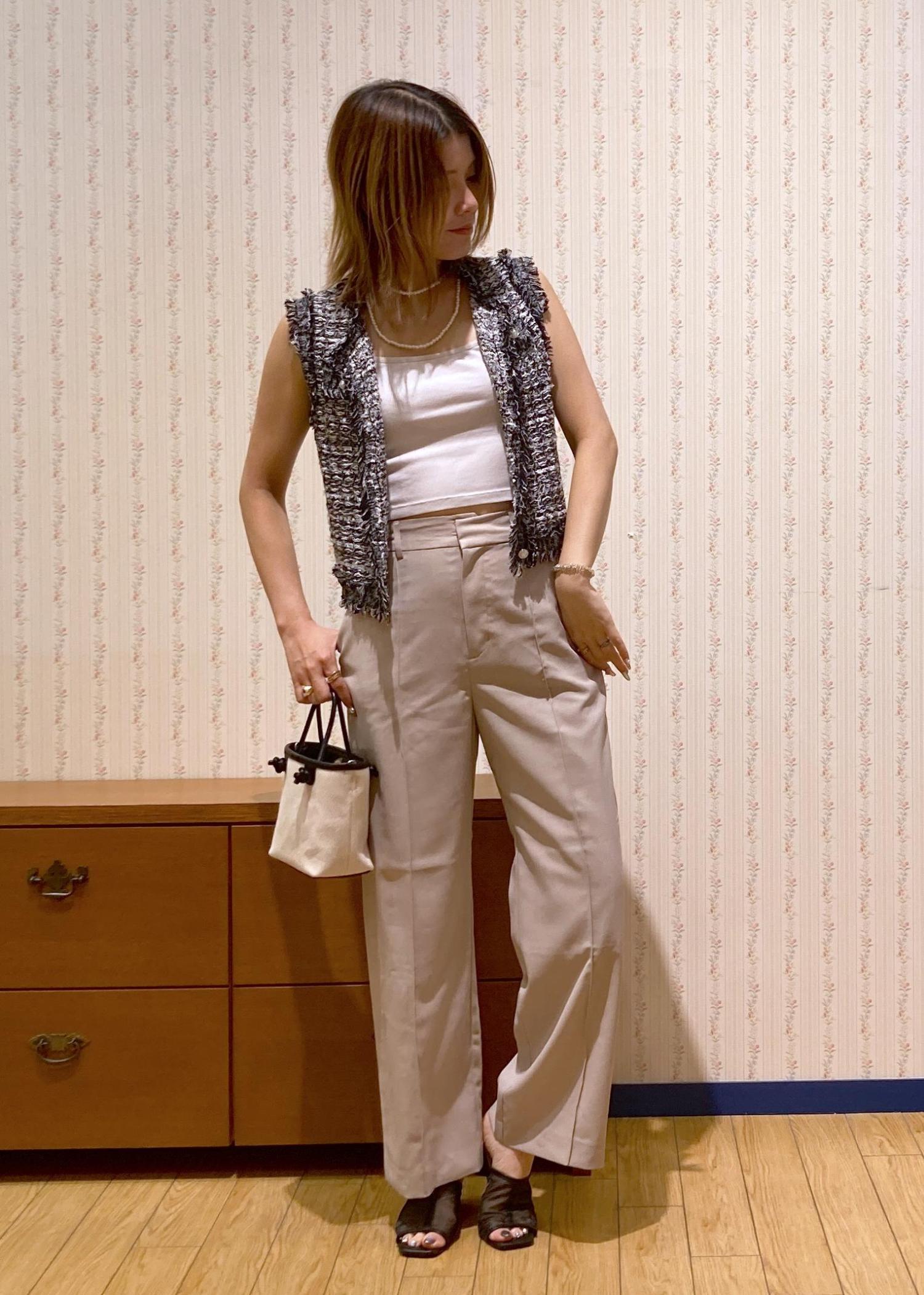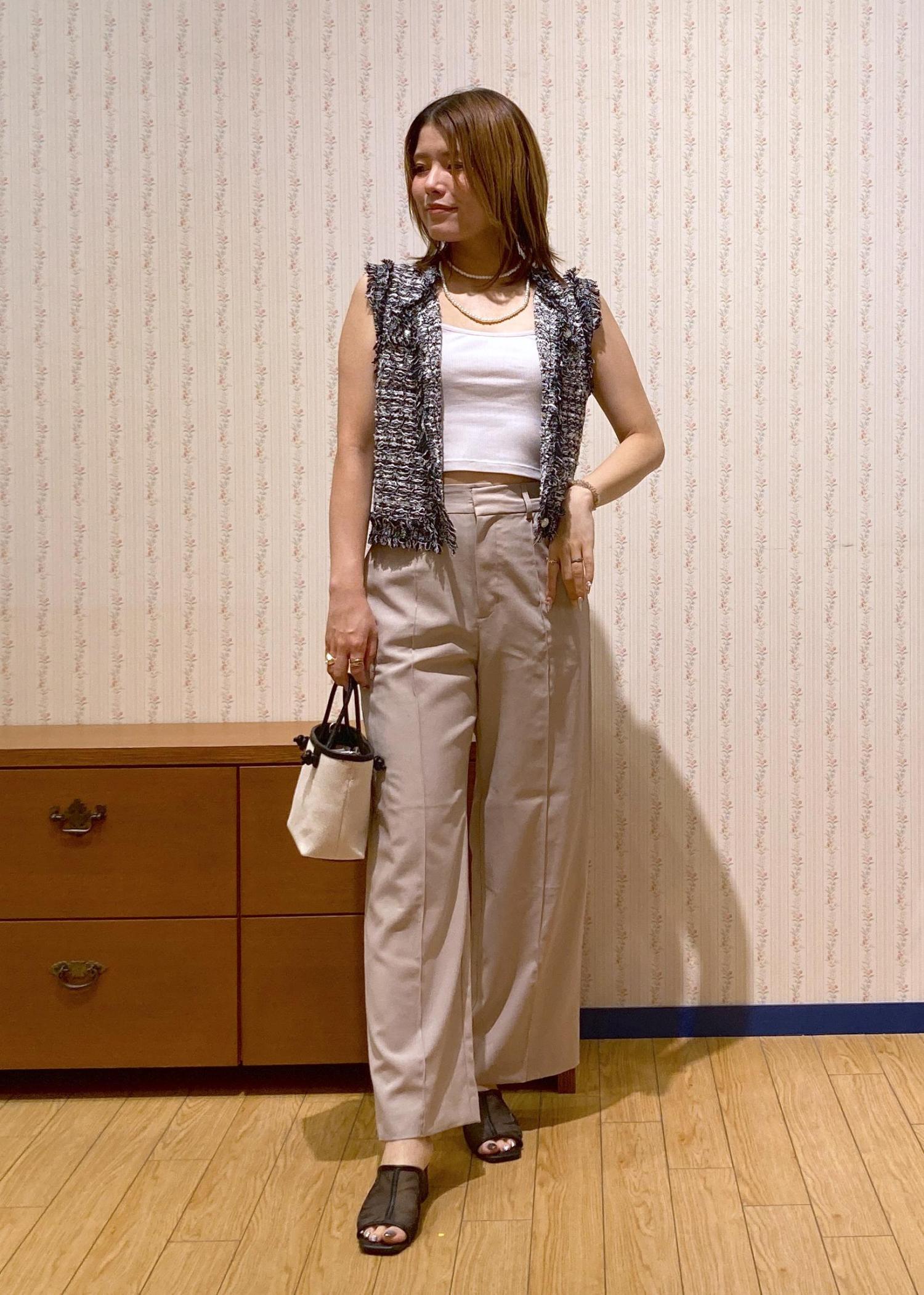 ブラック系のツイードジレにベージュパンツを合わせた綺麗めカジュアルコーディネートです。