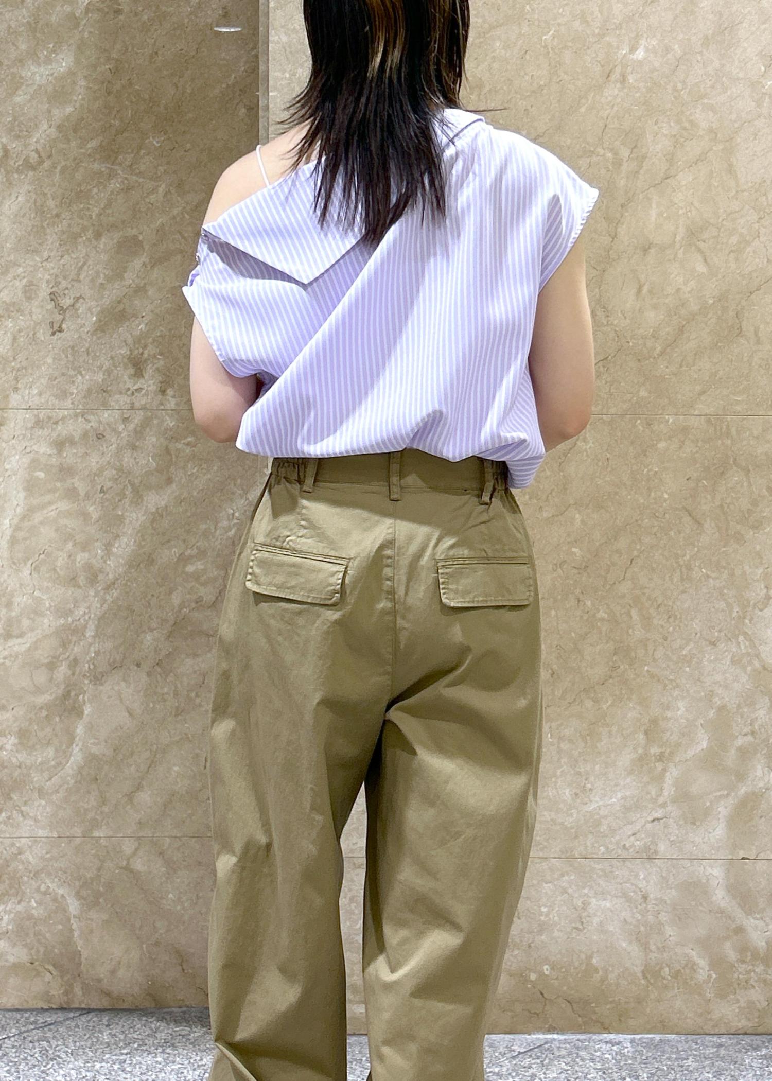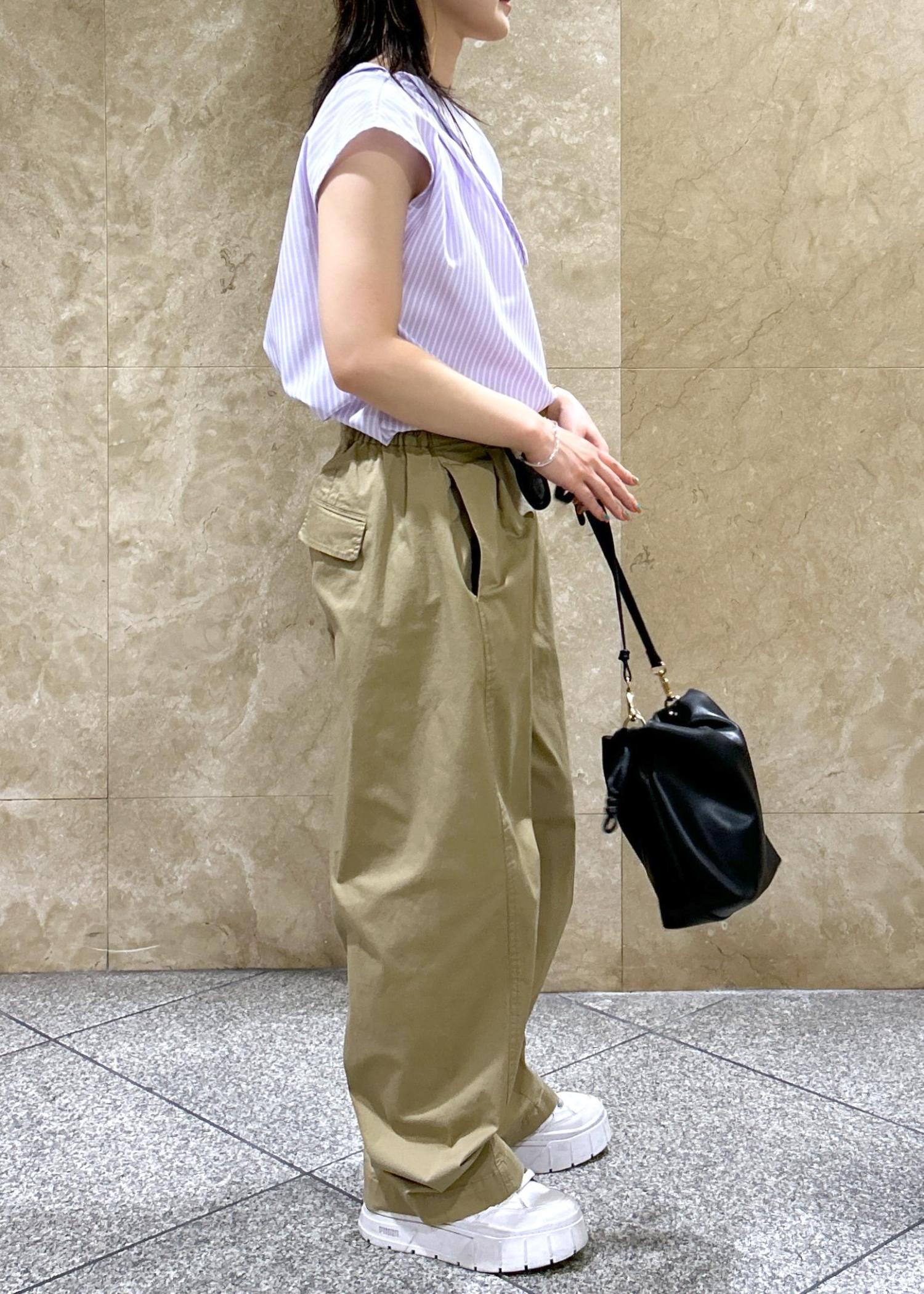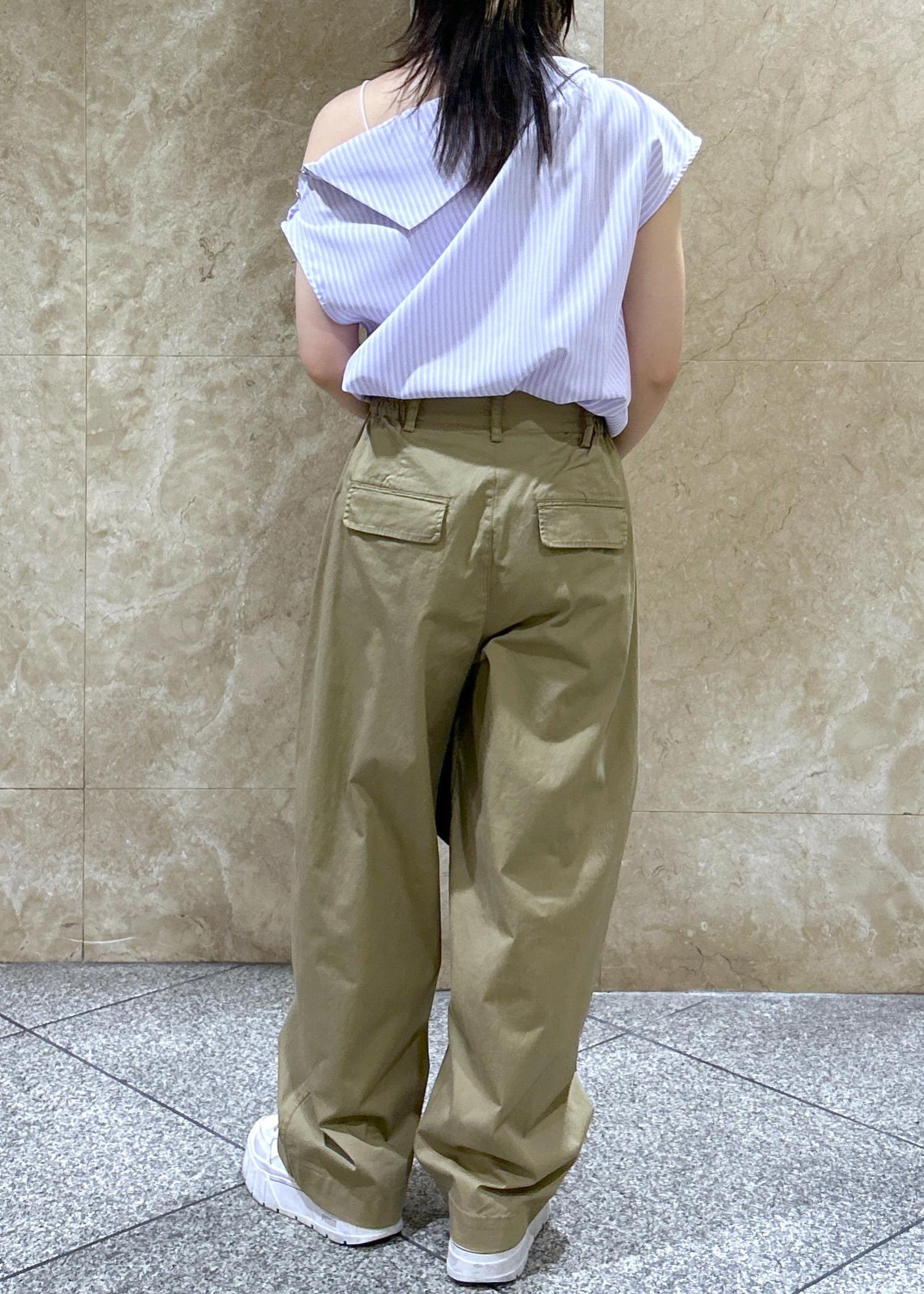 ウエストのボタンがベルトいらずで腰位置を高く見せてくれます◎