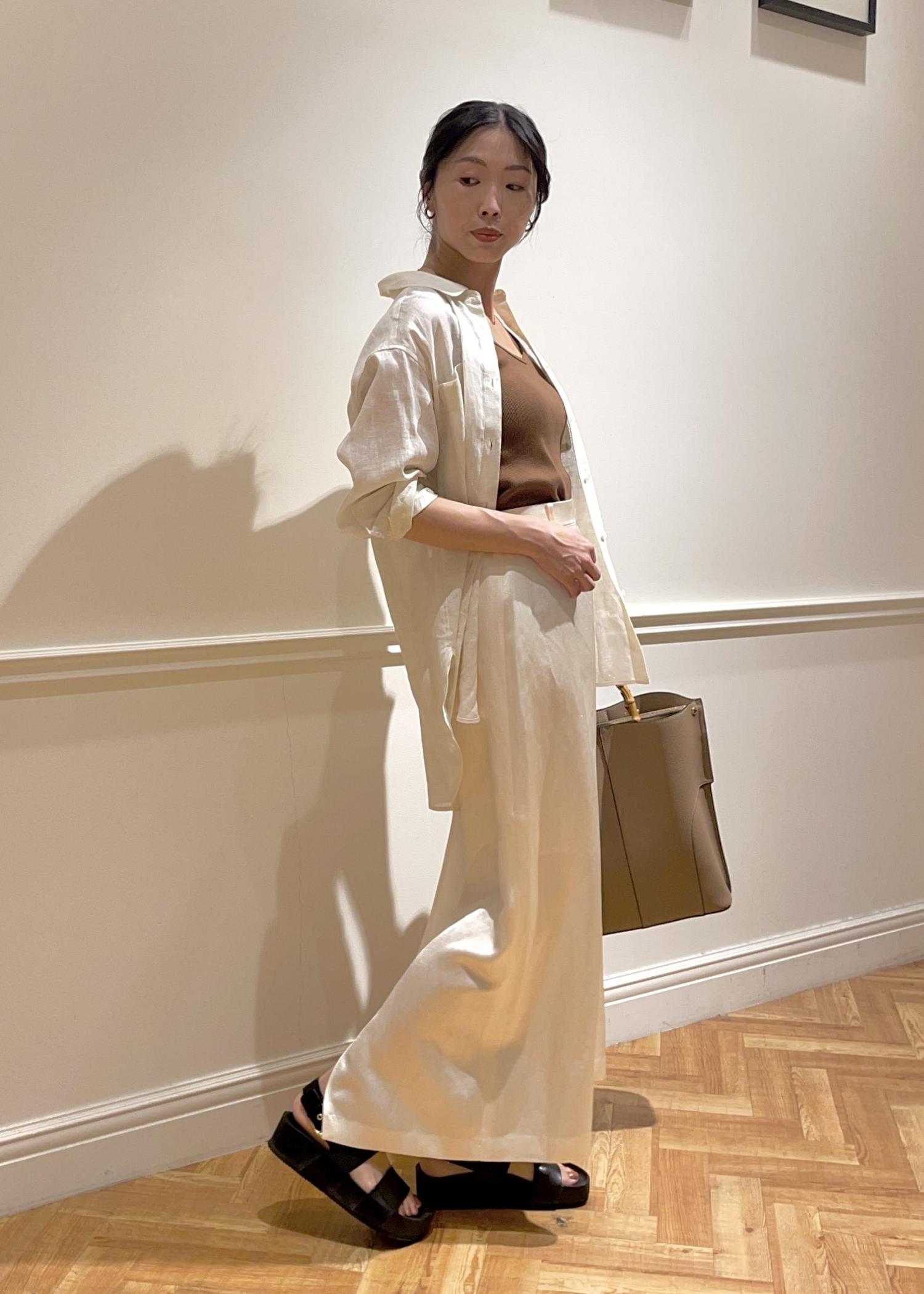 シワが残りにくく、リネン素材でも柔らかく肌触りの良い生地感です。