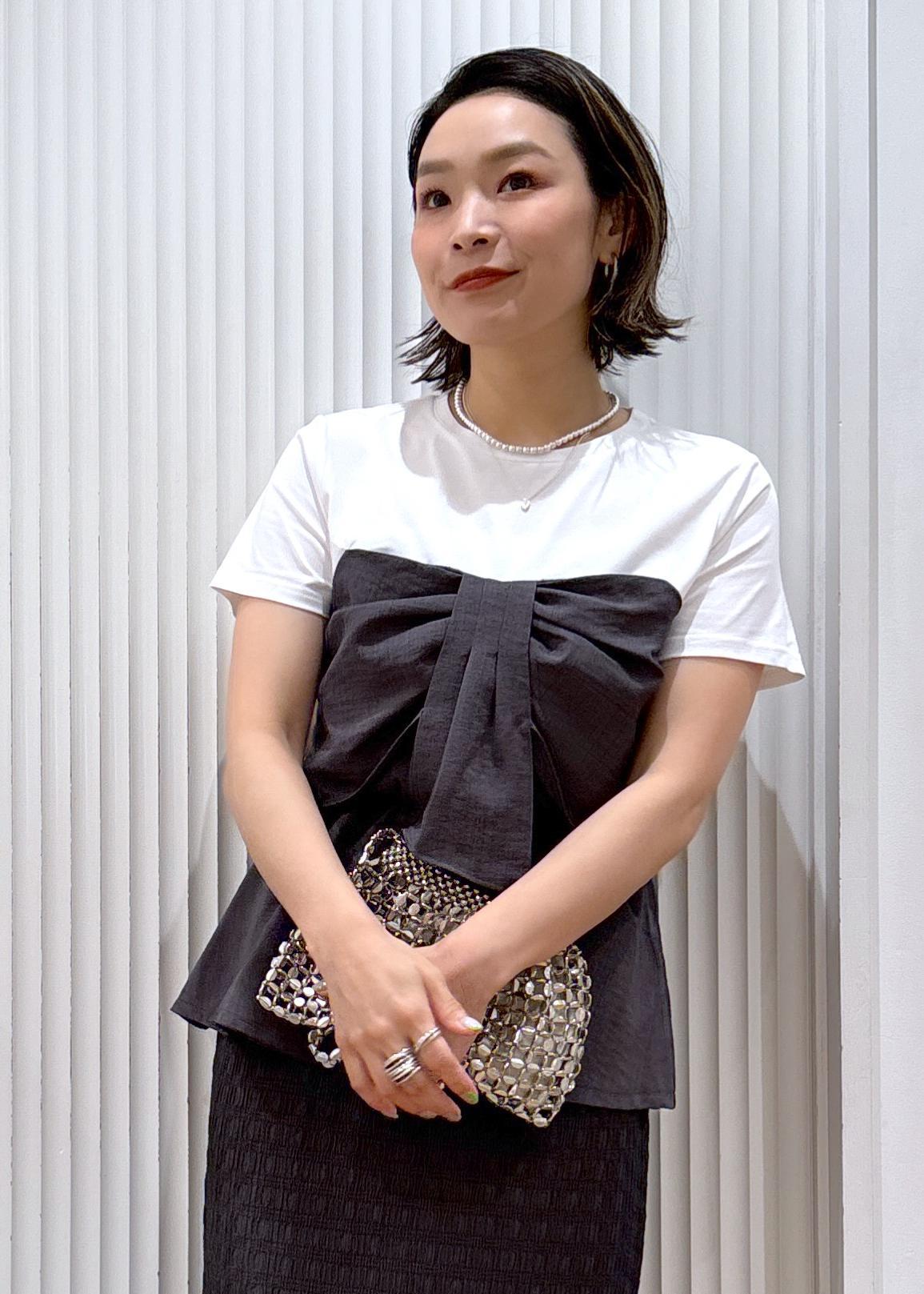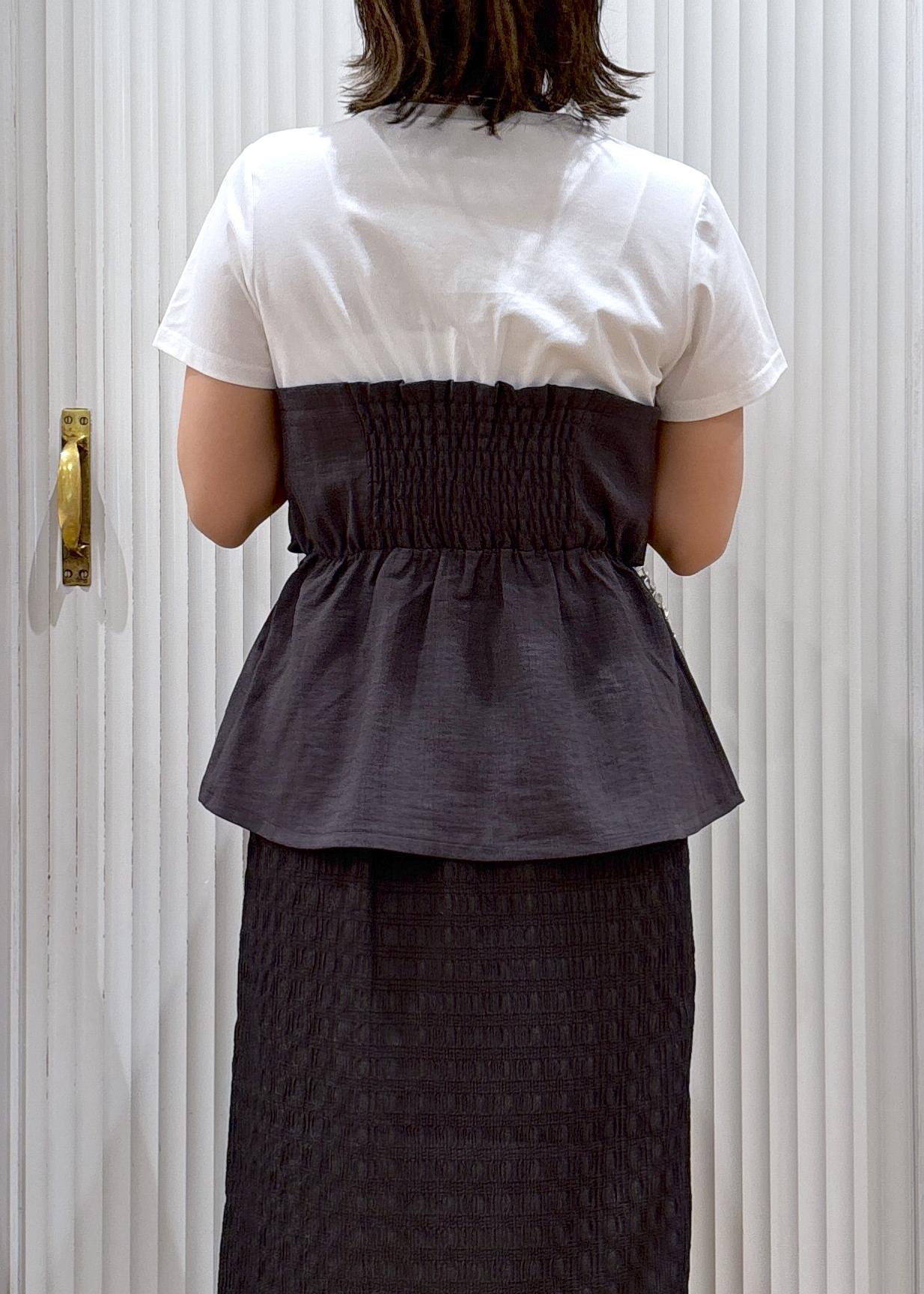 VIS【新色追加】【美easy】ねじりリボンTシャツドッキングプルオーバー【接触冷感/洗える】チャコール / F¥5,489レビュー全体的にコンパクトなサイズ感ですが首ぐりはやや広め。肩はパフスリーブのTシャツとのドッキング風トップスです。セットアップでの着用がお勧めですが、単体でもレイヤード風のデザインがおしゃれな雰囲気。