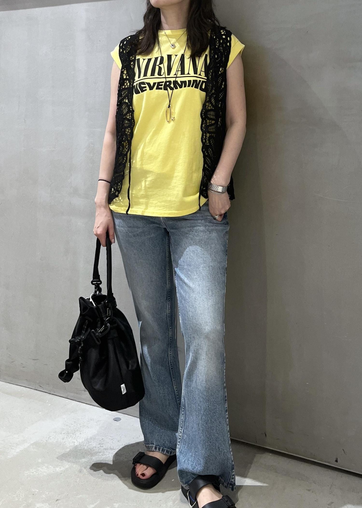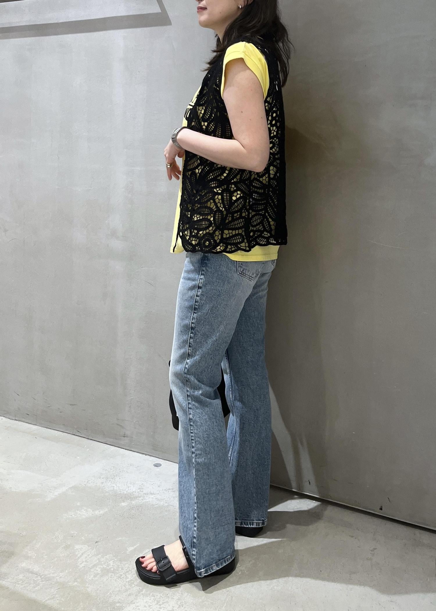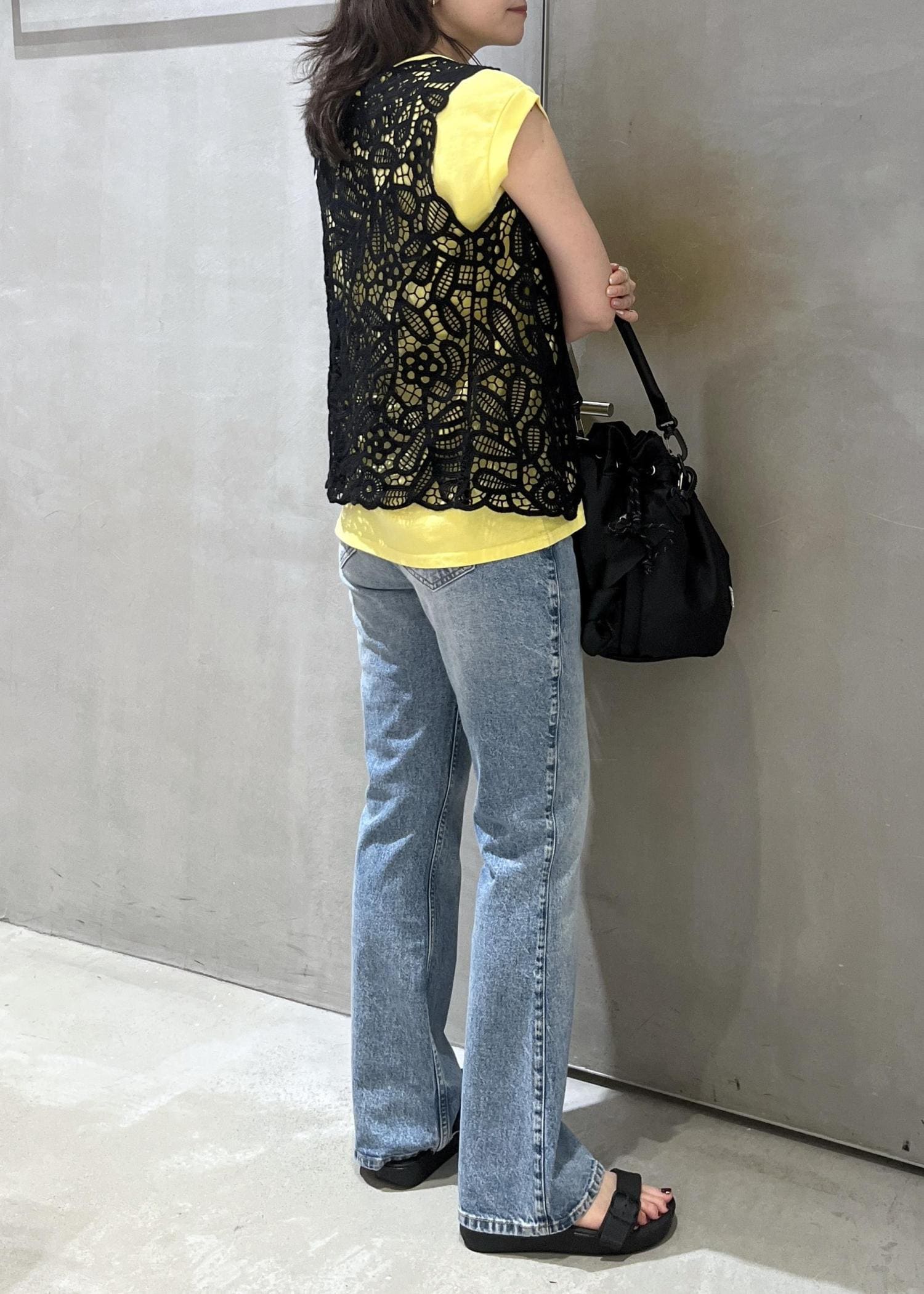 ポップなイエロー色なので、デニムとレースジレでより黄色が映えるコーディネートにしてみました。