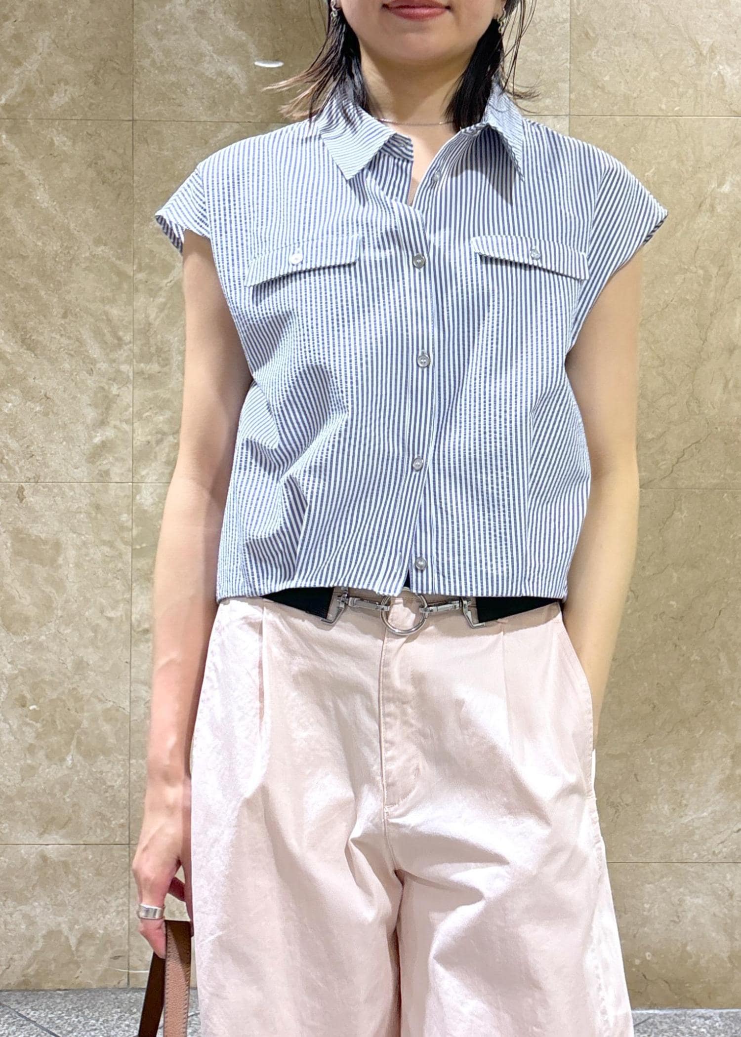 サッカー生地なので肌に触れる面積が少なく、ベタつかないので、汗ばむ時期にもぴったりの涼しいブラウス!