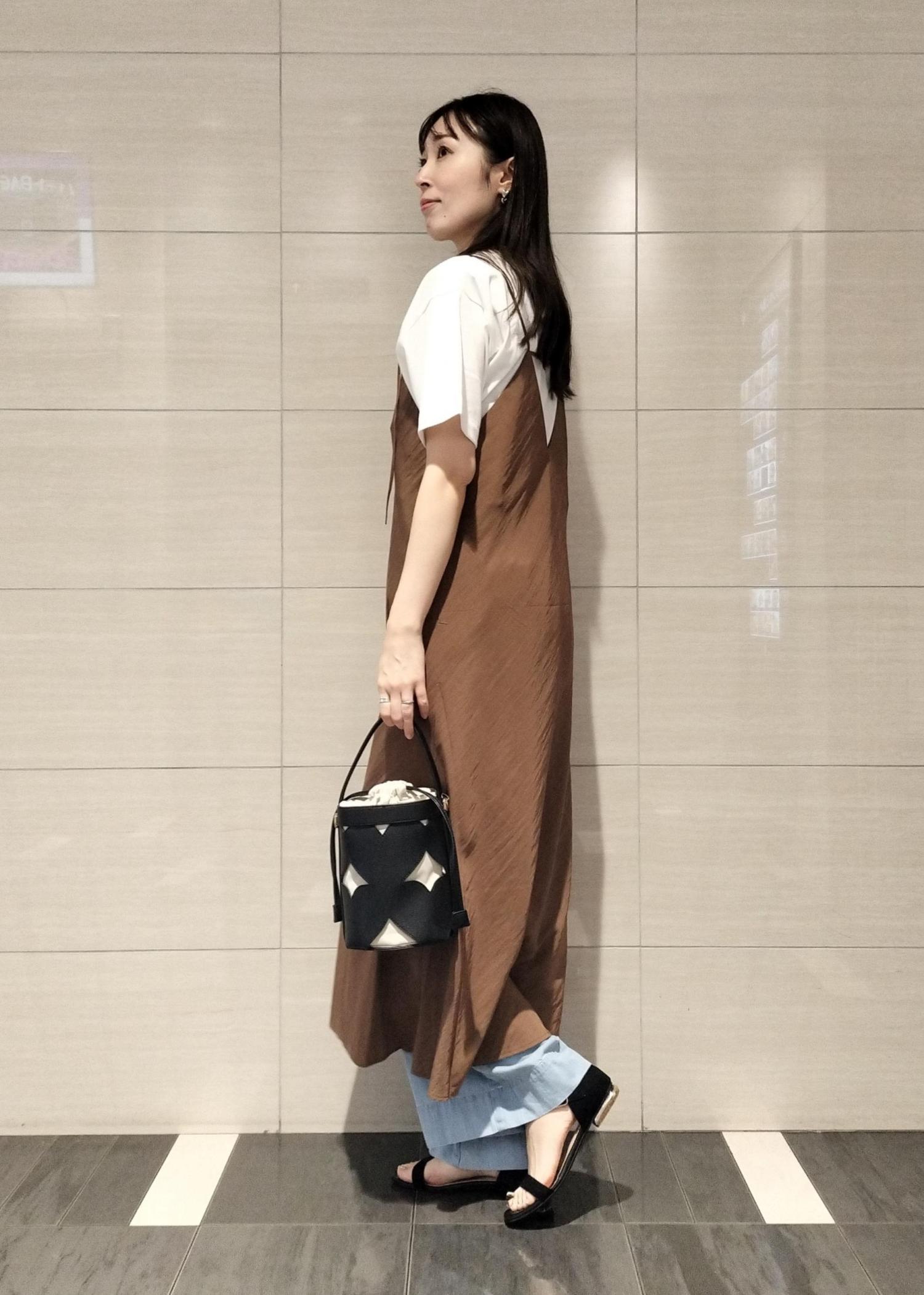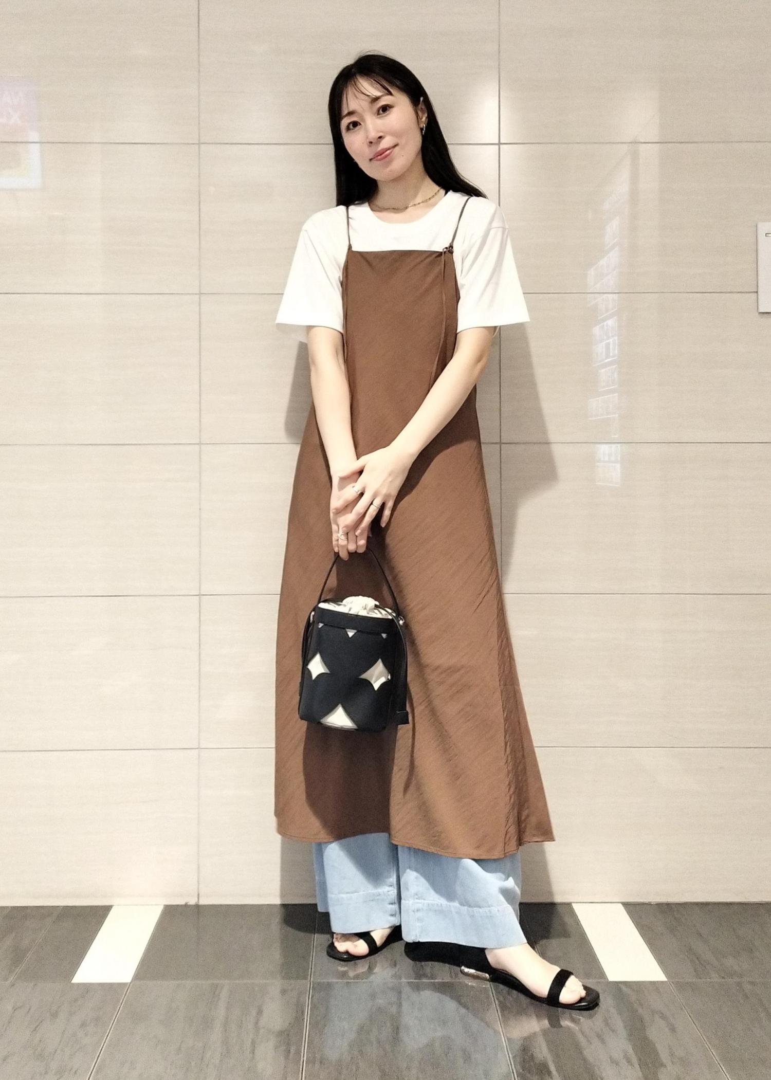 色々着回せるキャミワンピースが主役のお出かけコーデです♪Tシャツとデニムを重ねてカジュアルにしてみました♪楽ちんなワンピースは旅行などにもオススメです♪